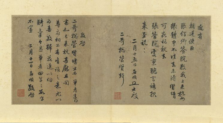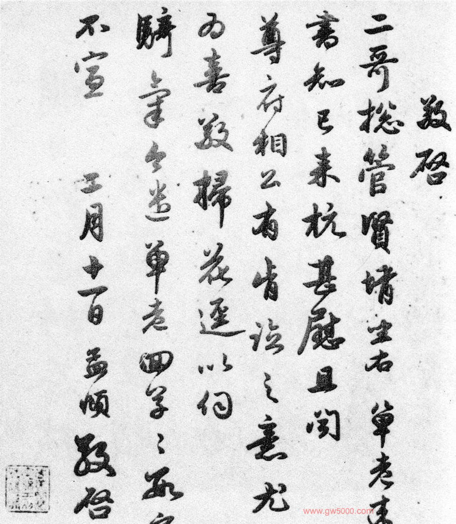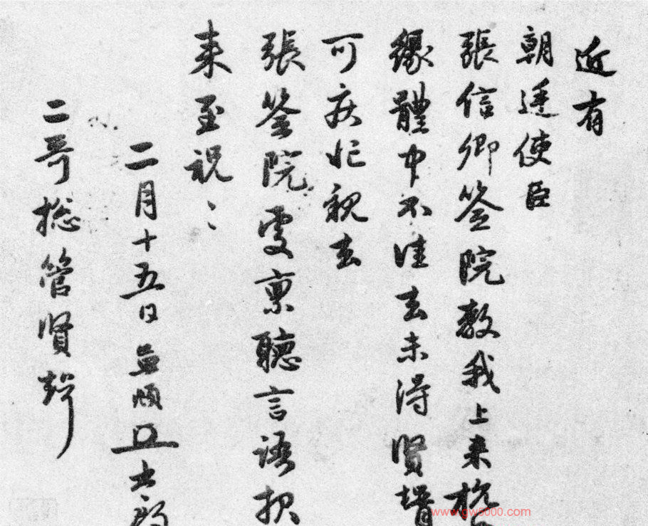 近有朝廷使臣张信卿签院。教我上来杭州。缘体中不佳。去未得。贤婿可疾忙亲去张签院处。禀听言语报来。至祝祝。二月十五日孟頫书致二哥总管贤声。