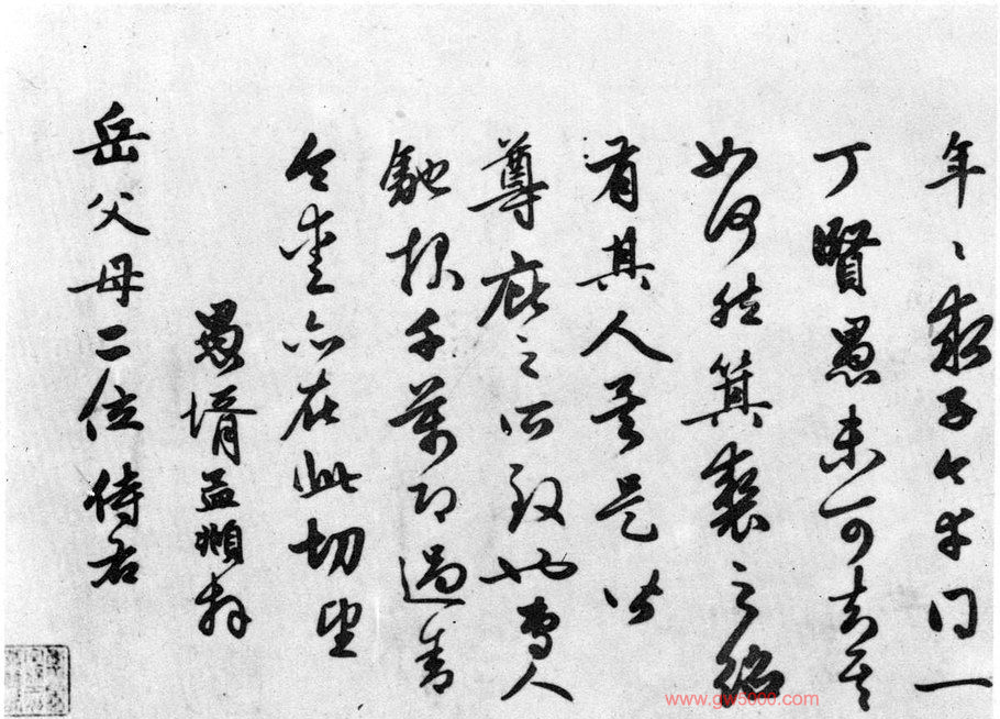 年年求子。今幸得一丁。贤愚未可知其如何。然箕裘之绍。有其人矣。是皆尊庇之所致也。专人驰报。千万即过舍。令爱亦在此切望。愚壻孟頫拜。岳父母二位侍右。