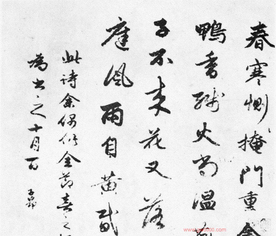 春寒恻恻掩门重。金鸭香残火尚温。燕子不来花又落。一庭风雨自黄昏。此诗余偶作。全节喜之。故为书之。十月一日子昂。