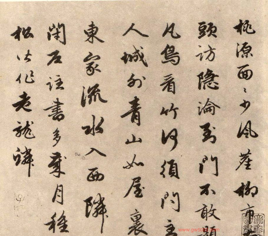 桃源面面少风尘。柳市南头访隐沦。到门不敢题凡鸟。看竹何须问主人。城外青山如屋里。东家流水入西隣。闭户注书多岁月。种松皆作老龙鳞。
