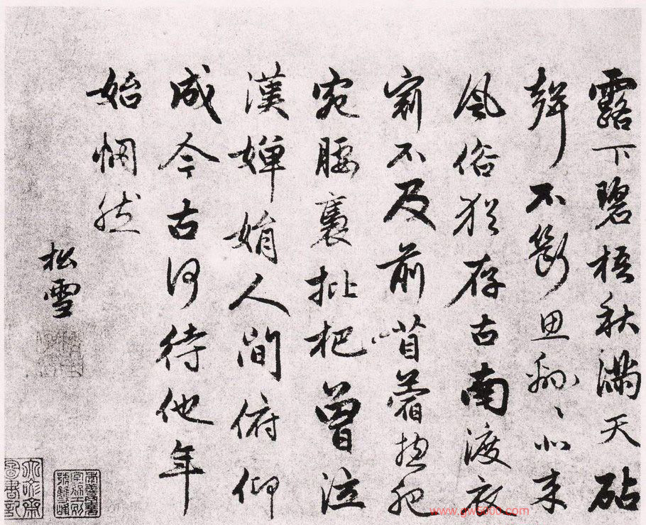 露下碧梧秋满天。砧声不断思绵绵。北来风俗犹存古。南渡衣冠不及前。苜蓿总肥宛腰褭。批杷曾泣汉蝉娟。人间俯仰成今古。何待他年始惘然。松雪。