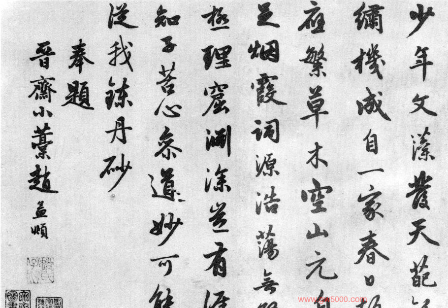 少年文藻发天葩。锦绣机成自一家。春日故庭繁草木。空出元自足烟霞。词源浩荡无终极。理窟渊深岂有涯。如子苦心参道妙。可能从我链丹砂。奉题晋斋小藳。赵孟頫。