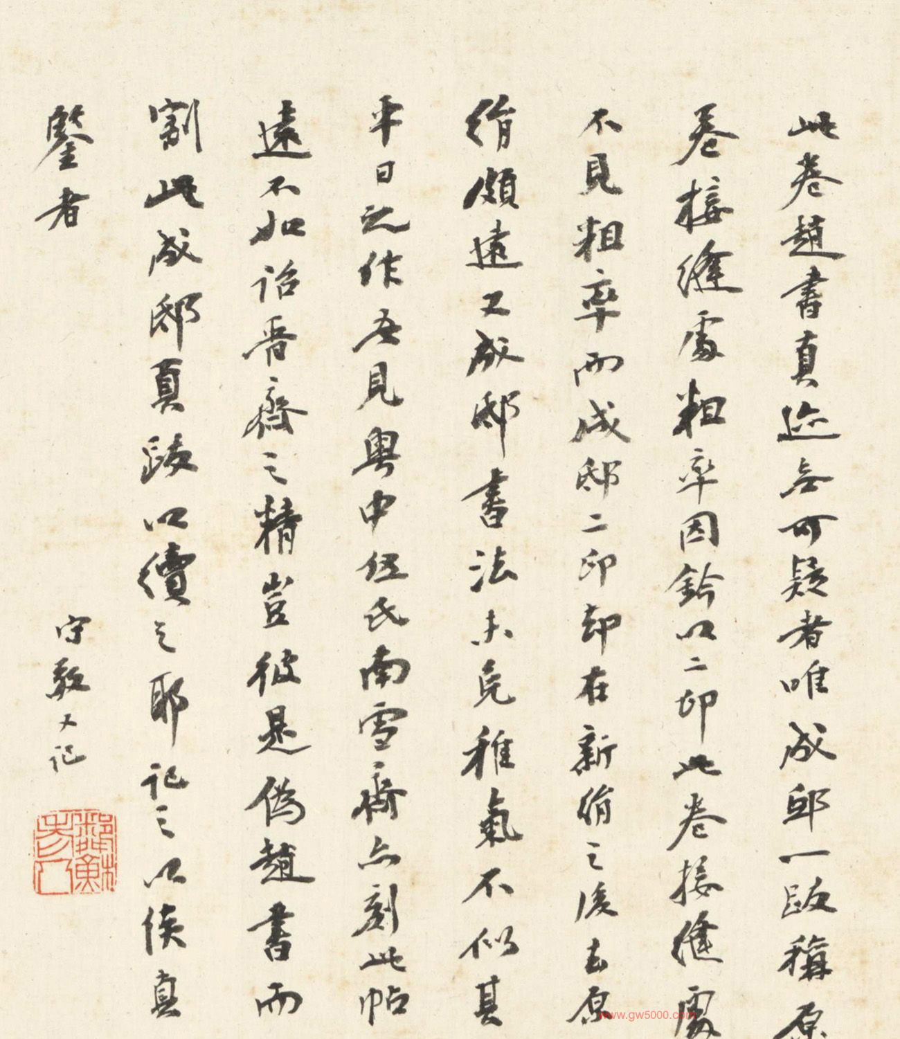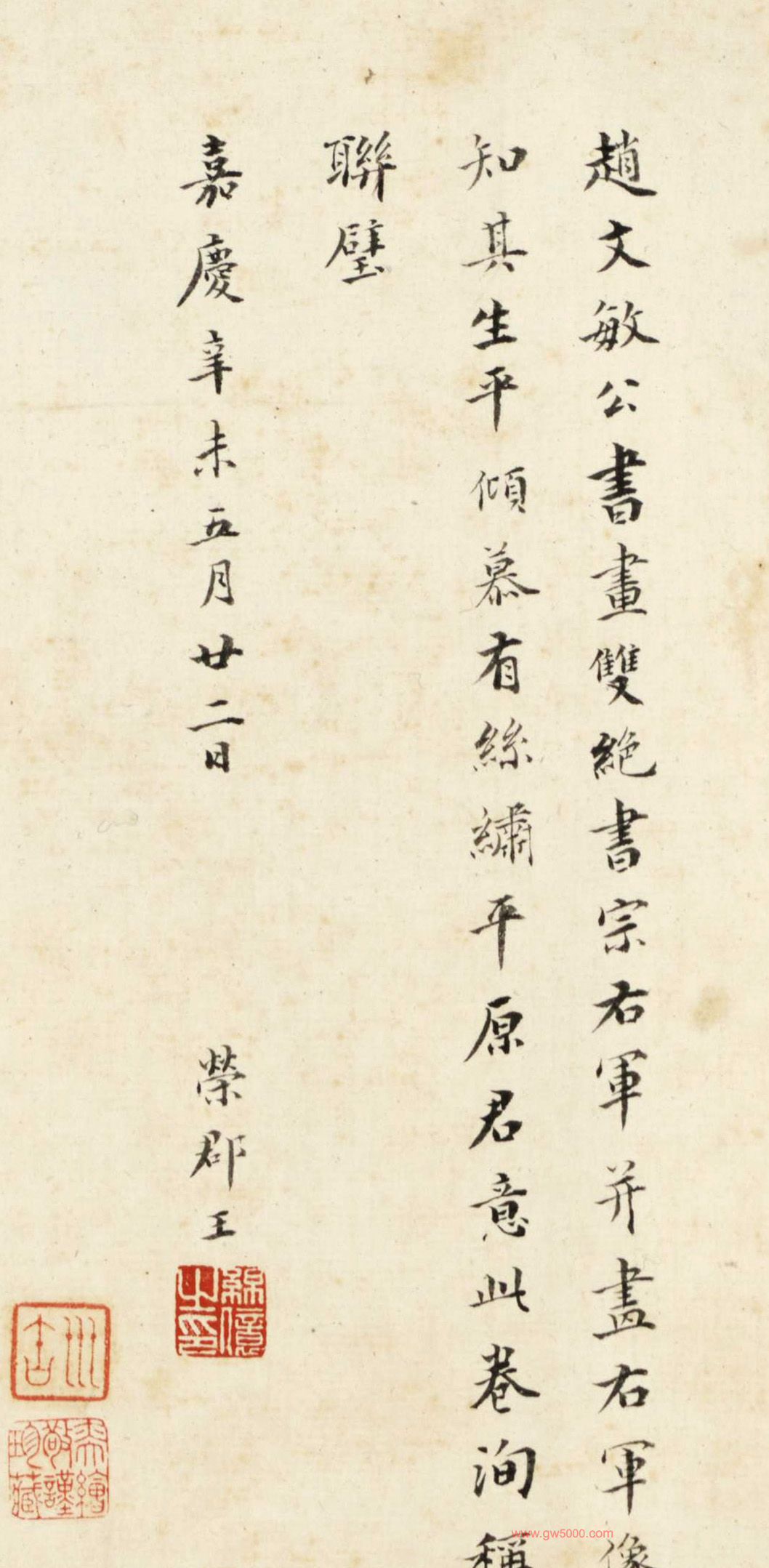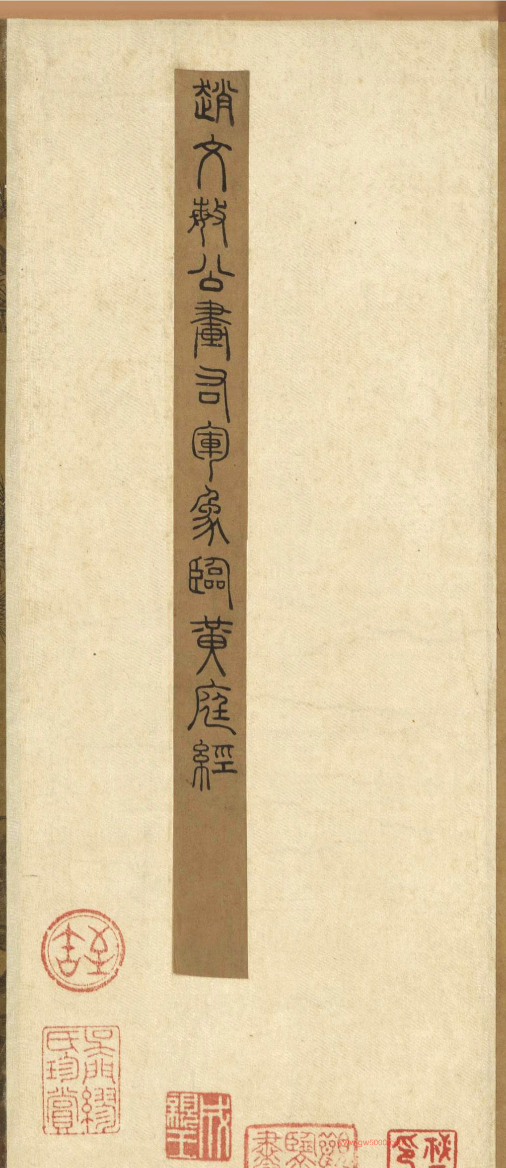 此卷卷首绘王羲之像,面部刻画简略,人物衣纹勾写乏力,后以楷书临写王羲之书《黄庭经》,点画柔弱,结体松散。经徐邦达先生鉴定,书画均无赵氏风貌,艺术水平较低,明显为赝品。究其年代,当是明代临仿之作,其末行后原有作者本款,后为造假者洗灭,钤印皆伪。