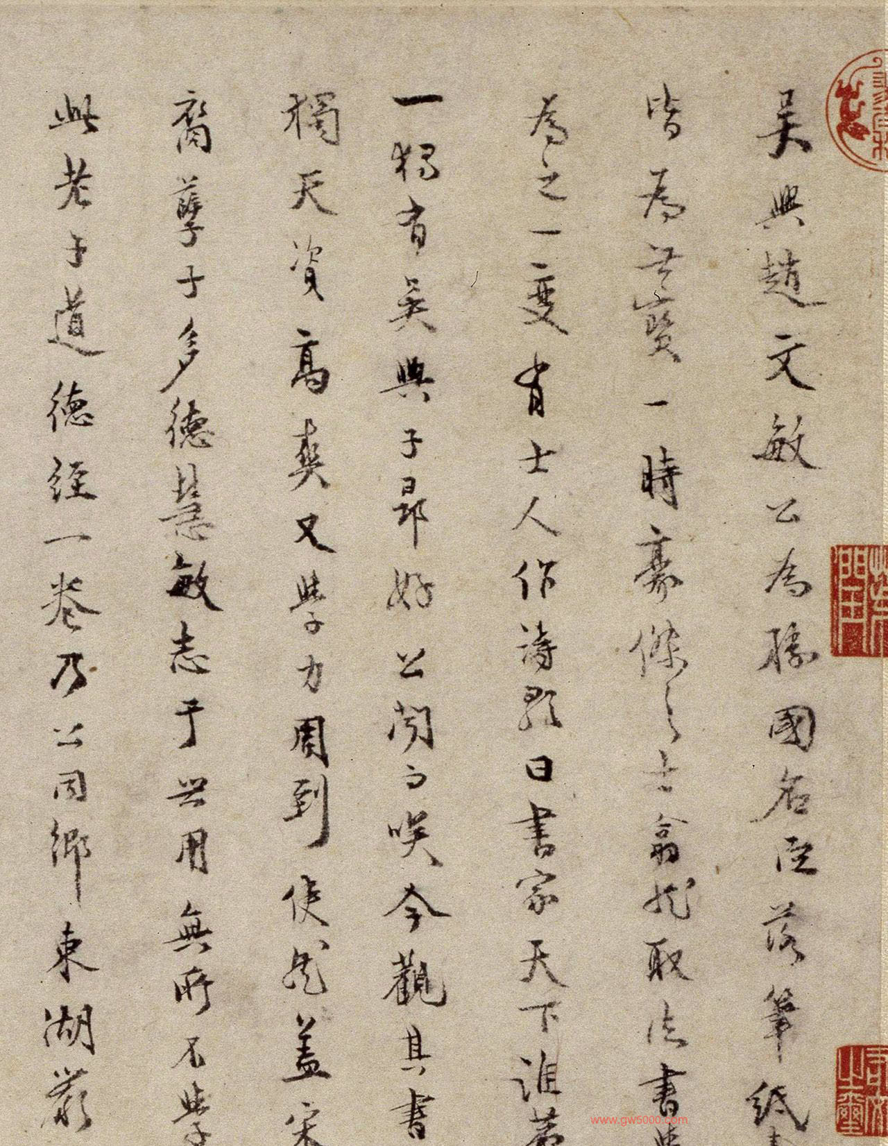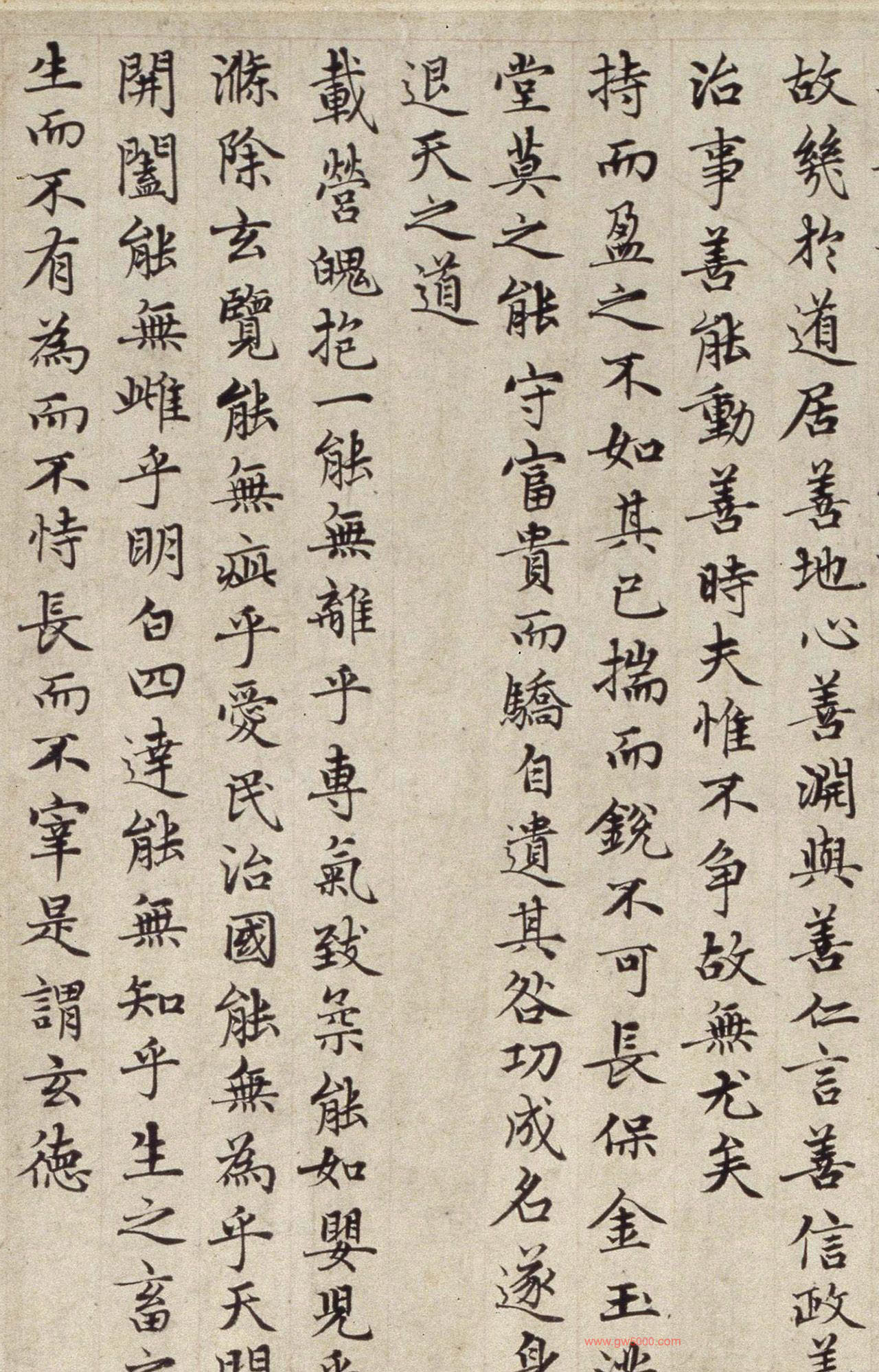 赵孟頫的小楷妙得唐人的结构精严,饰以晋人的点画姿媚,兼备刚健婀娜与虚和委婉。尤其是长篇书作,法度严谨,结体端稳,疏密相宜,自始至终气脉贯通,绝无迟涩板滞和局促拘谨之感。