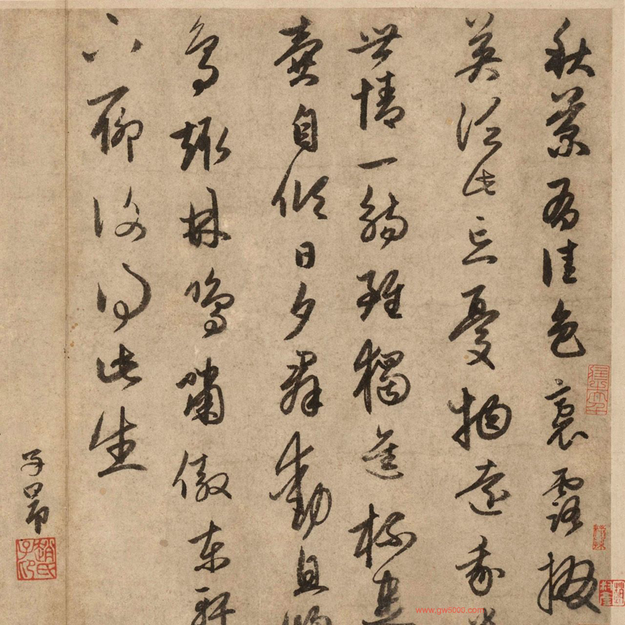 赵子昂书录陶渊明《饮酒二十首》诗之六,入《法书大观册》,款署“子昂”、钤“赵子昂氏” (朱文)印,帖后元代虞集隶书跋。此帖书法点画,使转尚可见二王书的形质性情,但又分明是自家书的遒逸劲媚风格。虽无年款,但其苍劲老到的笔法,已经展示了赵氏人书俱老的晚年书风。