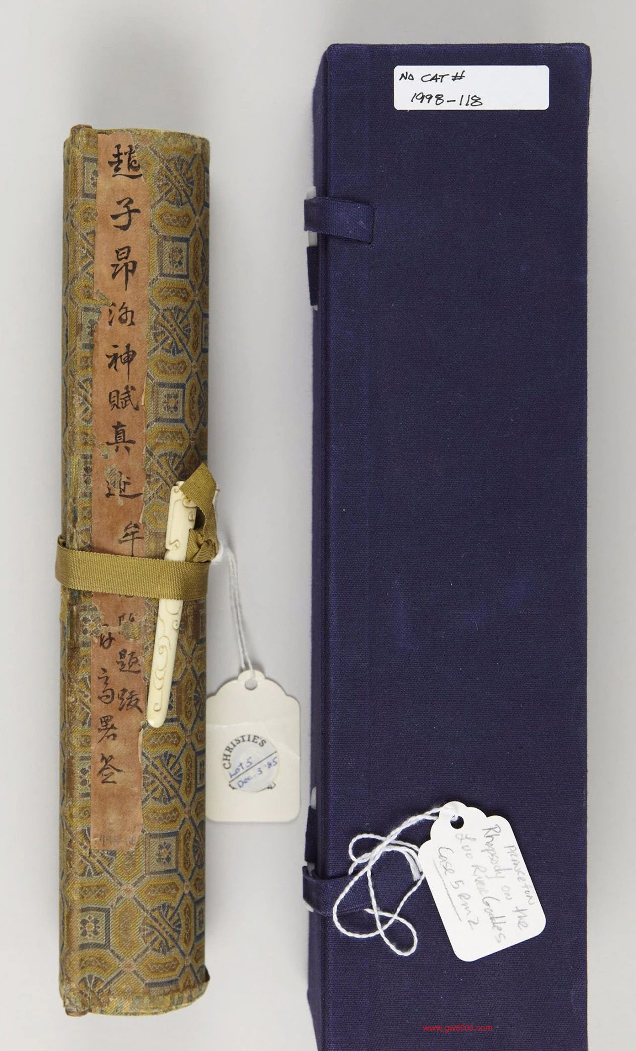 此卷原是国民党大元王世杰的旧藏。因王是武汉大学的首任校长,他去世后,立遗嘱其所藏捐与武汉大学。不过其后人显然没有遵守,在他去世不久,这件作品就上了拍卖,今天我们还能看到它身上挂着带有“CHRISTIE'S”(佳士得)标记的牌子。当时有人竞标夺得,后捐给了普林斯顿大学。
