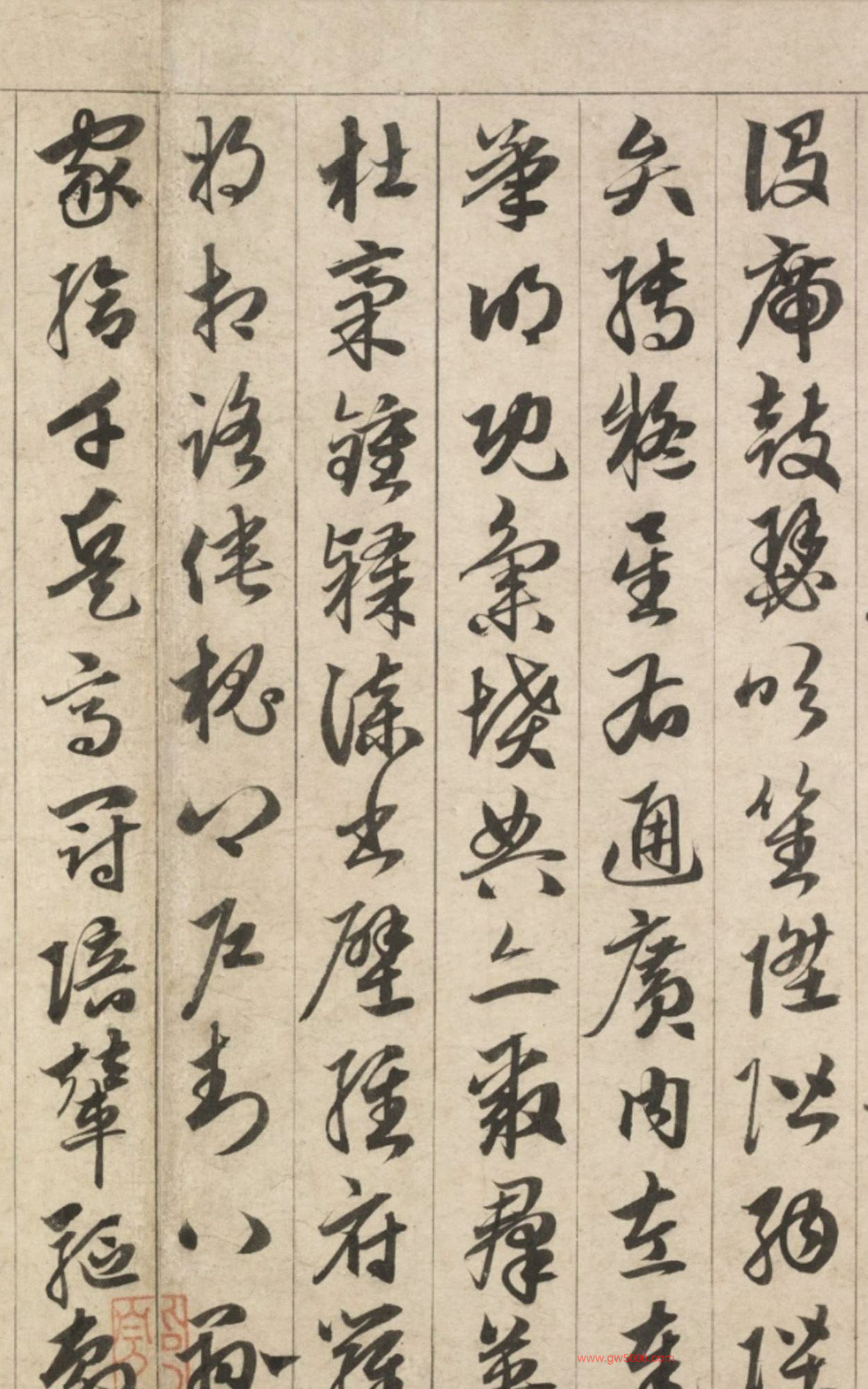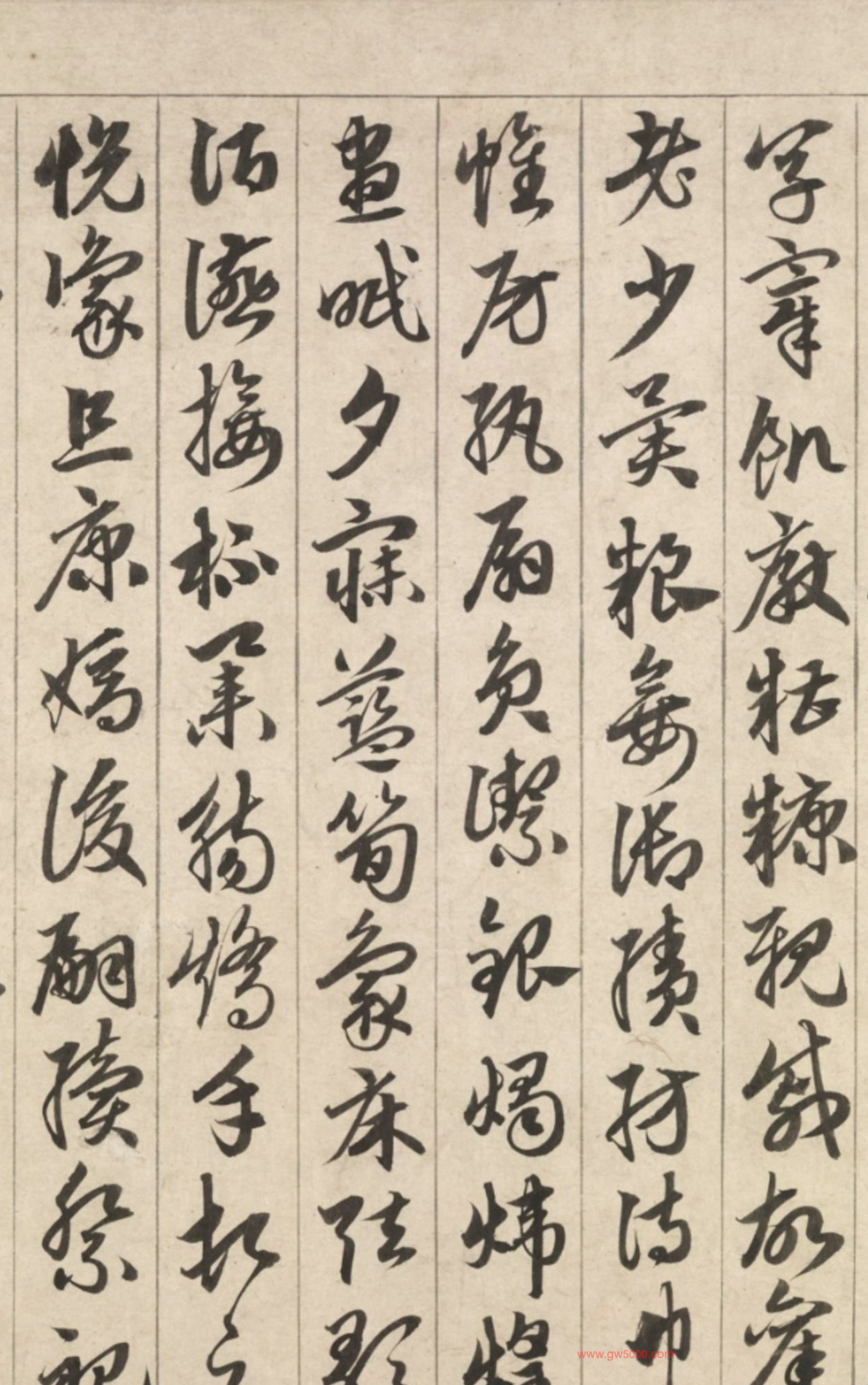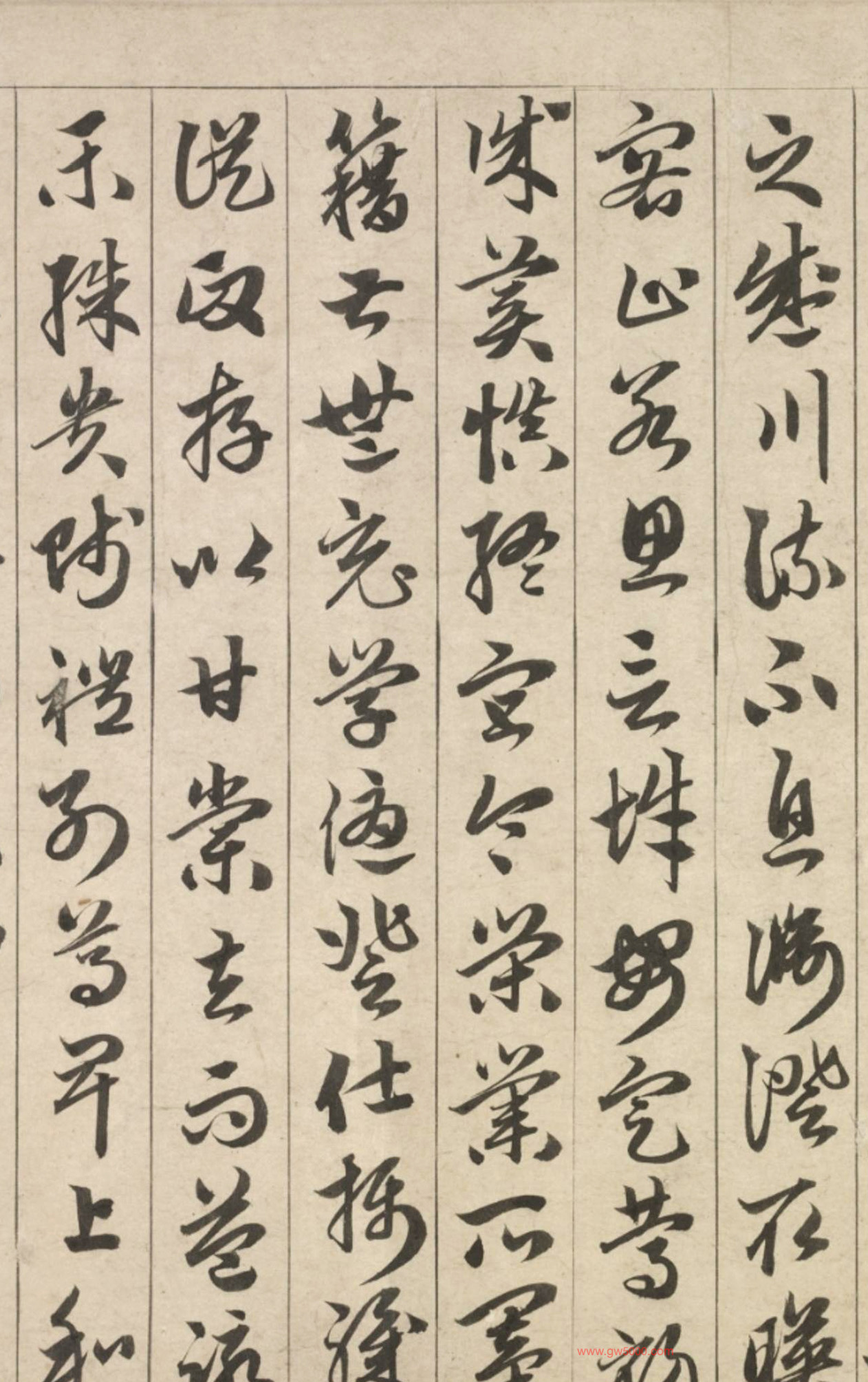 释文:草书千文。梁员外散骑侍郎周兴嗣次韵。天地玄黄,宇宙洪荒。日月盈昃,辰宿列张。寒来暑往,秋收冬藏。闰馀成岁,律吕调阳。云腾致雨,露结为霜。金生丽水,玉出昆冈。剑号巨阙,珠称夜光。果珍李柰,菜重芥姜。海咸河淡,鳞潜羽翔。龙师火帝,鸟官人皇。始制文字,乃服衣裳。推位让国,有虞陶唐。吊民伐罪,周发殷汤。坐朝问道,垂拱平章。爱育黎首,臣伏戎羌。遐迩壹体,率宾归王。鸣凤在树,白驹食场。化被草木,赖及万方。盖此身发,四大五常。恭惟鞠养,岂敢毁伤。女慕贞絜,男效才良。知过必改,得能莫忘。罔谈彼短,靡恃己长。信使可覆,器欲难量。墨悲丝染,诗赞羔羊。景行维贤,剋念作圣。德建名立,形端表正。空谷传声,虚堂习听。祸因恶积,福缘善庆。尺璧非宝,寸阴是競。资父事君,曰严与敬。孝当竭力,忠则尽命。临深履薄,夙兴温凊。似兰斯馨,如松之盛。川流不息,渊澄取映。容止若思,言辞安定。笃初诚美,慎终宜令。荣业所基,籍甚无竟。学优登仕,摄职从政。存以甘棠,去而益咏。乐殊贵贱,礼别尊卑。上和下睦,夫唱妇随。外受傅训,入奉母仪。诸姑伯叔,犹子比儿。孔怀兄弟,同气连枝。交友投分,切磨箴规。仁慈隐恻,造次弗离。节义廉退,颠沛匪亏。性静情逸,心动神疲。守真志满,逐物意移。坚持雅操,好爵自縻。都邑华夏,东西二京。背芒面洛,浮渭据泾。宫殿磐郁,楼观飞惊。图写禽兽,画彩仙灵。丙舍傍启,甲帐对楹。肆筵设席,鼓瑟吹笙。升阶纳陛,弁转疑星。右通广内,左达承明。既集坟典,亦聚群英。杜稿钟隶,漆书壁经。府罗将相,路侠槐卿。户封八县,家给千兵。高冠陪辇,驱毂振缨。世禄侈富,车驾肥轻。荣功茂实,勒碑刻铭。磻溪伊尹,佐时阿衡。奄宅曲阜,微旦孰营。桓公匡合,济弱扶倾。绮回汉惠,说感武丁。俊义密勿,多士寔宁。晋楚更霸,赵魏困横。假途灭虢,践土会盟。何遵约法,韩弊烦刑。起翦颇牧,用军最精。宣威沙漠,驰誉丹青。九州禹迹,百郡秦并。岳宗恒岱,禅主云亭。雁门紫塞,鸡田赤城。昆池碣石,钜野洞庭。旷远绵邈,岩岫杳冥。治本于农,务兹稼穑。俶载南亩,我艺黍稷。税熟贡新,劝赏黜陟。孟轲敦素,史鱼秉直。庶几中庸,劳谦谨敕。聆音察理,鉴貌辨色。贻厥嘉猷,勉其祗植。省躬讥诫,宠增抗极。殆辱近耻,林皋幸即。两疏见机,解组谁逼。索居闲处,沉默寂寥。求古寻论,散虑逍遥。欣奏累遣,戚谢欢招。渠荷的历,园莽抽条。枇杷晚翠,梧桐早凋。陈根委翳,落叶飘颻。游鹍独运,凌摩绛霄。耽读玩市,寓目囊箱。易輶攸畏,属耳垣墙。具膳湌饭,适口充肠。饱饫烹宰,饥厌糟糠。亲戚故旧,老少异粮。妾御绩纺,侍巾帷房。纨扇员洁,银烛炜煌。昼眠夕寐,蓝笋象床。弦歌酒讌,接杯举殇。矫手顿足,悦豫且康。嫡后嗣续,祭祀蒸尝。稽颡再拜,悚惧恐惶。笺牒简要,顾答审详。骸垢想浴,执热愿凉。驴骡犊特,骇跃超骧。诛斩贼盗,捕获叛亡。布射辽丸,嵇琴阮啸。恬笔伦纸,钧巧任钓。释纷利俗,并皆佳妙。毛施淑姿,工嚬妍笑。年矢每催,羲晖朗曜。机璇悬斡,晦魄环照。指薪修祜,永绥吉劭。矩步引领,俯仰廊庙。束带矜庄,徘徊瞻眺。孤陋寡闻,愚蒙等诮。谓语助者,焉哉乎也。子昂。