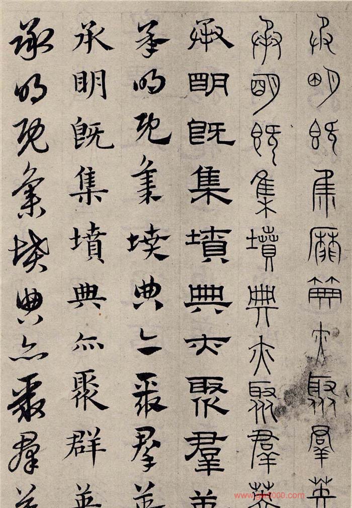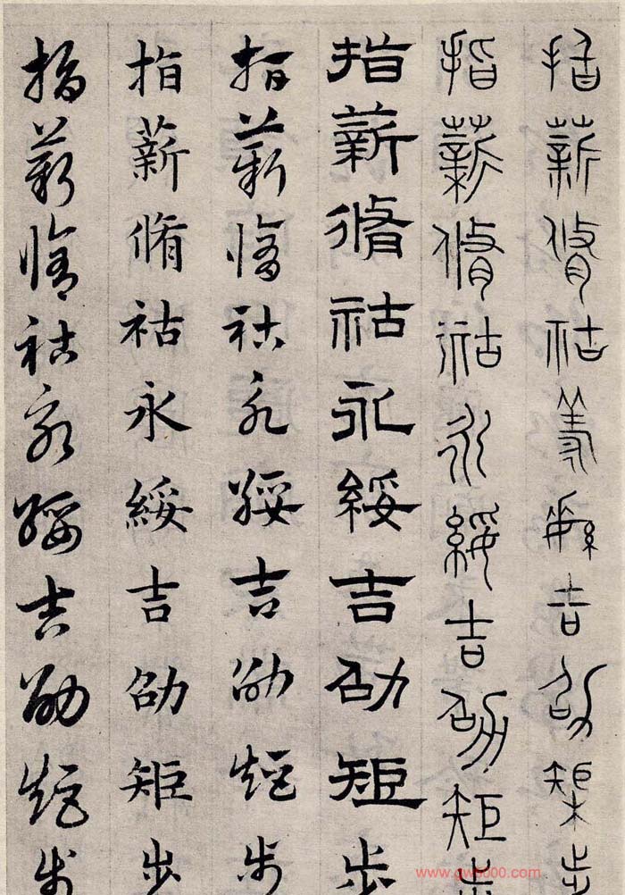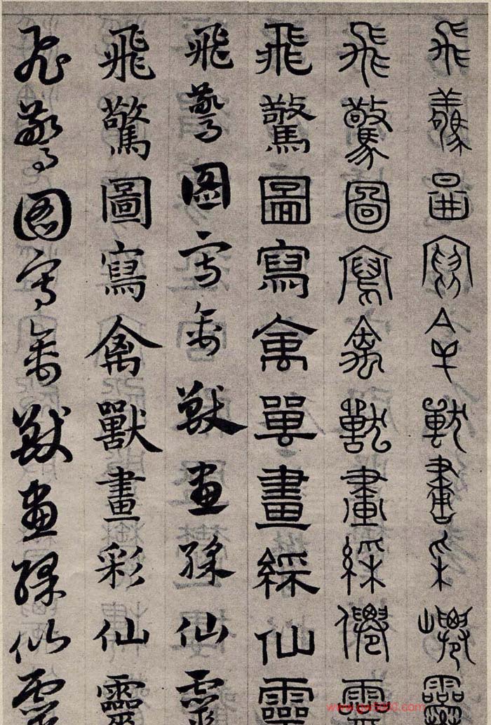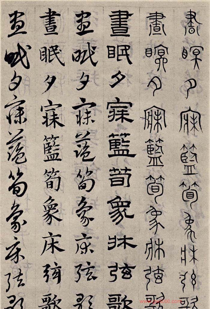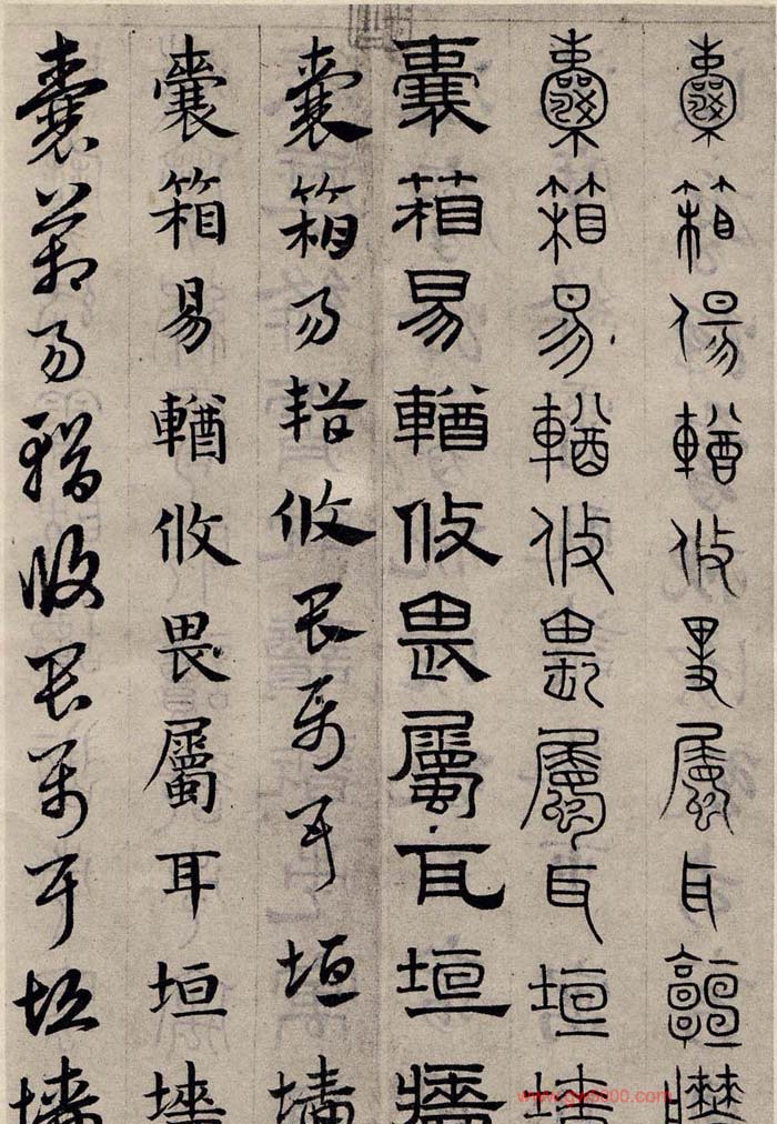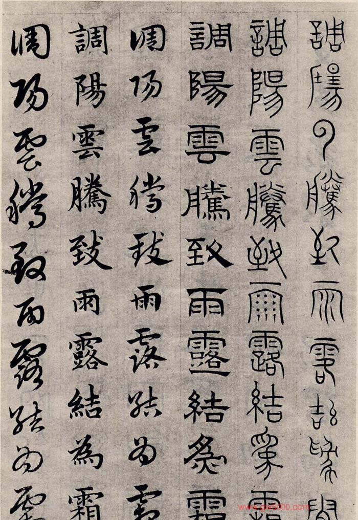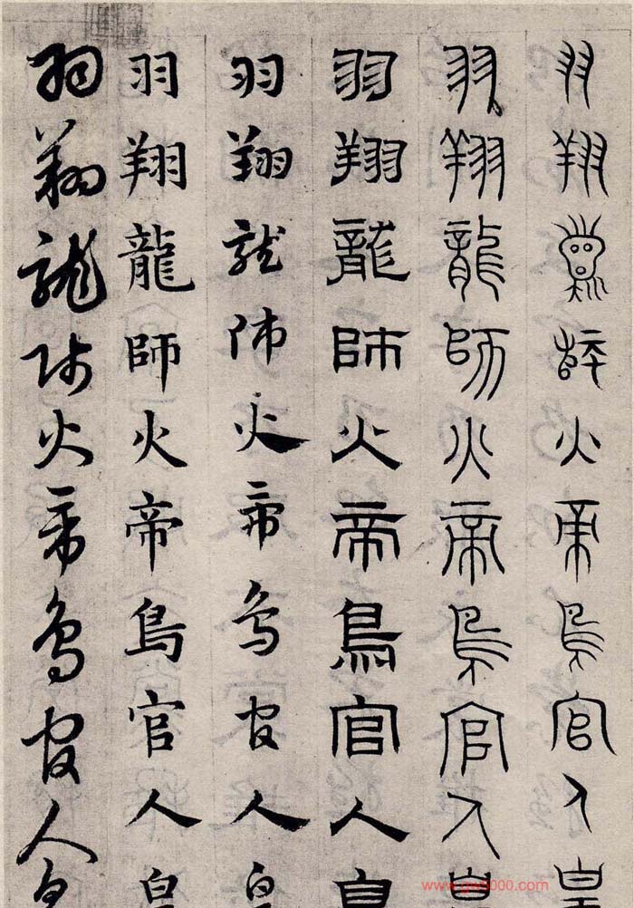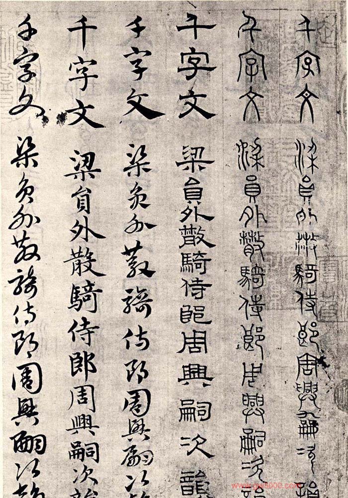 此卷赵孟頫《六体千字文》,分别作古篆、小篆、隶书、章草、楷书、今草六体。徐邦达先生《古书画伪讹考辨》记此卷“篆书尚平正少疵,草、楷诸体,结体既不稳,用笔更见轻弱光嫩,全无一点赵氏晚年书风气。只末后小楷款书还得到五六成貌似,当然必非真迹。