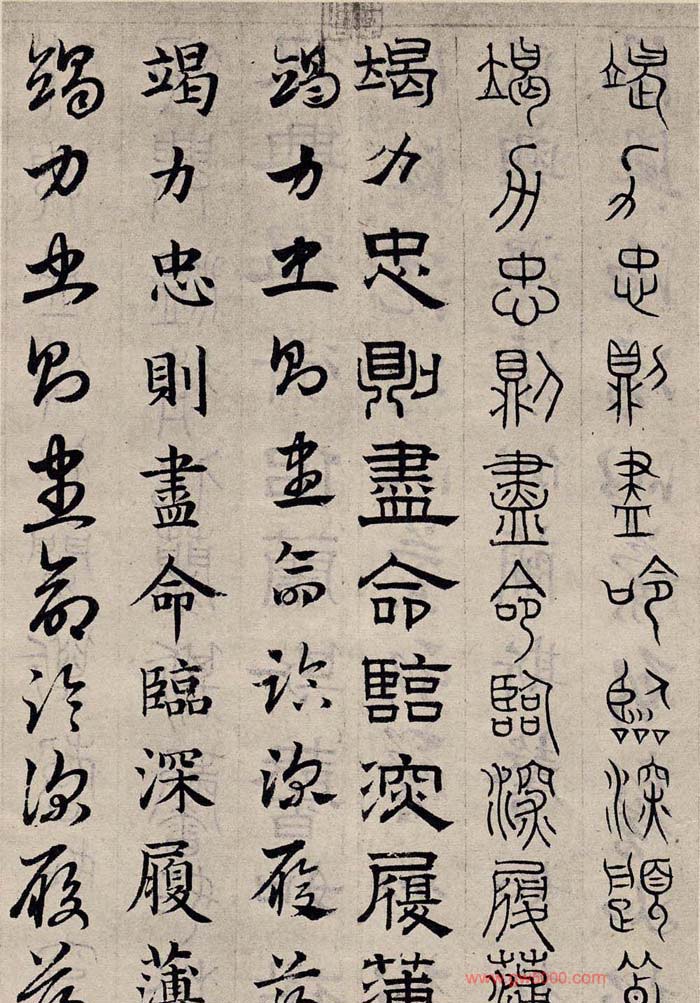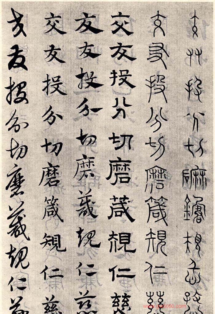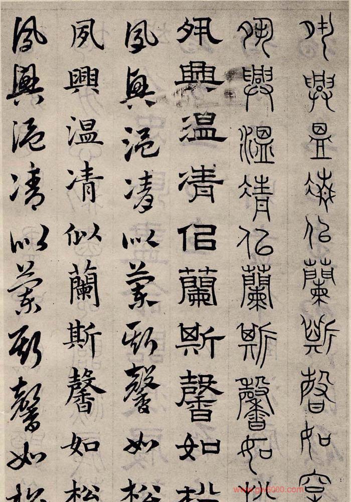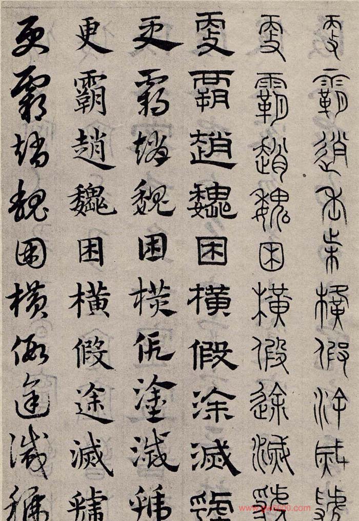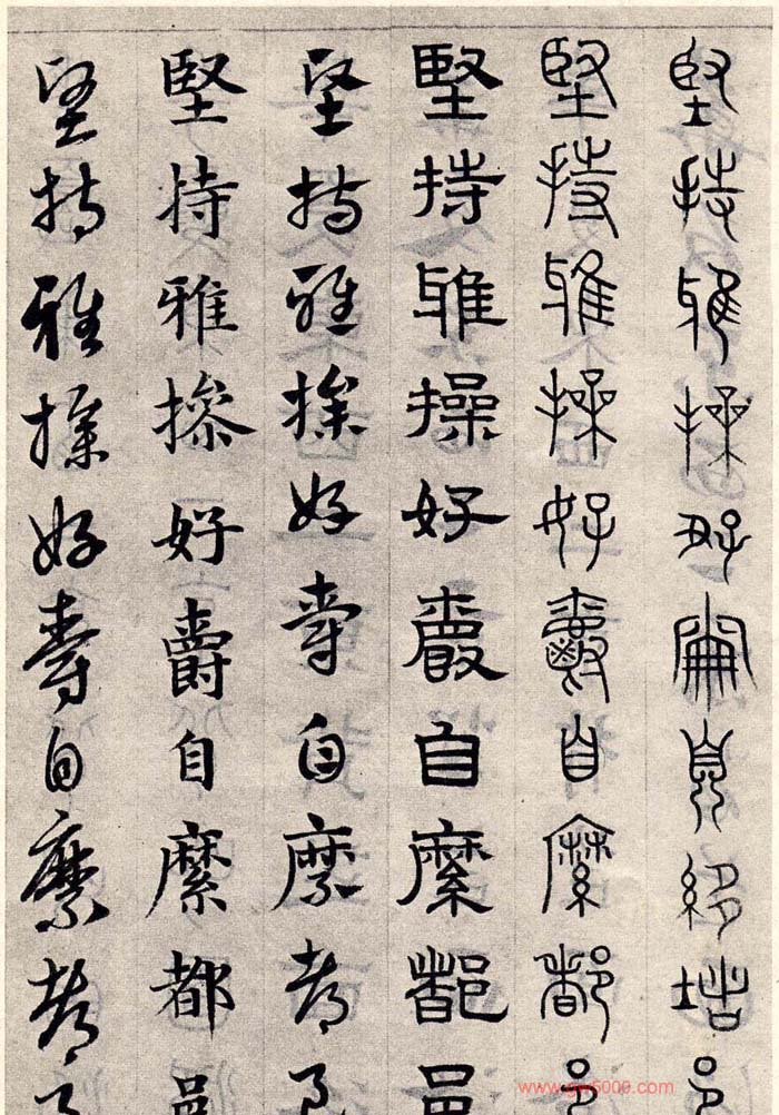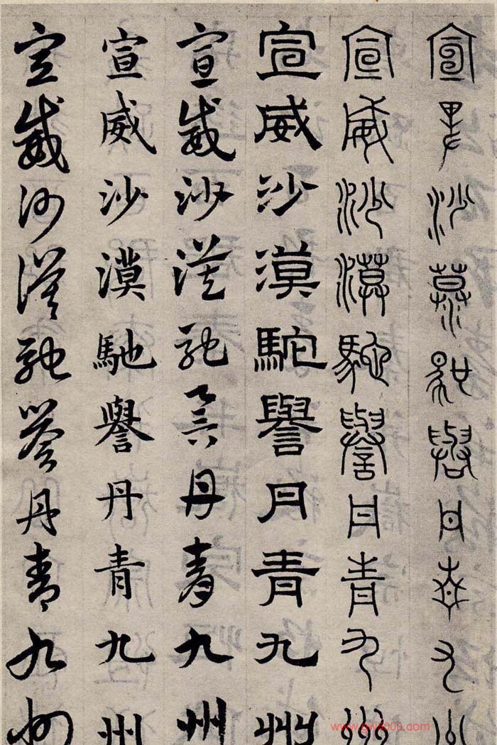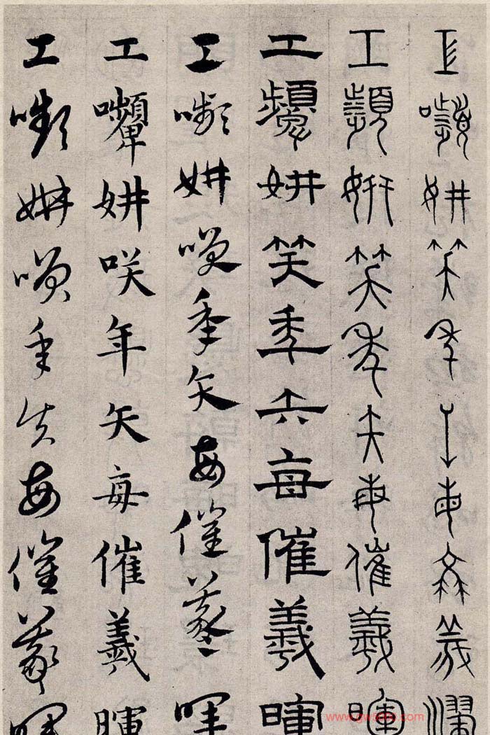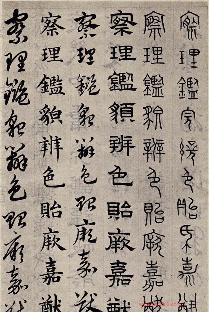 此卷赵孟頫《六体千字文》,分别作古篆、小篆、隶书、章草、楷书、今草六体。徐邦达先生《古书画伪讹考辨》记此卷“篆书尚平正少疵,草、楷诸体,结体既不稳,用笔更见轻弱光嫩,全无一点赵氏晚年书风气。只末后小楷款书还得到五六成貌似,当然必非真迹。