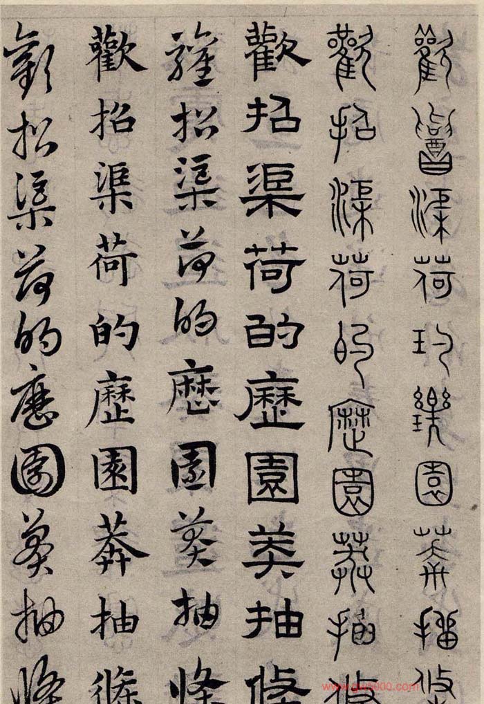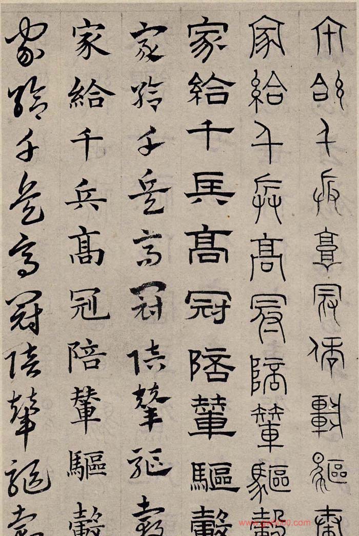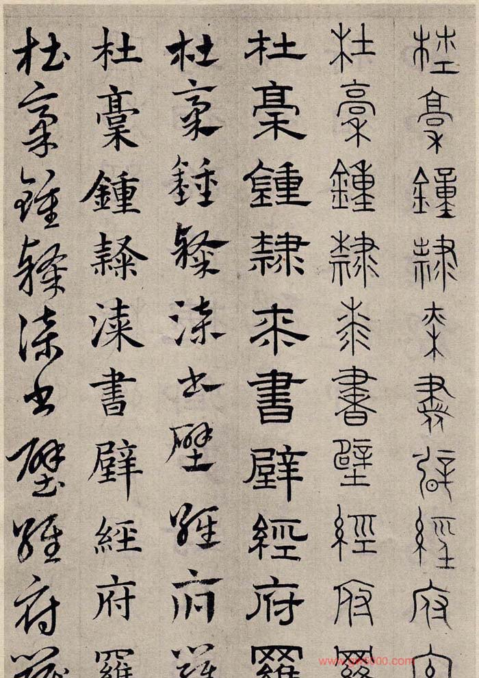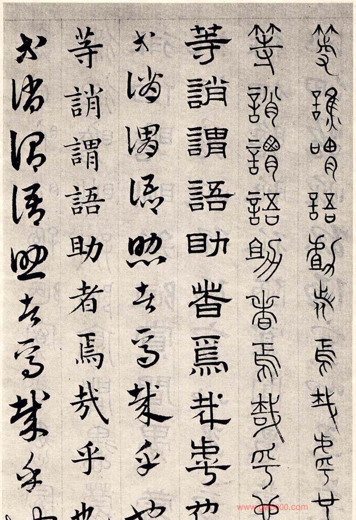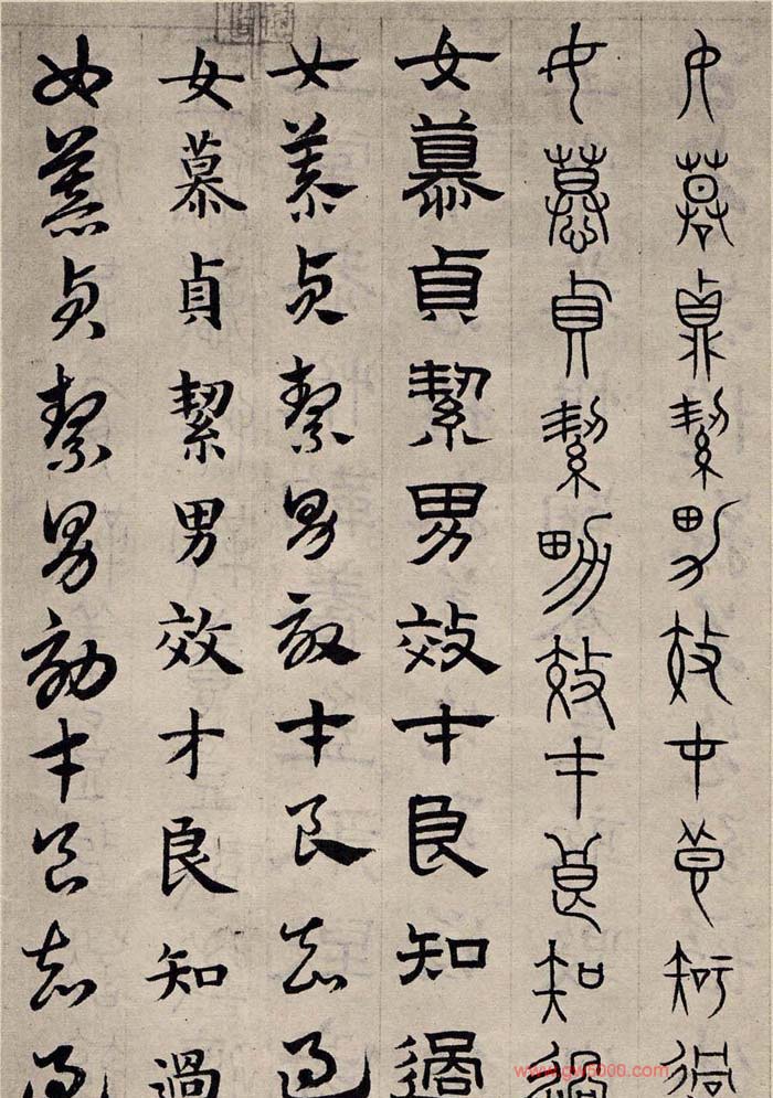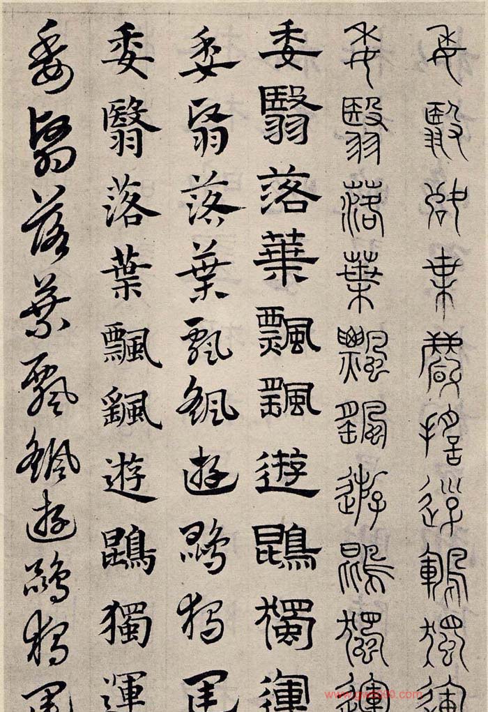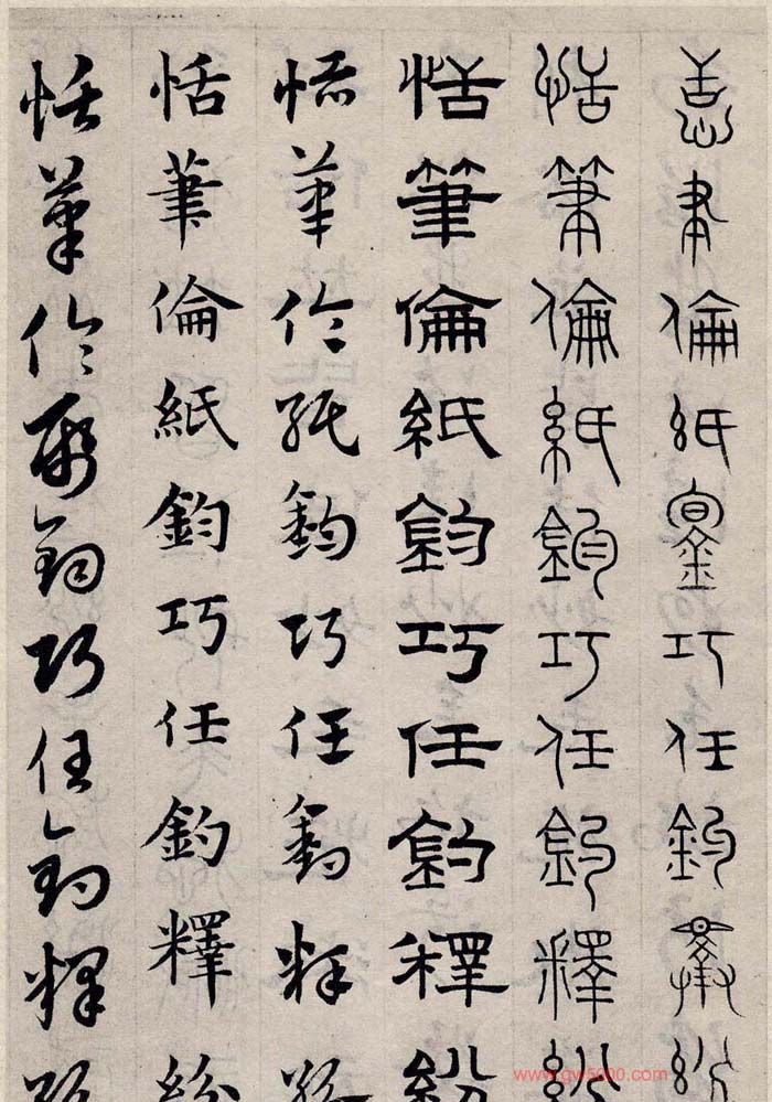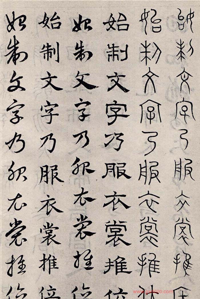 此卷赵孟頫《六体千字文》,分别作古篆、小篆、隶书、章草、楷书、今草六体。徐邦达先生《古书画伪讹考辨》记此卷“篆书尚平正少疵,草、楷诸体,结体既不稳,用笔更见轻弱光嫩,全无一点赵氏晚年书风气。只末后小楷款书还得到五六成貌似,当然必非真迹。