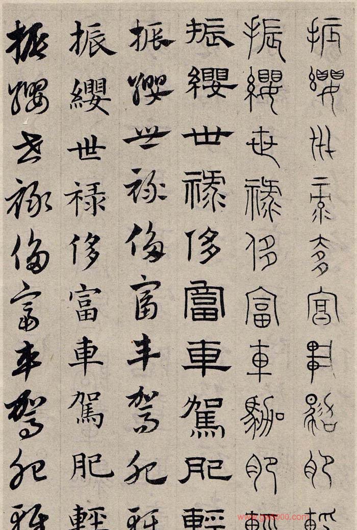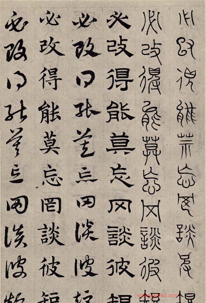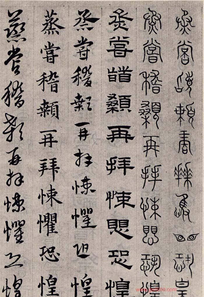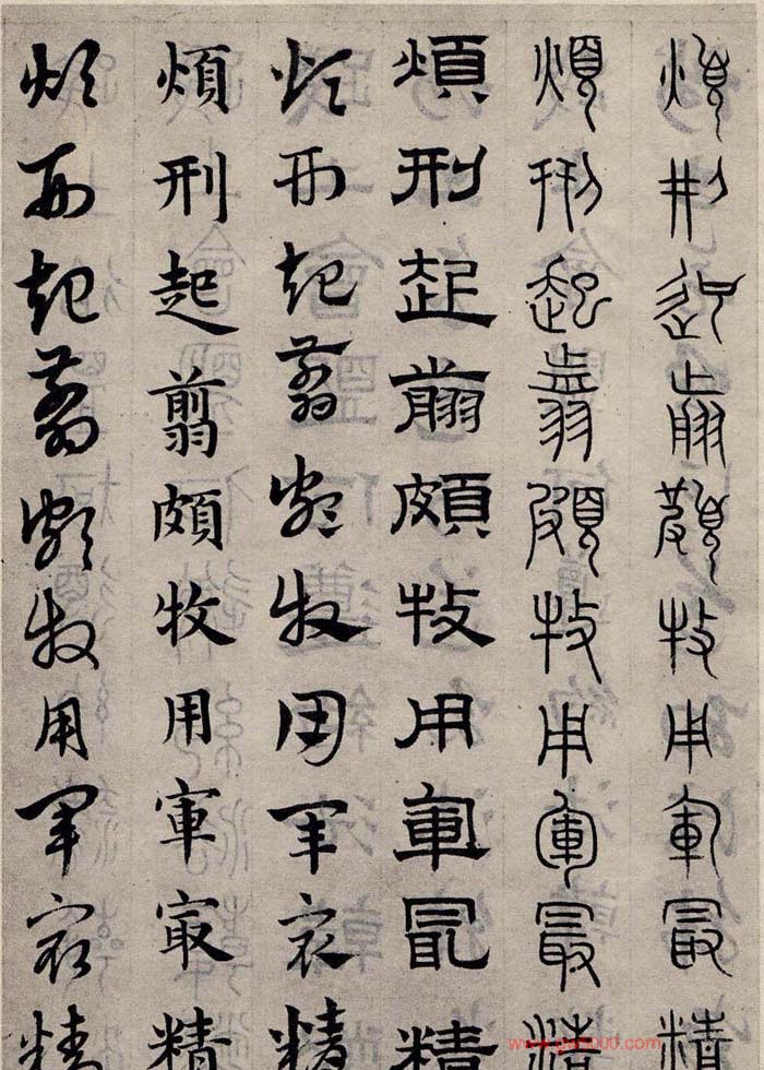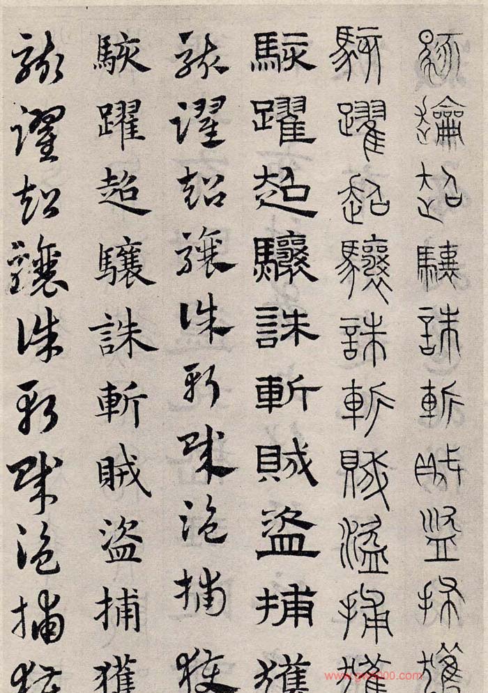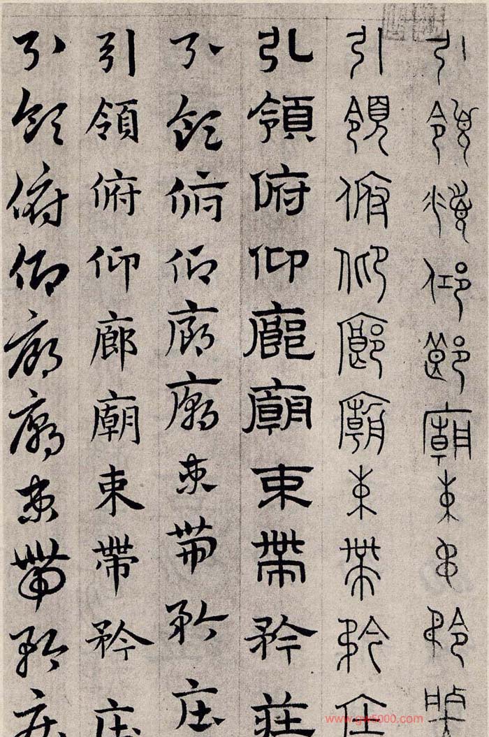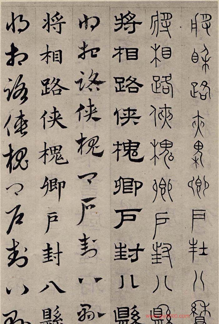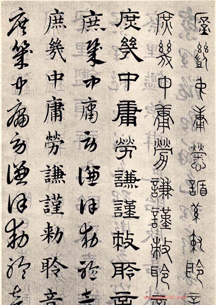 此卷赵孟頫《六体千字文》,分别作古篆、小篆、隶书、章草、楷书、今草六体。徐邦达先生《古书画伪讹考辨》记此卷“篆书尚平正少疵,草、楷诸体,结体既不稳,用笔更见轻弱光嫩,全无一点赵氏晚年书风气。只末后小楷款书还得到五六成貌似,当然必非真迹。