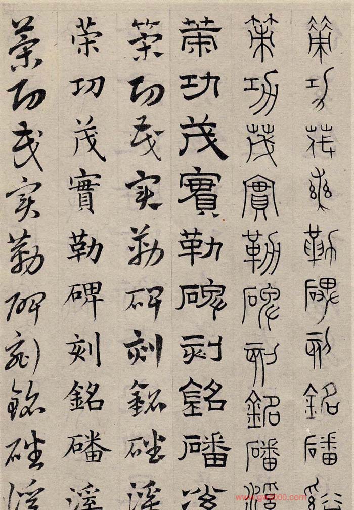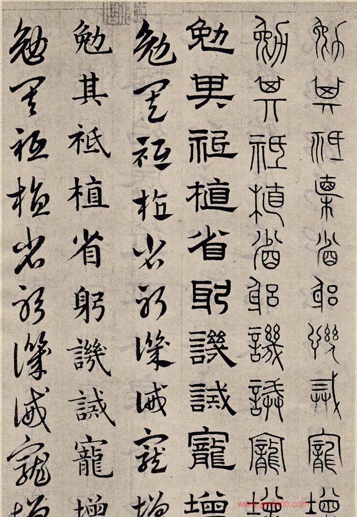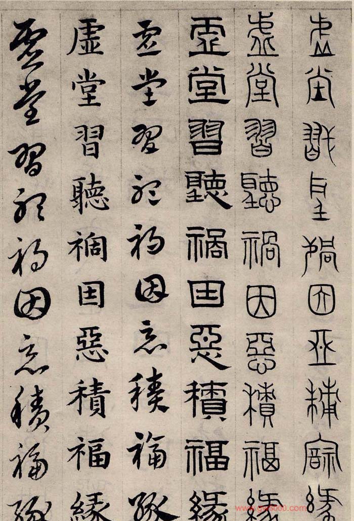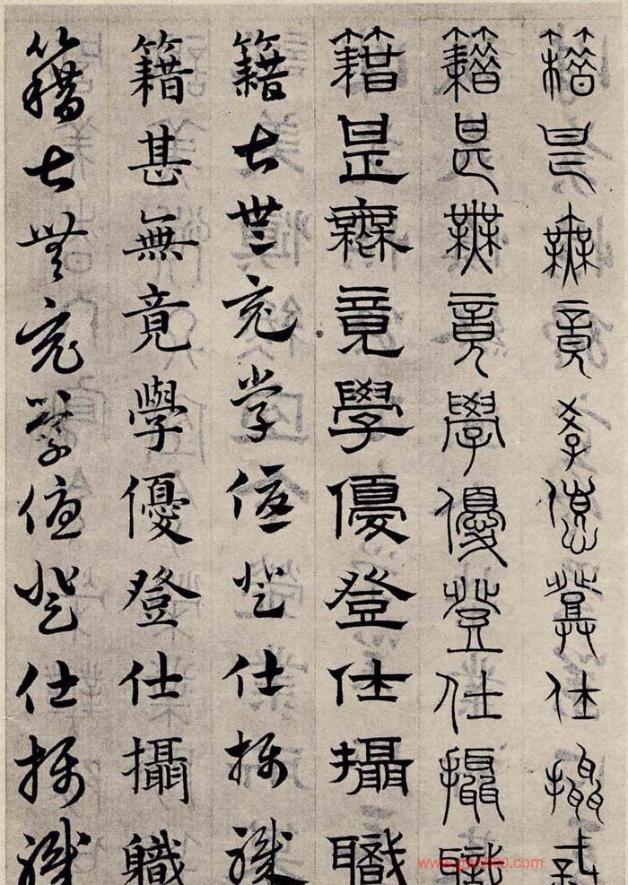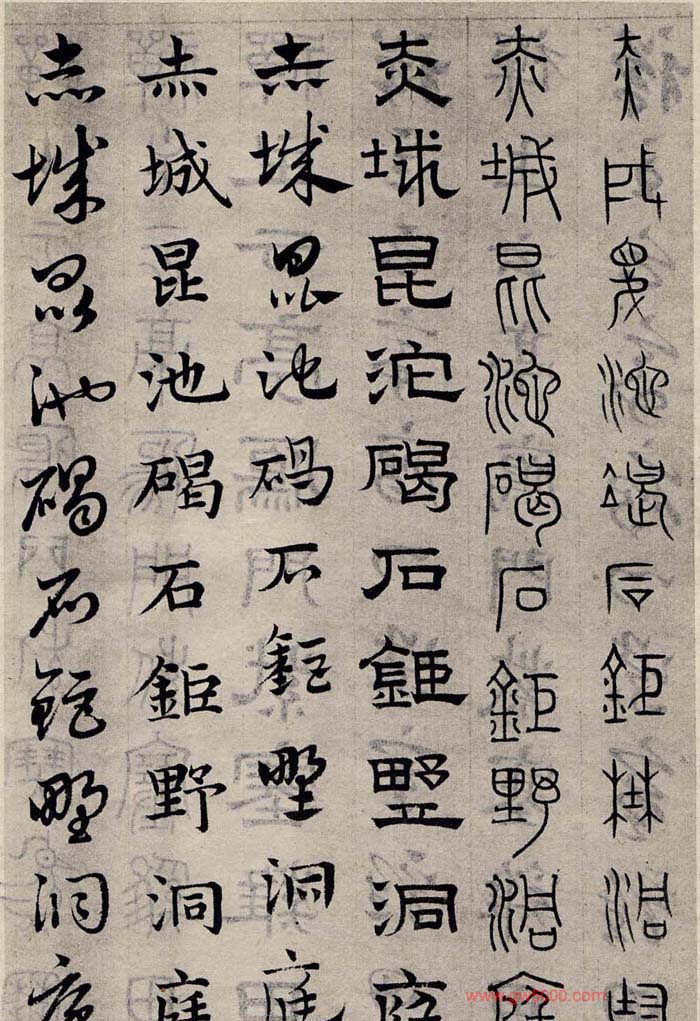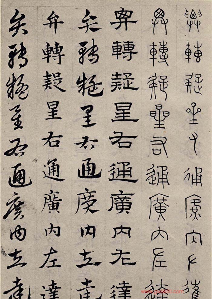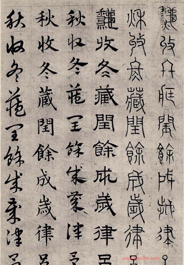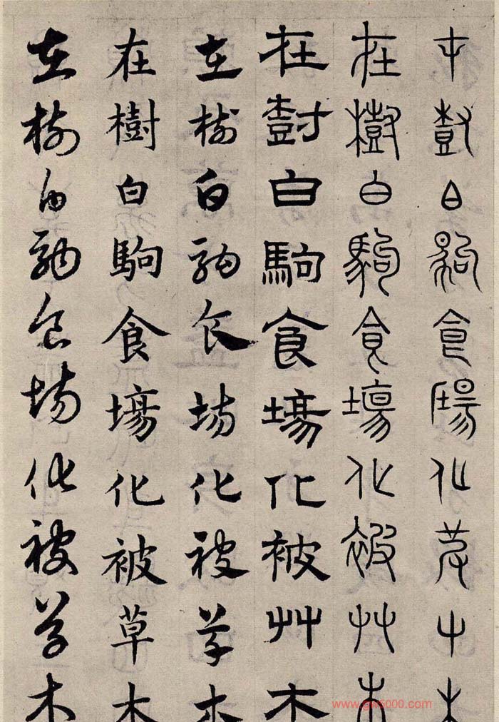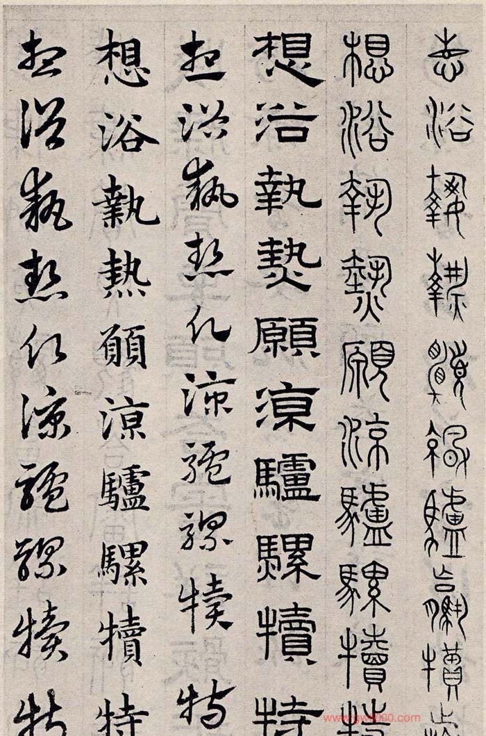 此卷赵孟頫《六体千字文》,分别作古篆、小篆、隶书、章草、楷书、今草六体。徐邦达先生《古书画伪讹考辨》记此卷“篆书尚平正少疵,草、楷诸体,结体既不稳,用笔更见轻弱光嫩,全无一点赵氏晚年书风气。只末后小楷款书还得到五六成貌似,当然必非真迹。