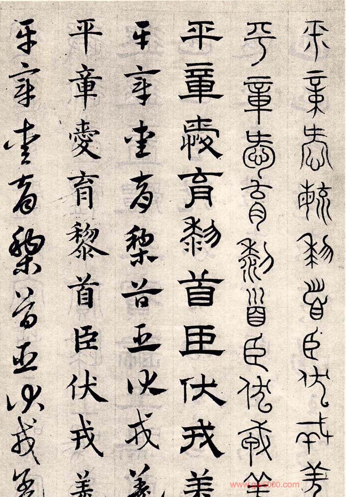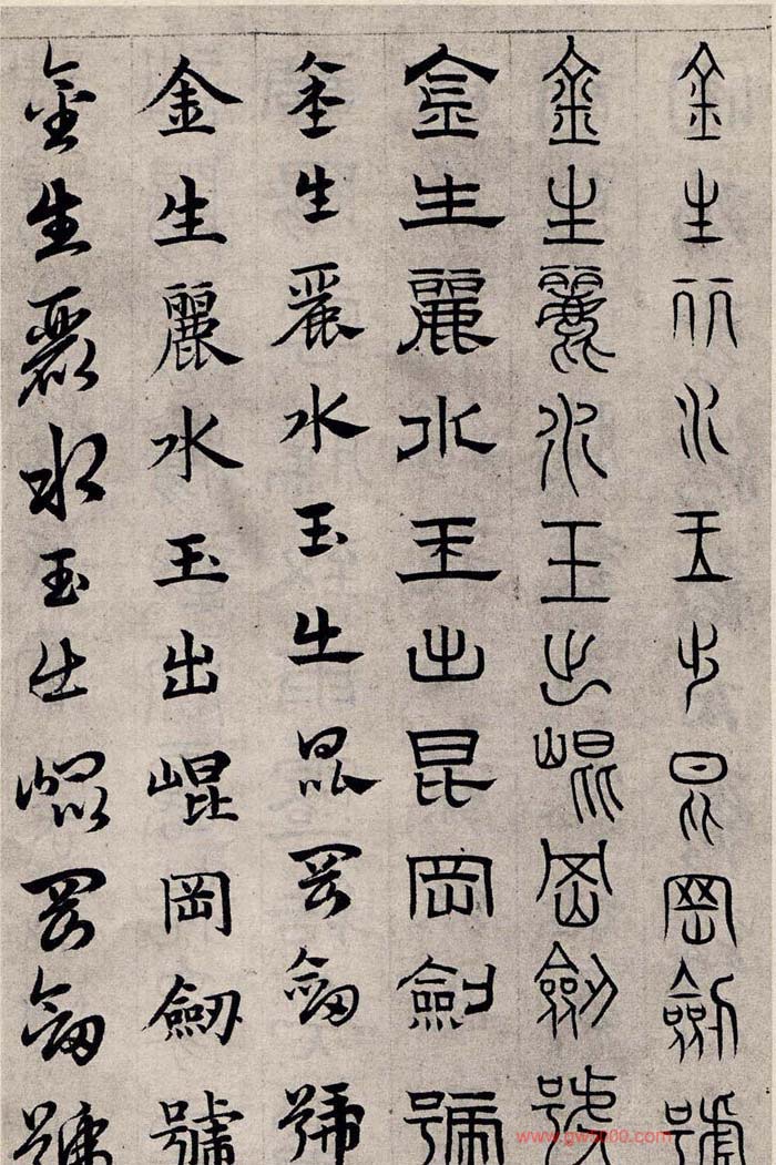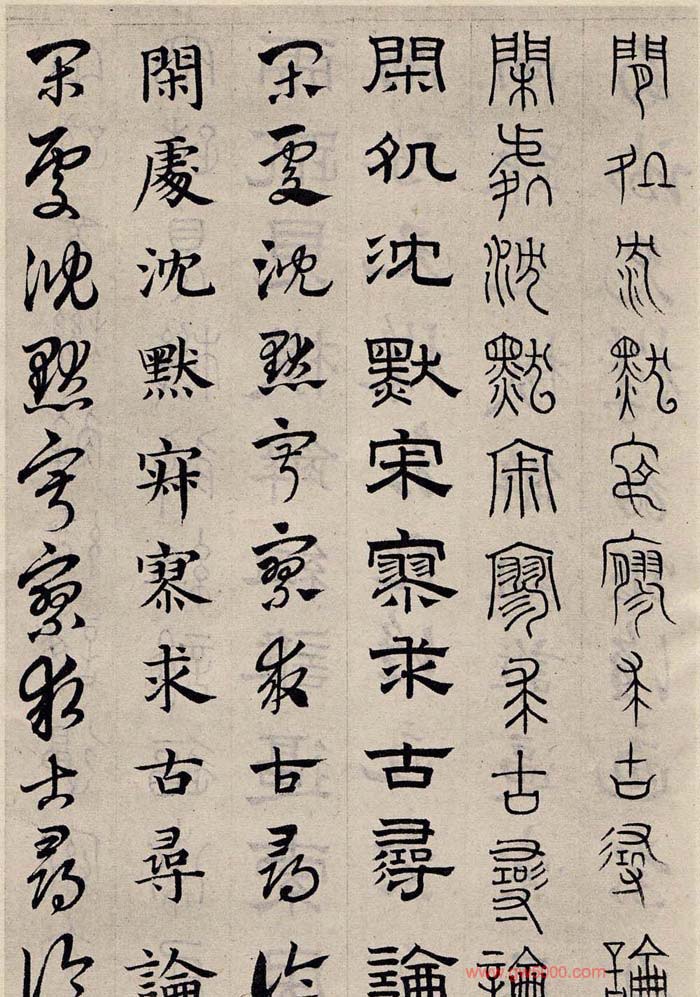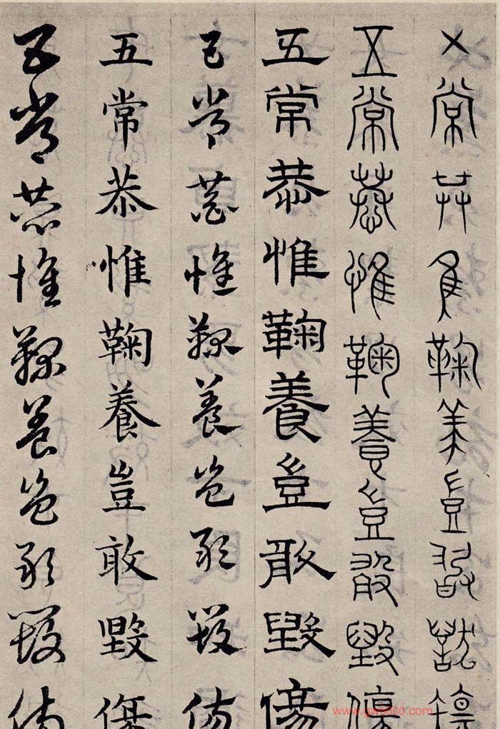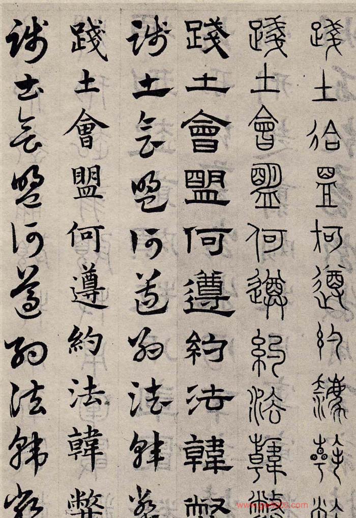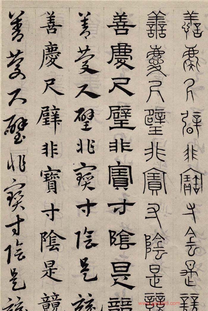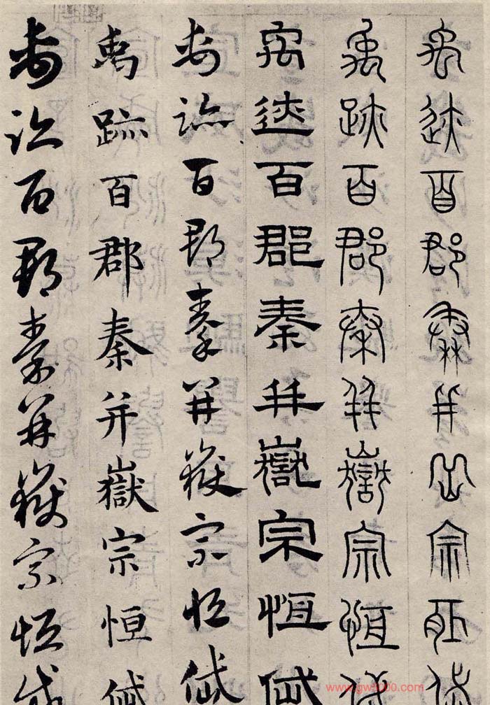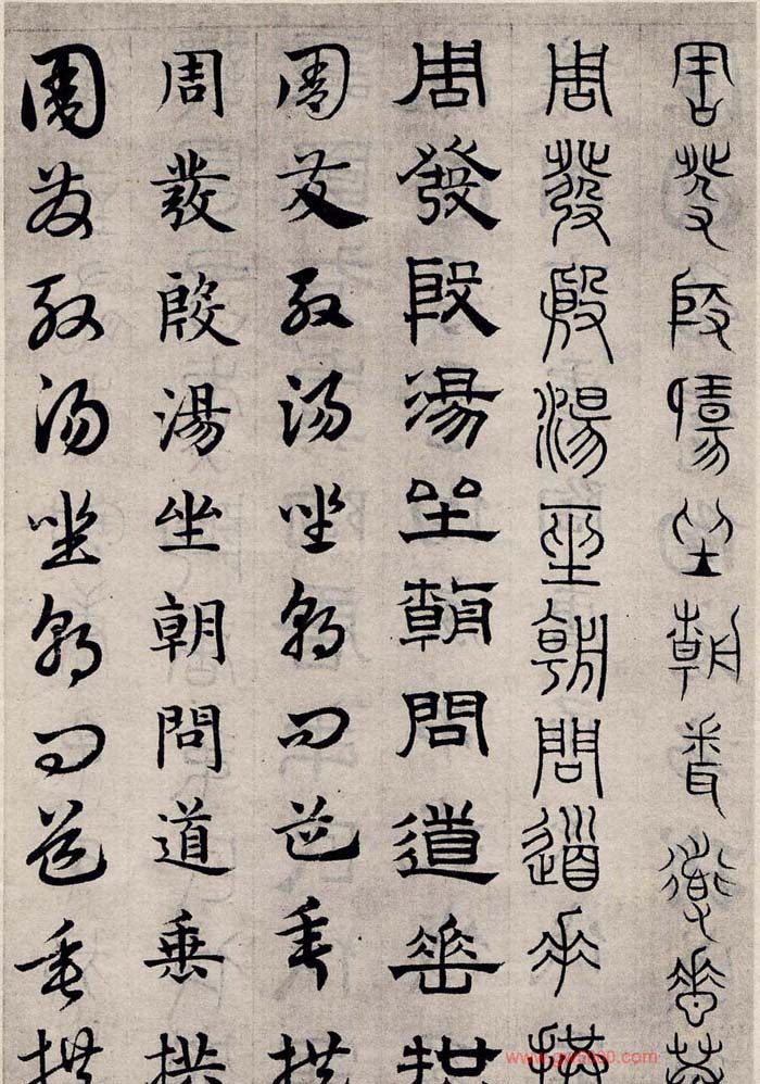 此卷赵孟頫《六体千字文》,分别作古篆、小篆、隶书、章草、楷书、今草六体。徐邦达先生《古书画伪讹考辨》记此卷“篆书尚平正少疵,草、楷诸体,结体既不稳,用笔更见轻弱光嫩,全无一点赵氏晚年书风气。只末后小楷款书还得到五六成貌似,当然必非真迹。