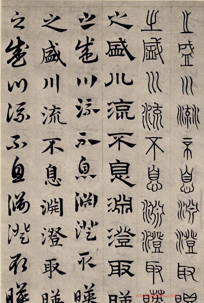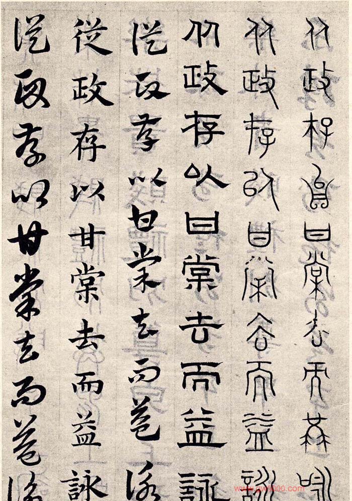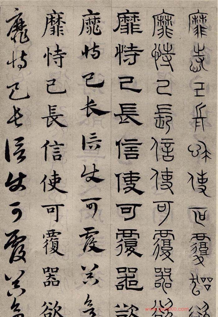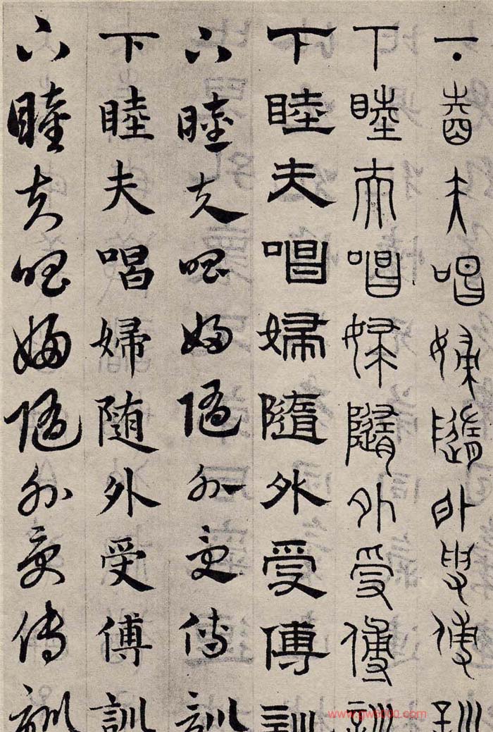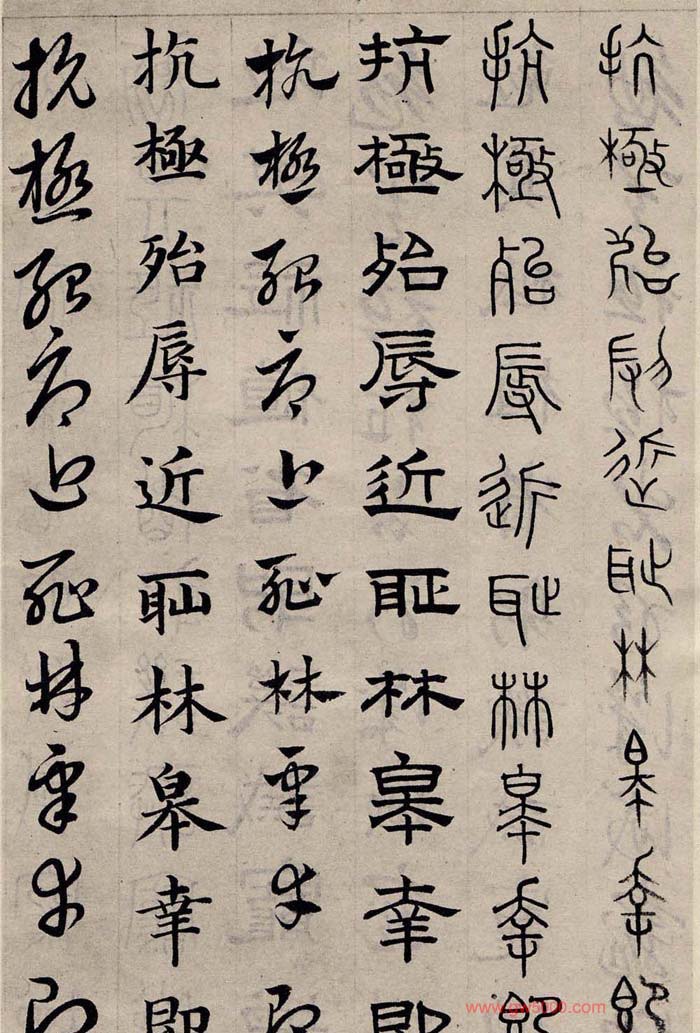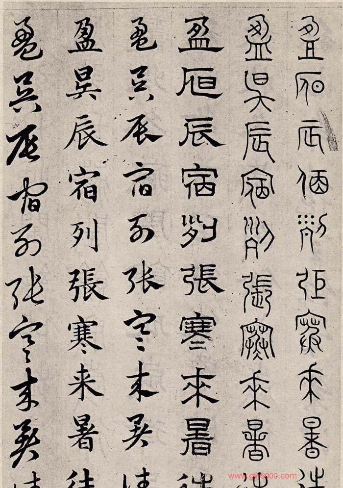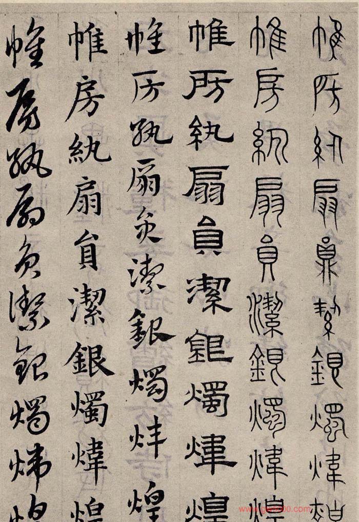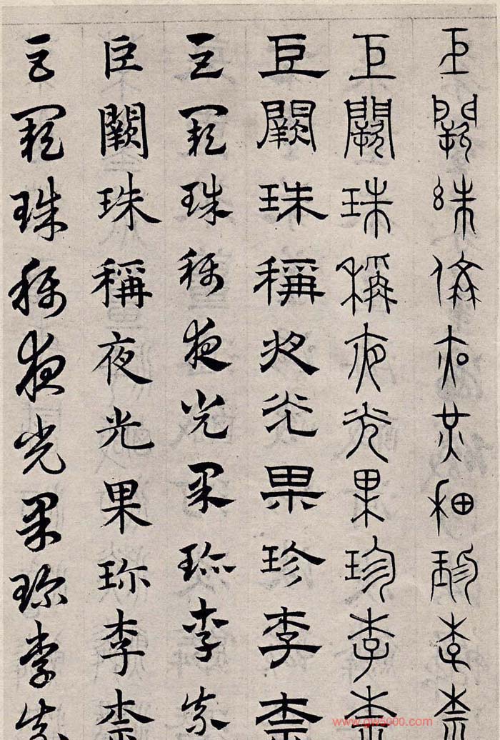 此卷赵孟頫《六体千字文》,分别作古篆、小篆、隶书、章草、楷书、今草六体。徐邦达先生《古书画伪讹考辨》记此卷“篆书尚平正少疵,草、楷诸体,结体既不稳,用笔更见轻弱光嫩,全无一点赵氏晚年书风气。只末后小楷款书还得到五六成貌似,当然必非真迹。