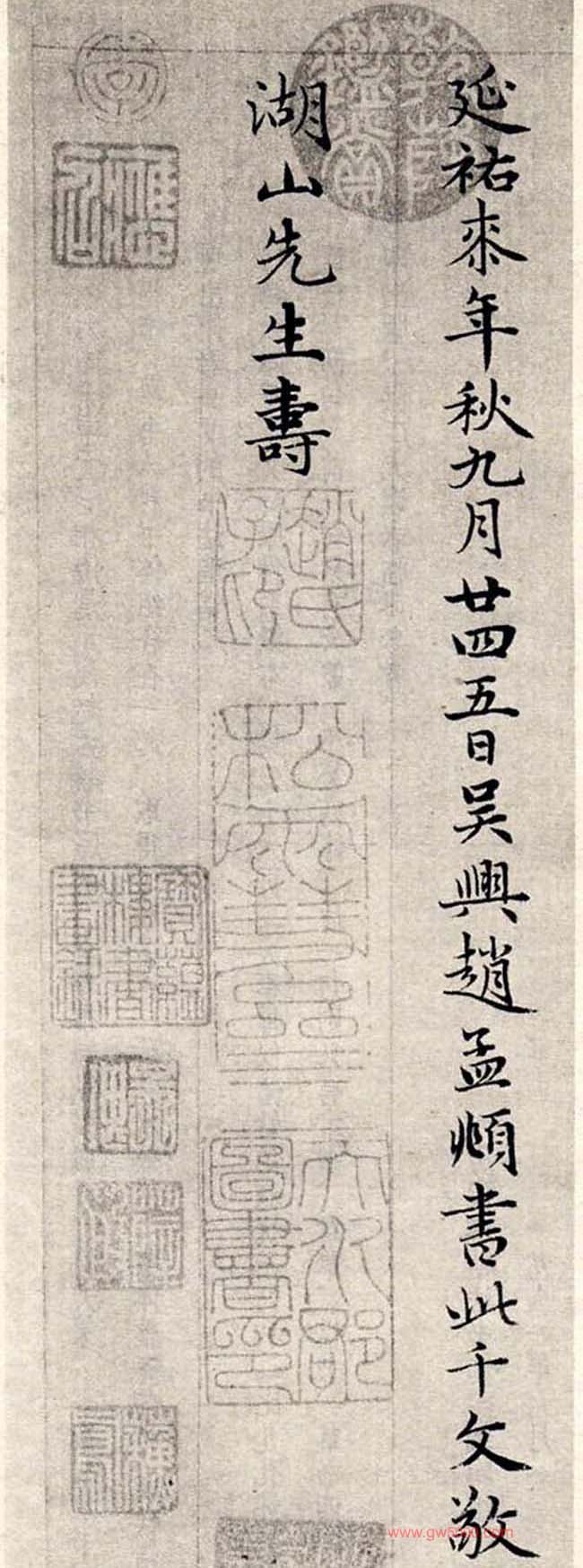 延祐桼(七)年(1320)秋九月廿四五日,吴兴赵孟頫书此千文,敬为湖山先生寿。