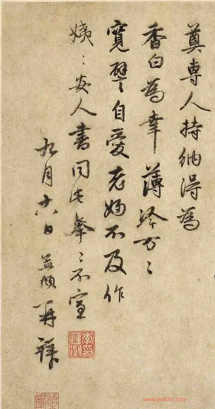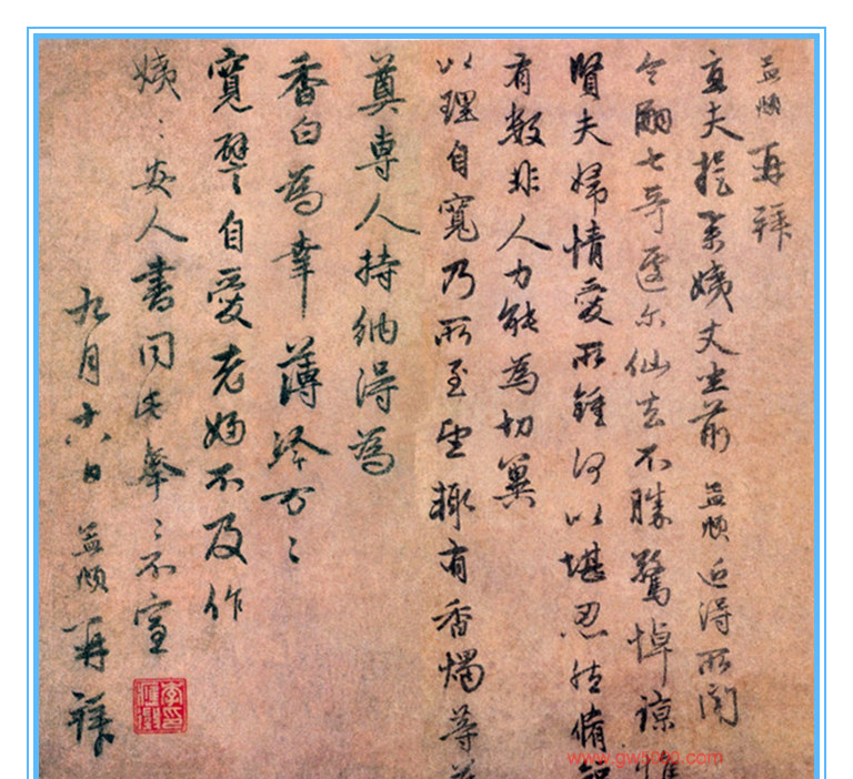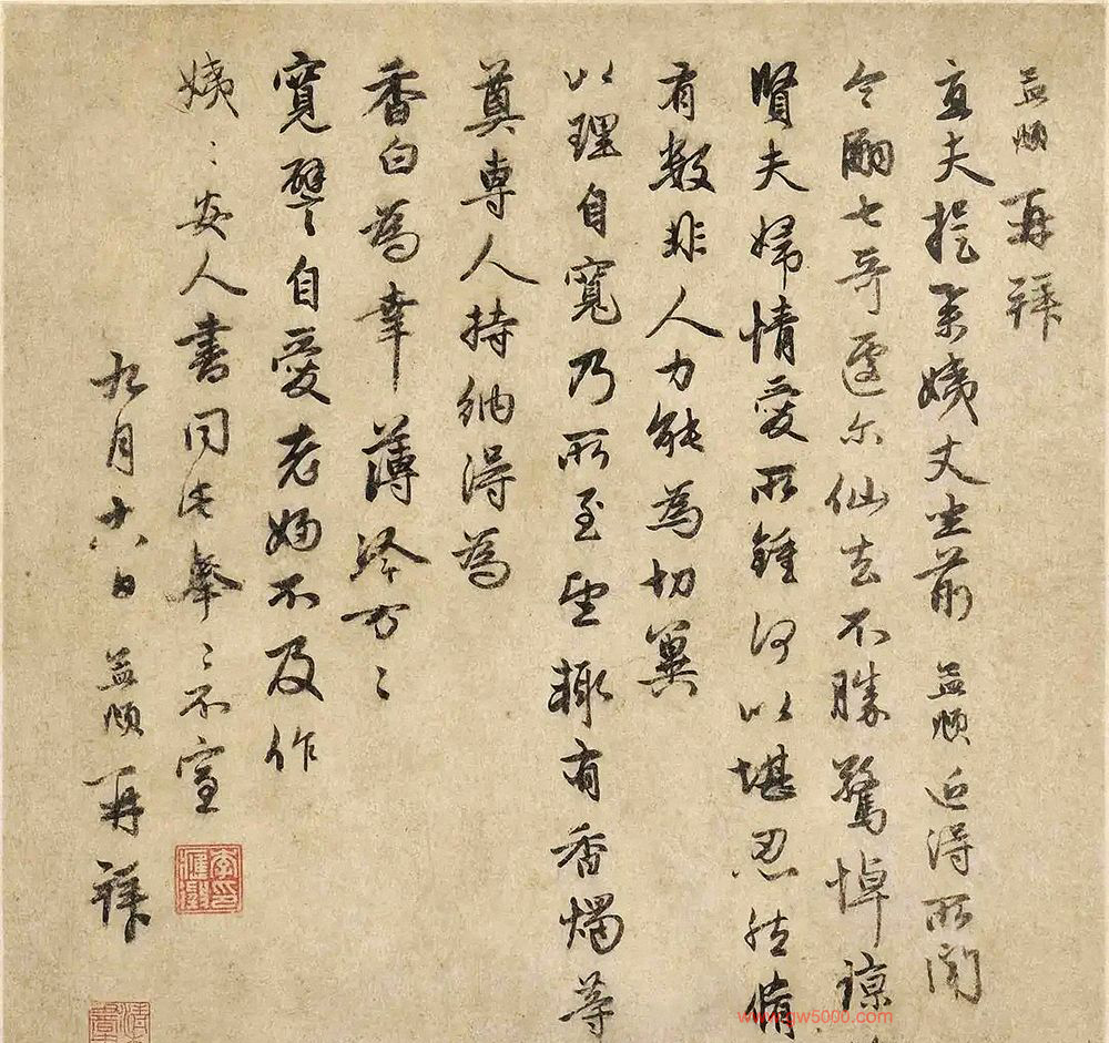 释文:孟再拜。直夫提举姨丈坐前。孟近得所闻。令嗣七哥逢尔仙去,不胜惊悼。谅惟贤二人妇情爱所钟,何以堪忍。然修短有数,非人力能为。切冀以理自宽,乃所至望,辄有香燭等薄奠,专人持纳。得为香白为幸,薄冷,万万宽譬自爱。老妇不及作姨,姨安人书。同此奉奉,不宣。九月十八日,孟再拜。