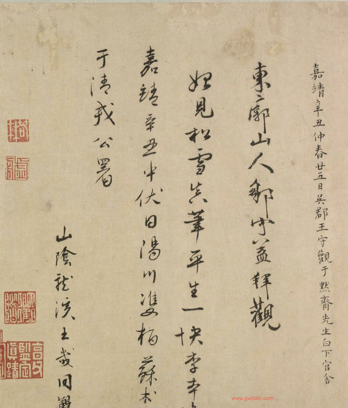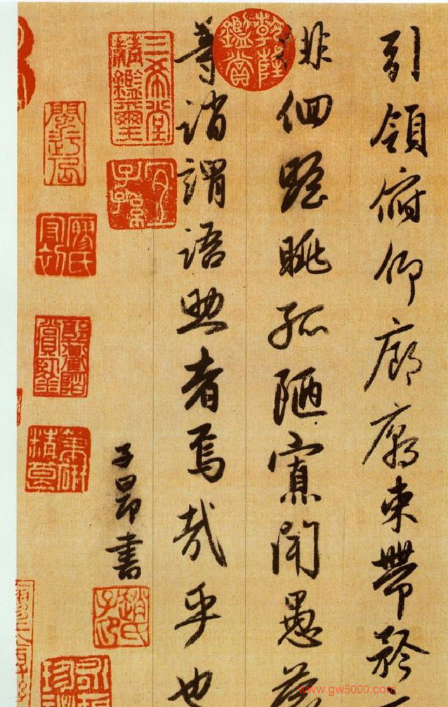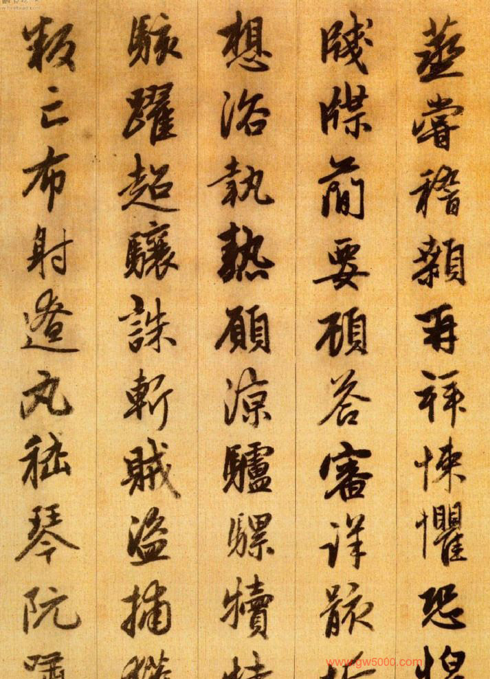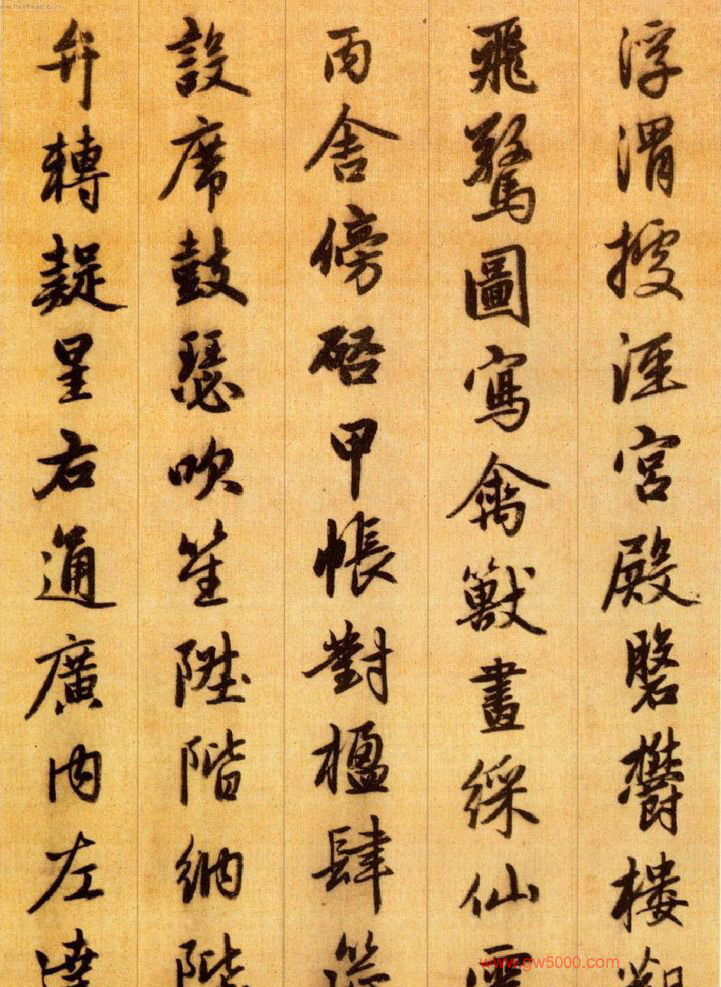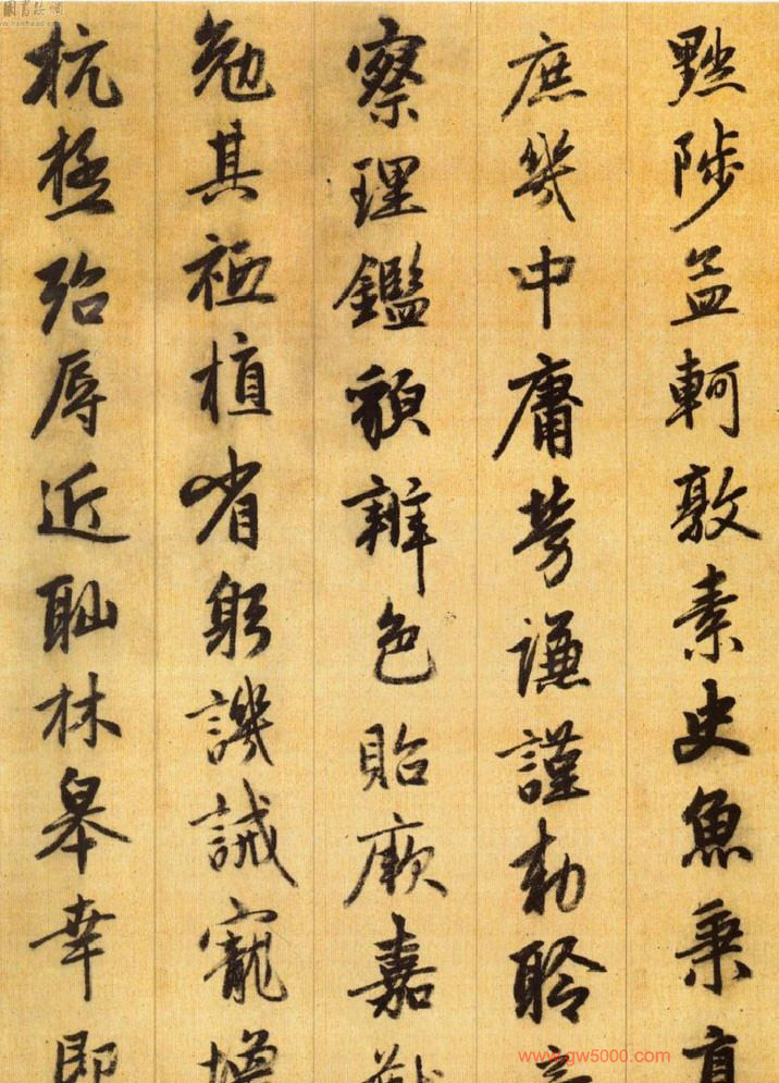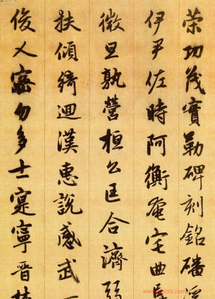 此卷初用楷书,行笔起伏变化较少,工稳严谨,沉着稳重,之后渐趋飞动舒展,转为行草书,流畅灵动,矫健多姿。明代书家詹景凤评说:“此卷笔法高古、圆润峻秀,为承旨得意之作。”