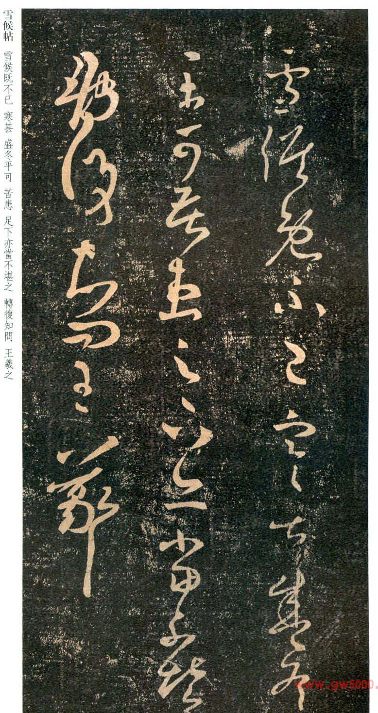 王羲之草书《雪候帖》,榻本。二行,二十七宁。《大观帖》 、《绛帖》 、《鼎帖》、《二王帖》、《宝晋斋帖》、《玉烟堂帖》均收刻此帖。前人考评此帖,有以为是伪迹者,如米芾、王澍;有以为乃王羲之书者,如姜夔、邢侗等。第一行“寒甚盛” ,《墨池编》作“寒甚成”。据上下文义,《墨池编》录文误。第二行“苦患”,《右军书记》亦作“苦患”。而顾从义《法帖释文考异》作“吾患”。