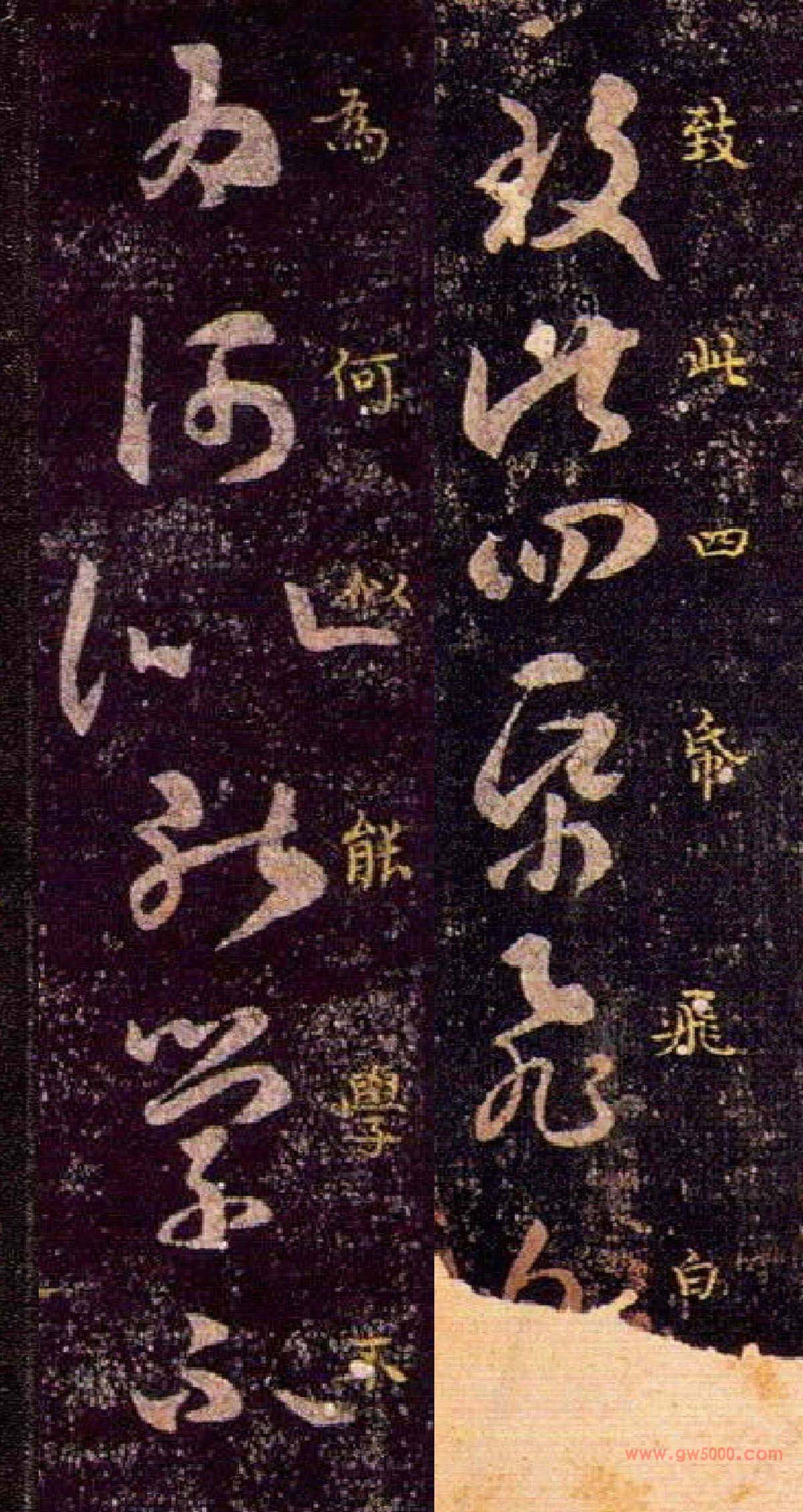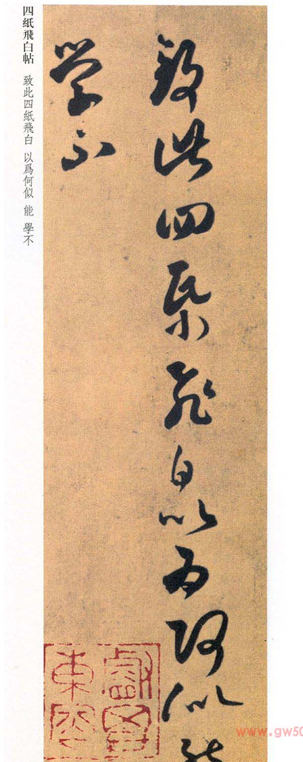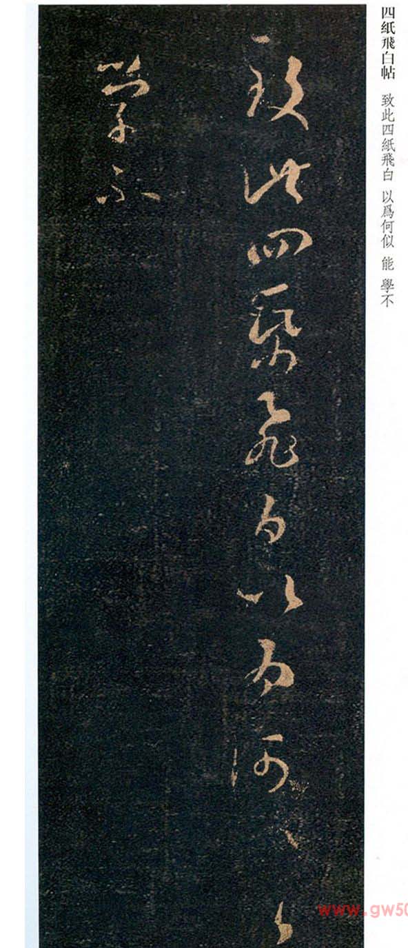 王羲之草书《飞白帖》,又名“四纸飞白帖”,榻本。2行,13字。《宣和书谱》有“飞白帖”目。