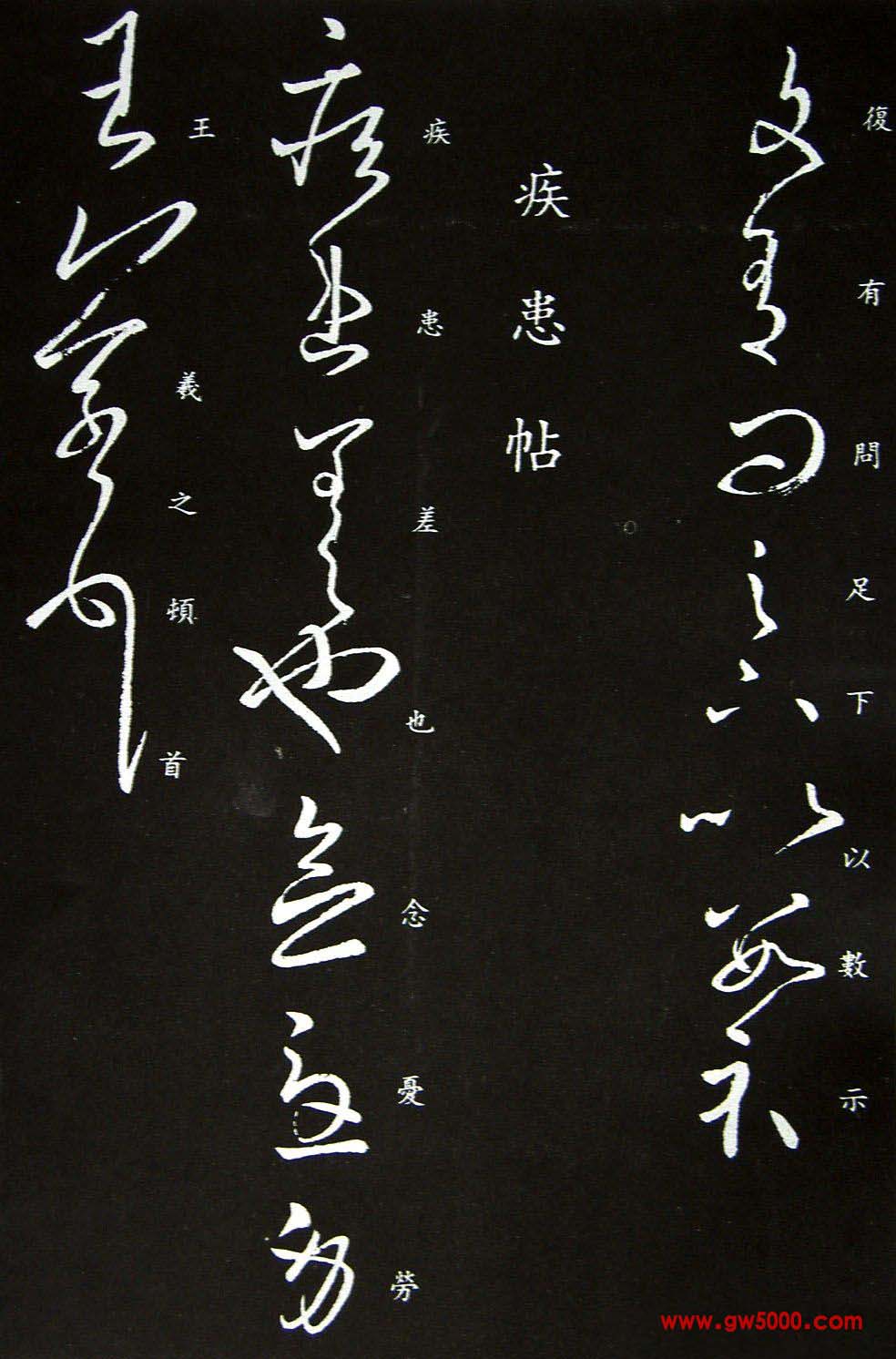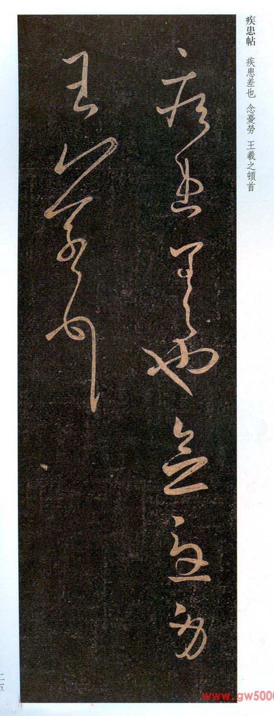 王羲之《疾患帖》1行,12字。草书。入刻《淳化阁帖》等。被米芾、黄伯思、王澍辨为伪帖。長睿謂此帖筆有王氏风气,大概是唐人纵笔臨仿的作品。