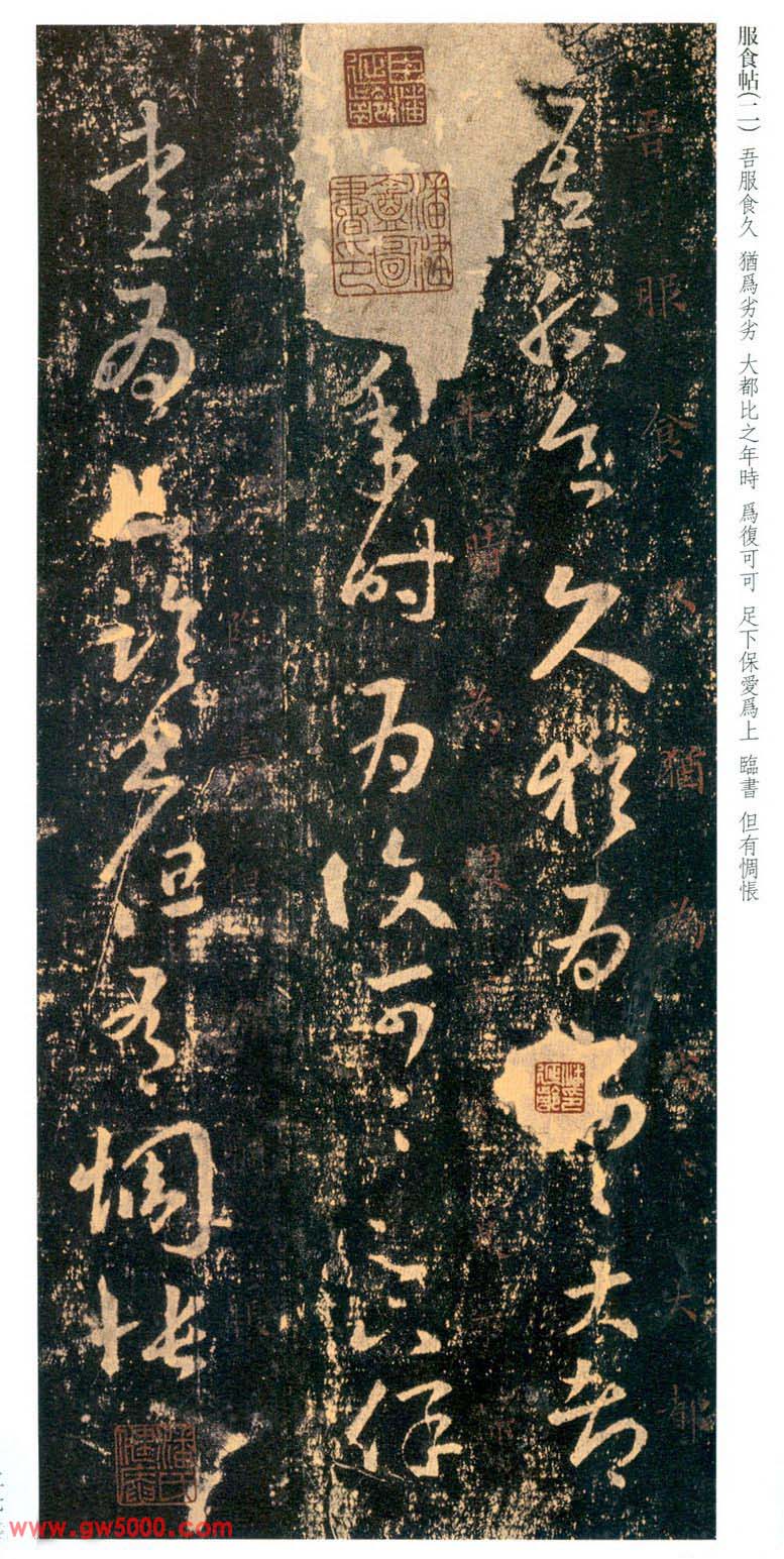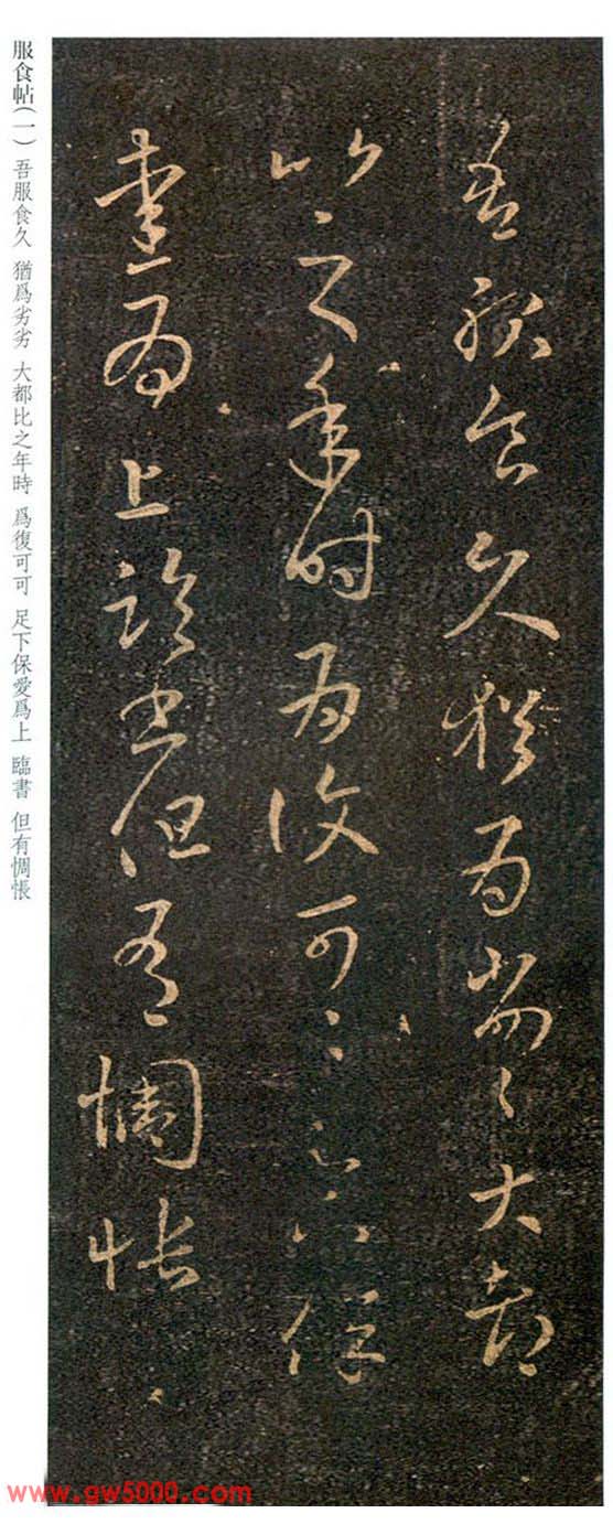 王羲之草书《服食帖》,3行,30字。《右军书记》著录。入刻《十七帖》等。服食是指魏晋流行的服用五石散的风俗。五石散由五种矿物组成,是毒性很重的药,服食者常会出现幻觉,当时人们却以为是升仙之物。王羲之曾有此好。