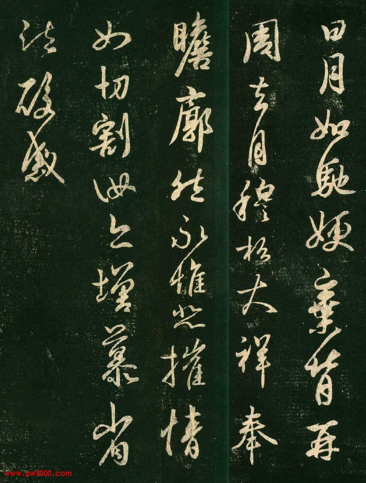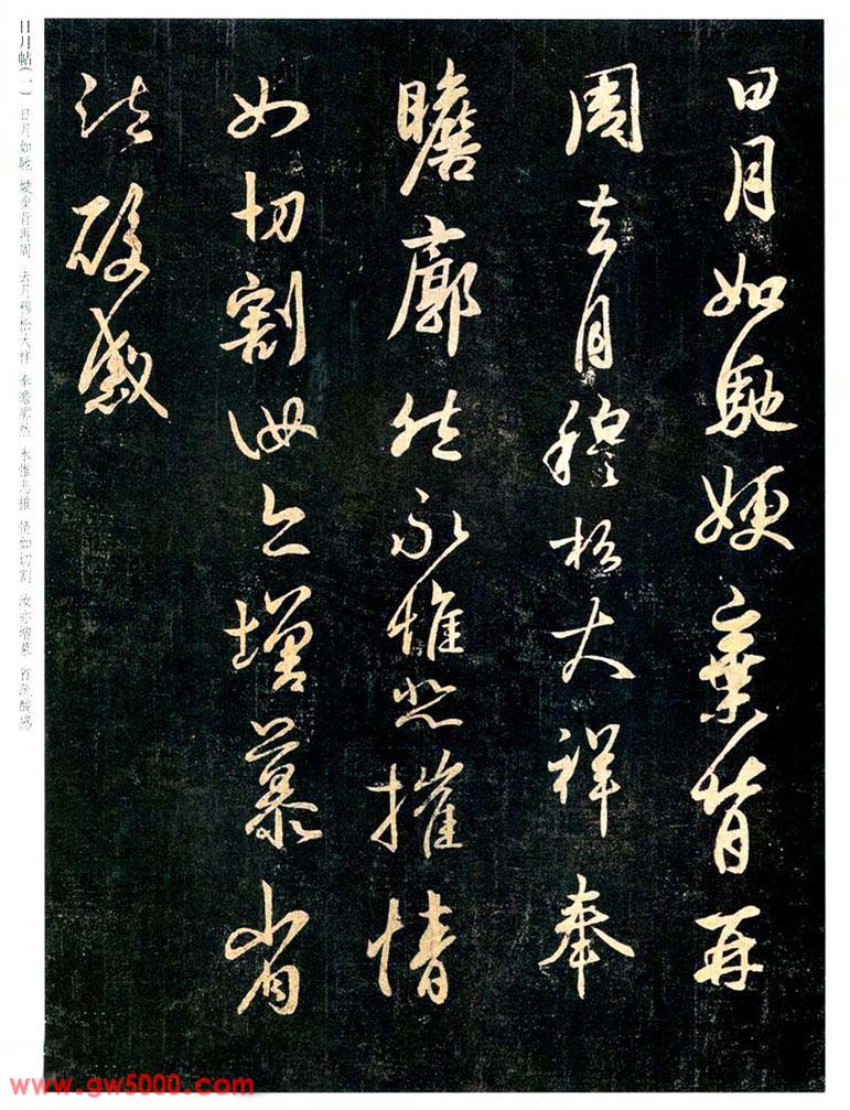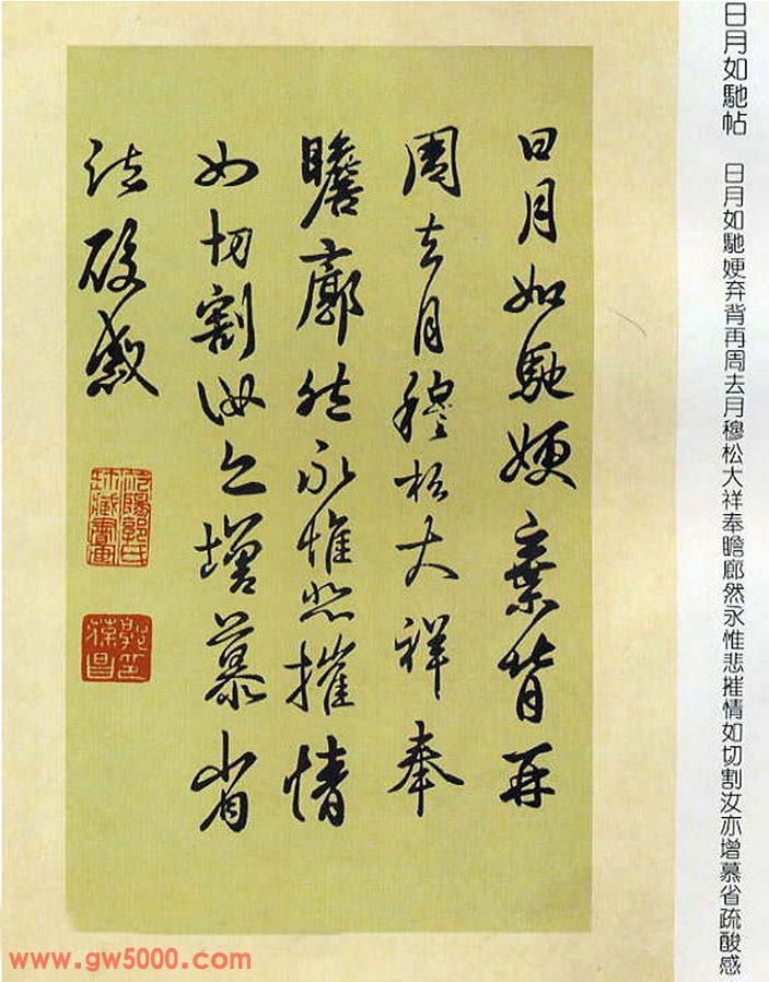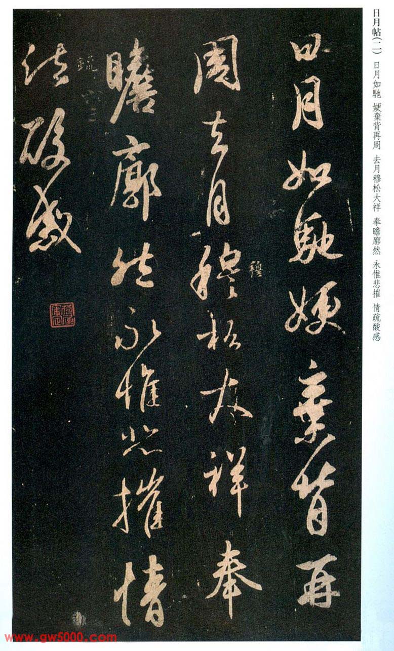 王羲之行书欣赏《日月如驰帖》,五行,35字。又称《日月帖》。褚遂良《右军书目》行书第十卷记载此帖首七字,并称“五行”,与此帖相合。《右军书记》亦著录此帖。《宝晋斋帖》、《大观帖》、《玉烟堂帖》收刻。此帖继《奄至帖》之後,书体风格一致,亦似墨迹本《频有哀祸帖》、《丧乱帖》。“悲摧”、“切割”、“增”、“感”等字,《频有哀祸帖》中亦有,结字形态极似。“大祥”,丧祭名,父母殁後二十五个月(即又期,过了一年後又过一年)而后祭曰大祥(十二个月而后祭曰小祥)。旧时亲丧以两年除灵,故大祥之祭乃除灵之际。帖中所言“弃背再周”,即指殁后两周年,正当举行“大祥”除灵之际。“穆、松”乃服母丧之二子,考《晋书》及《王氏谱》,王劭长子王穆,字伯远,晋临海太守,次子王默,幼子王恢。或许穆松为一人之称。但羲之年长于王劭,那么,嫂乃羲之对其从弟王劭之妻的尊称,此函应是致王劭的信函。又,田中勇次郎先生据《右军书记》中《六月二十七日帖》、《亡嫂帖》、《七月十六日帖》,认为亡嫂乃周氏。