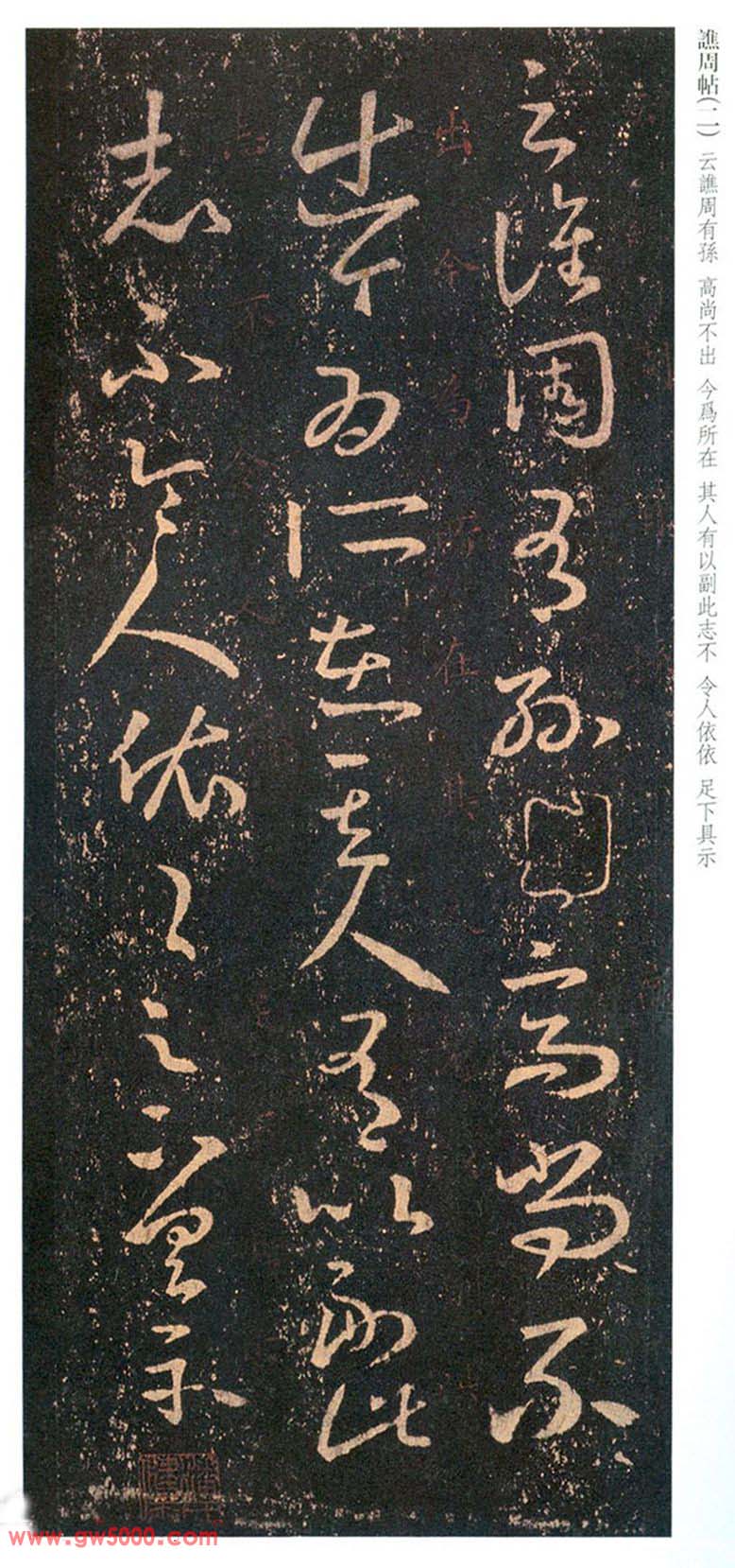 王羲之草书尺牍欣赏《谯周帖》拓本;共三行,二十九字,系《十七帖》第二十通尺牍。《右军书记》著录帖文,《宣和书谱》著录此帖目。《淳化阁帖》、《澄清堂帖》、《鼎帖》、《二王帖》收刻。