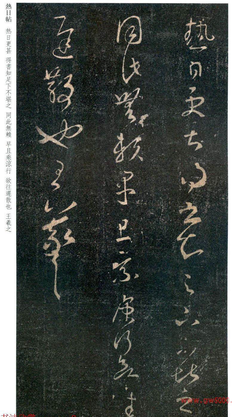 释文:热日更甚。得书,知足下不堪之,同此无赖。早且乘凉,行欲往,迟散也。王羲之。