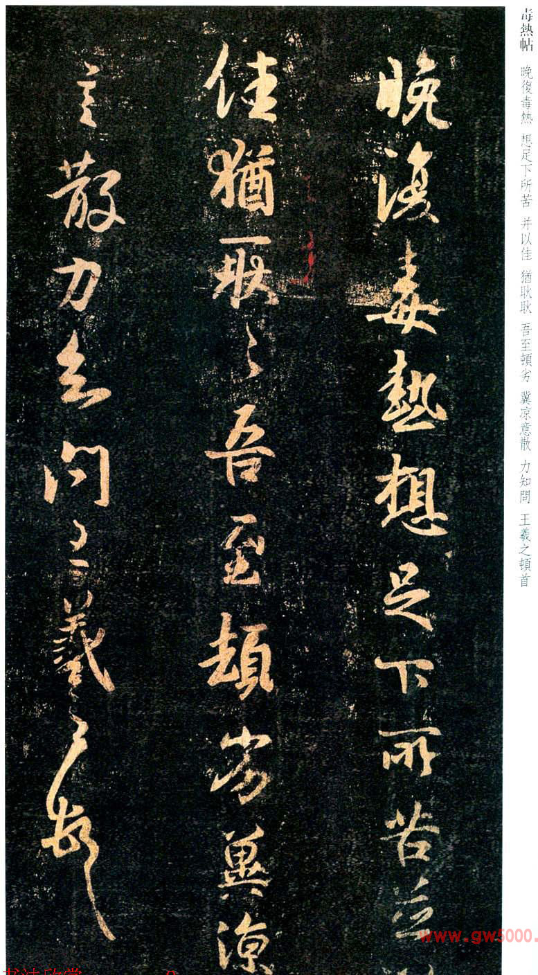 释文:晚复毒热,想足下所苦,并以佳,犹耿耿。吾至顿劣,冀凉言散,力知问。王羲之顿首。