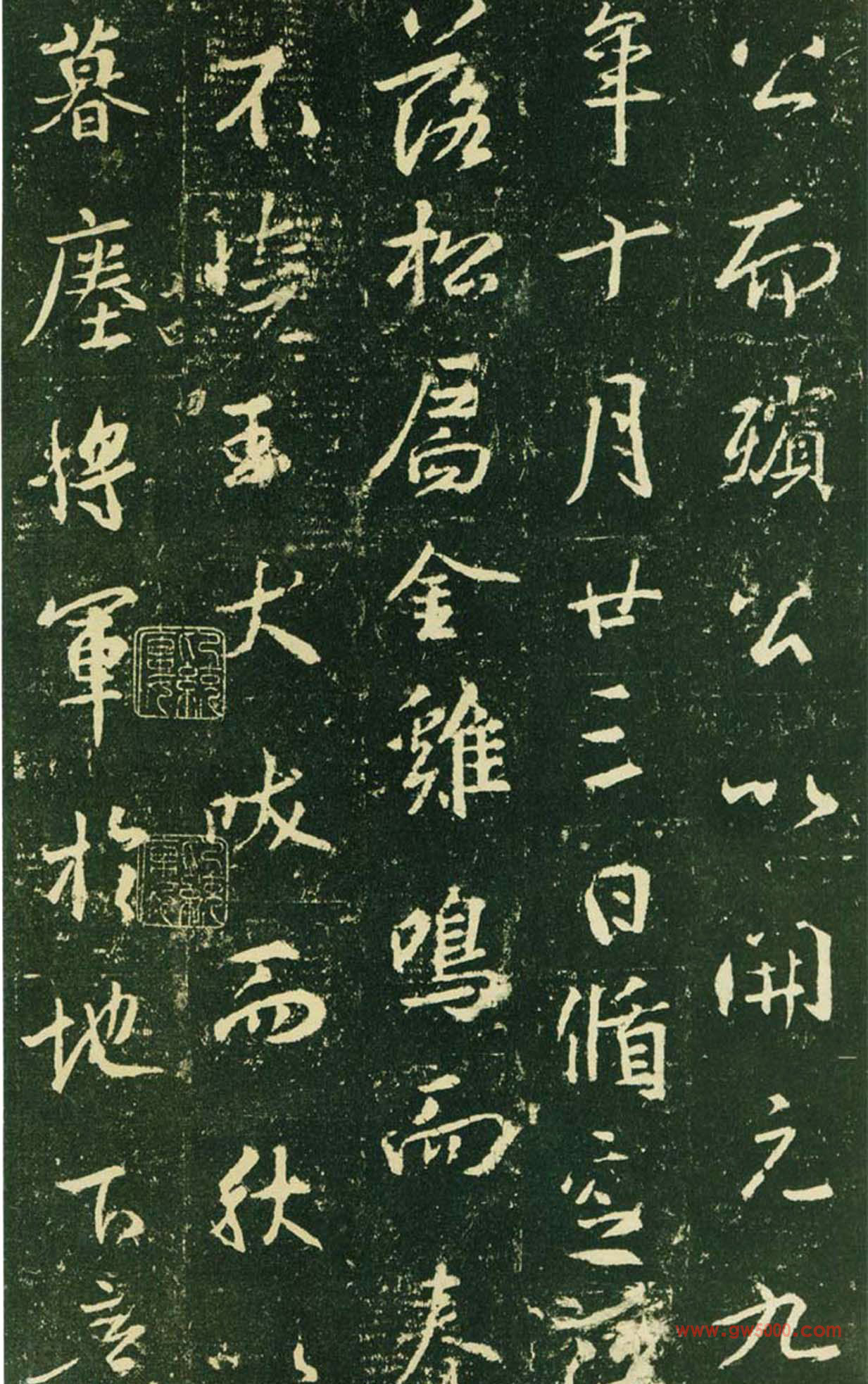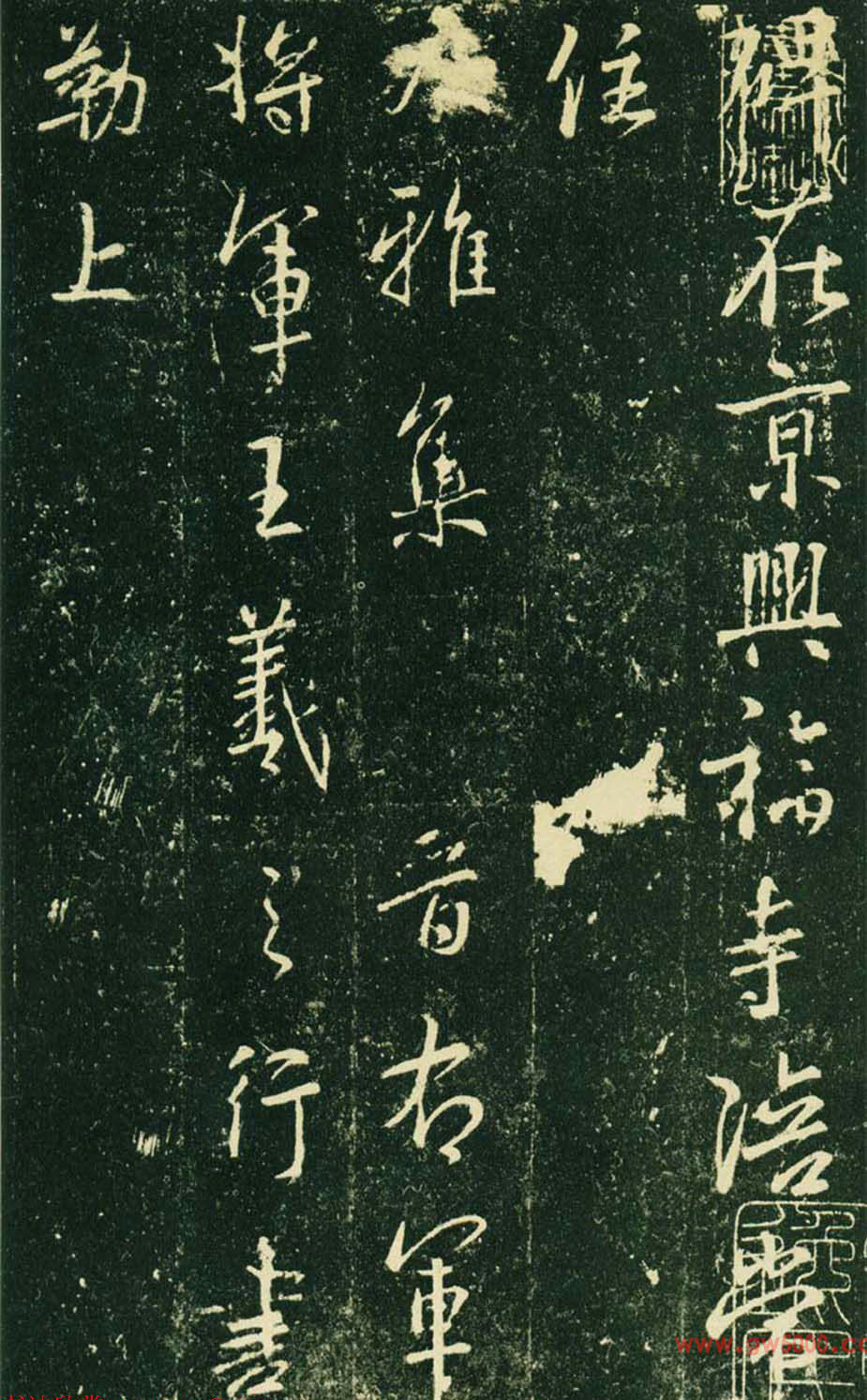 王羲之行书《兴福寺半截碑》,明万历年间出土于陕西西安。因出土时此碑缺其上少半部,故俗称《半截碑》,也称《镇国大将军吴文碑》。此碑为兴福寺僧大雅集王羲之书,徐思忠等刻字,唐朝开元九年(721)立于长安。现在陕西省博物馆碑林。