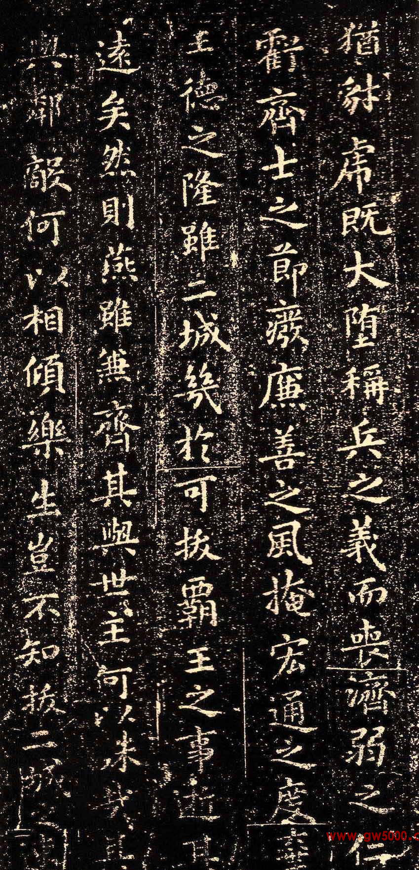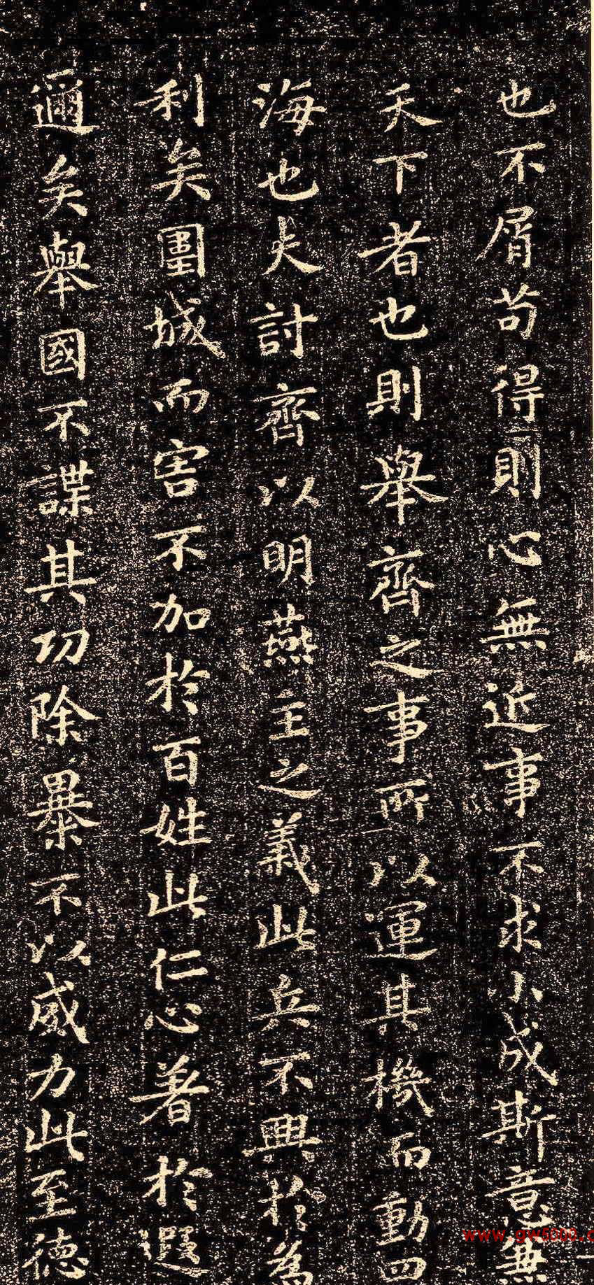 王羲之《乐毅论》释文:乐毅论□候泰初□□,世人多以乐毅不进拔营即墨论之夫求古贤之意,宜以大者远者先之,必迂回而难通,然後已焉可也,今乐氏之趣或者其未尽乎,而多劣之。是使前贤失指于将来不亦惜哉,观乐生遗燕惠王书,其殆庶乎机,合乎道以终始者与,其喻昭王曰:伊尹放太甲而不疑,太甲受放而不怨,是存大业于至公,而以天下为心者也,夫欲极道德之量,务以天下为心者,必致其主於盛隆,合其趣於先王,苟君臣同符,斯大业定矣。于斯时也,乐生之志,千载一遇也,亦将行千载一隆之首,岂其局迹当时,止於兼并而已哉,夫兼并者非乐生之所屑,彊燕而废道,又非乐生之所求也。不屑苟得则心无近事,不求小成,斯意兼天下者也。则举齐之事,所以运其机而动四海也,讨齐以明燕主之义,此兵不兴于为利矣。围城而害不加於百姓,此仁心着於遐迩矣,举国不谋其功,除暴不以威力,此至德令於天下矣;迈至德以率列国,则几於汤武之事矣,乐生方恢大纲,以纵二城,牧民明信,以待其弊,使即墨莒人,顾仇其上,愿释干戈,赖我犹亲,善守之智,无所之施,然则求仁得仁,即墨大夫之义也,任穷则从,微子適周之道也,开弥广之路,以待田单之徒,长容善之风,以申齐士之志。使夫忠者遂节,通者义著,昭之东海,属之华裔。我泽如春,下应如草,道光宇宙,贤者托心,邻国倾慕,四海延颈,思戴燕主,仰望风声,二城必从,则王业隆矣,虽淹留於两邑,乃致速於天下,不幸之变,势所不图,败於垂成,时运固然,若乃逼之以威,劫之以兵,则攻取之事,求欲速之功,使燕齐之士流血于二城之间,侈杀伤之残,示四国之人,是纵暴易乱,贪以成私,邻国望之,其犹犲虎。既大堕称兵之义,而丧济弱之仁,亏齐十之节,废廉善之风,掩宏通之废,弃王德之隆,虽二城几于可拔,覇王之事逝,其远矣。然则燕虽兼齐,其与世主何以诛哉。其与邻敌何以相顷。乐生岂不知拔二城之速了哉,顾城拔而业乖,岂不知不速之致变哉,顾业乖与变同,由是言之,乐生之不屠二城,其亦未可量也。永和四年十二月廿四