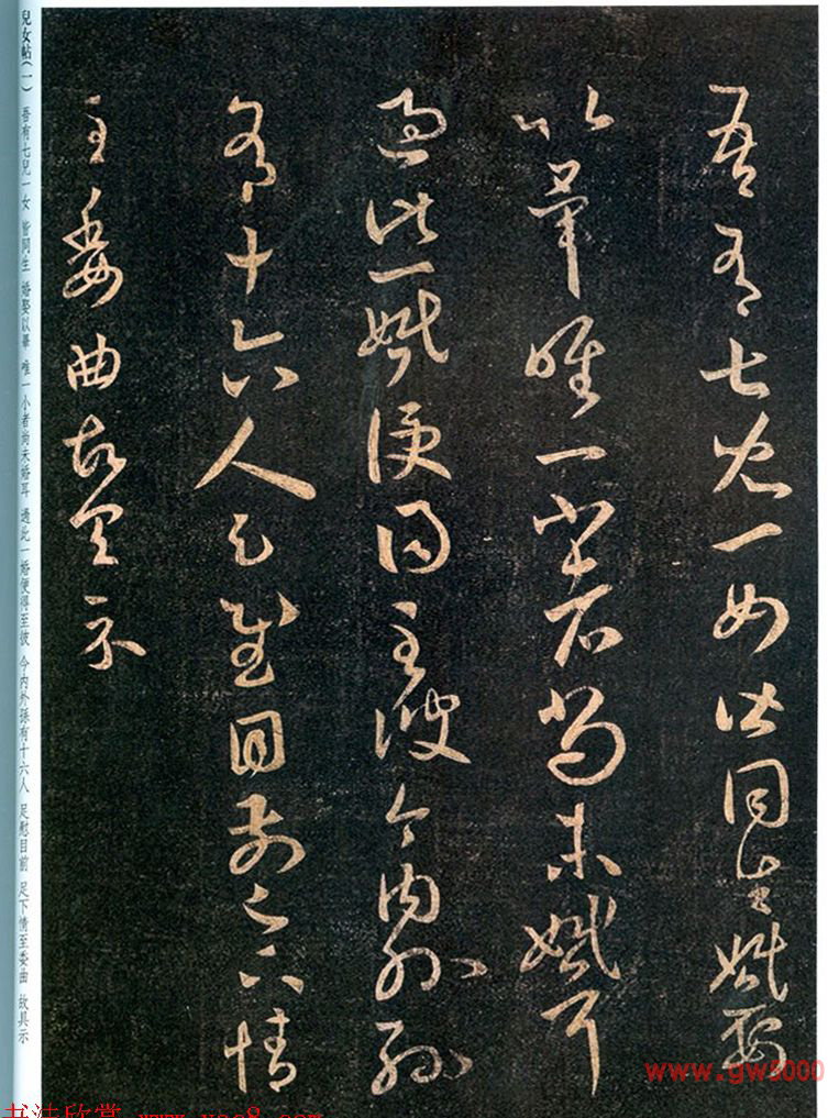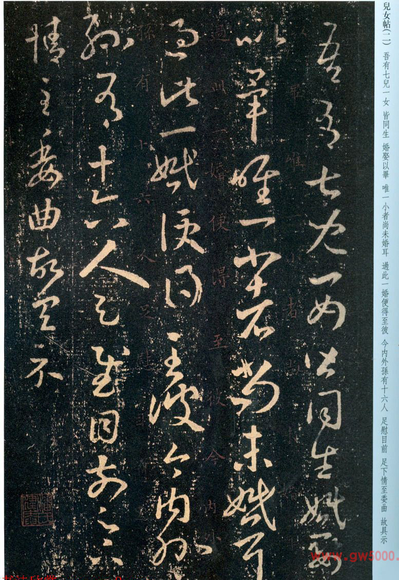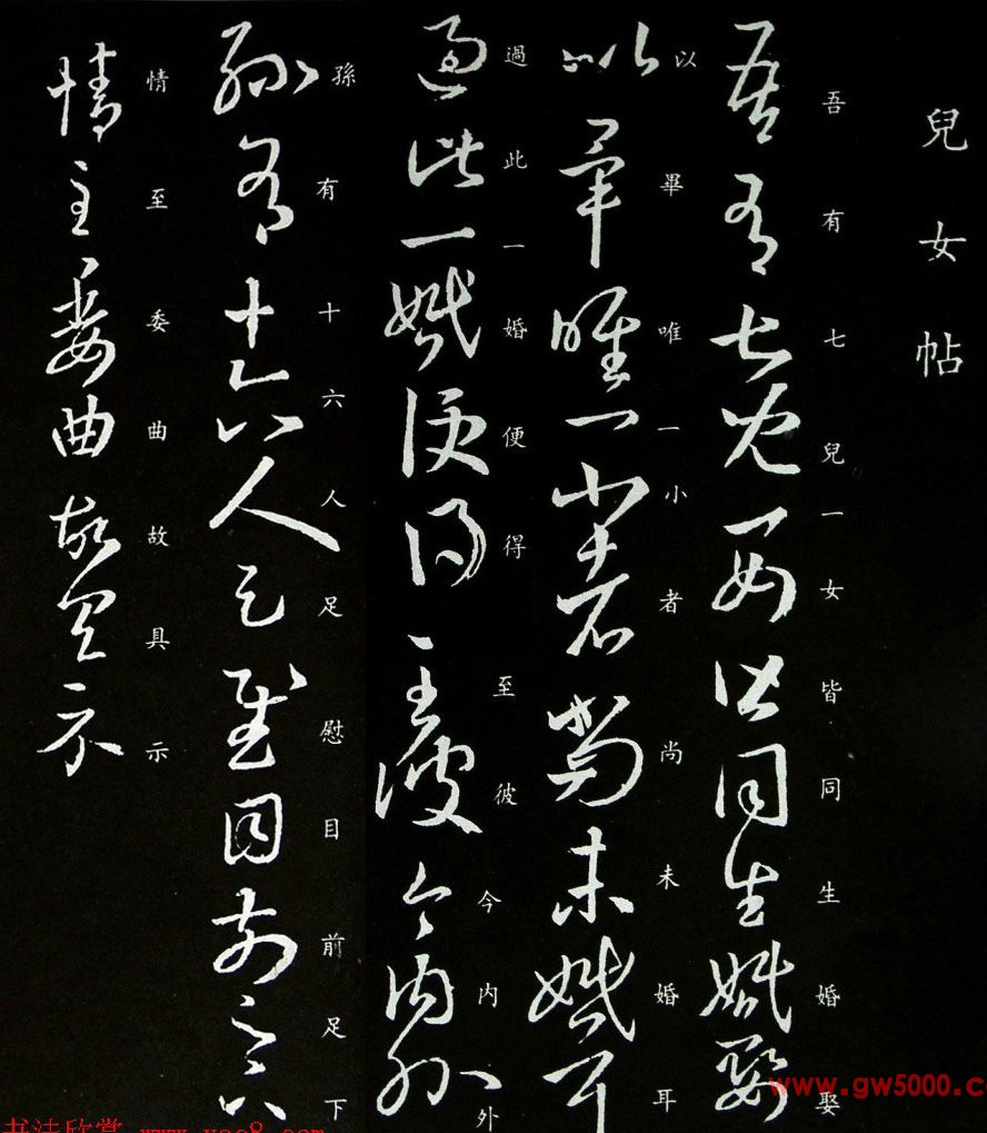 王羲之草书拓本《儿女帖》四种,又称《同生帖》。5行,50字。《宣和书谱》录有帖目。入刻《十七帖》等。此函当系王羲之书与周抚,其中“唯一小者尚未婚耳”指的就是王献之。 释文:吾有七儿一女,皆同生。婚娶以毕,唯一小者尚未婚耳。过此一婚,便得至彼。今内外孙有十六人,足慰目前,足下情至委曲,故具示。