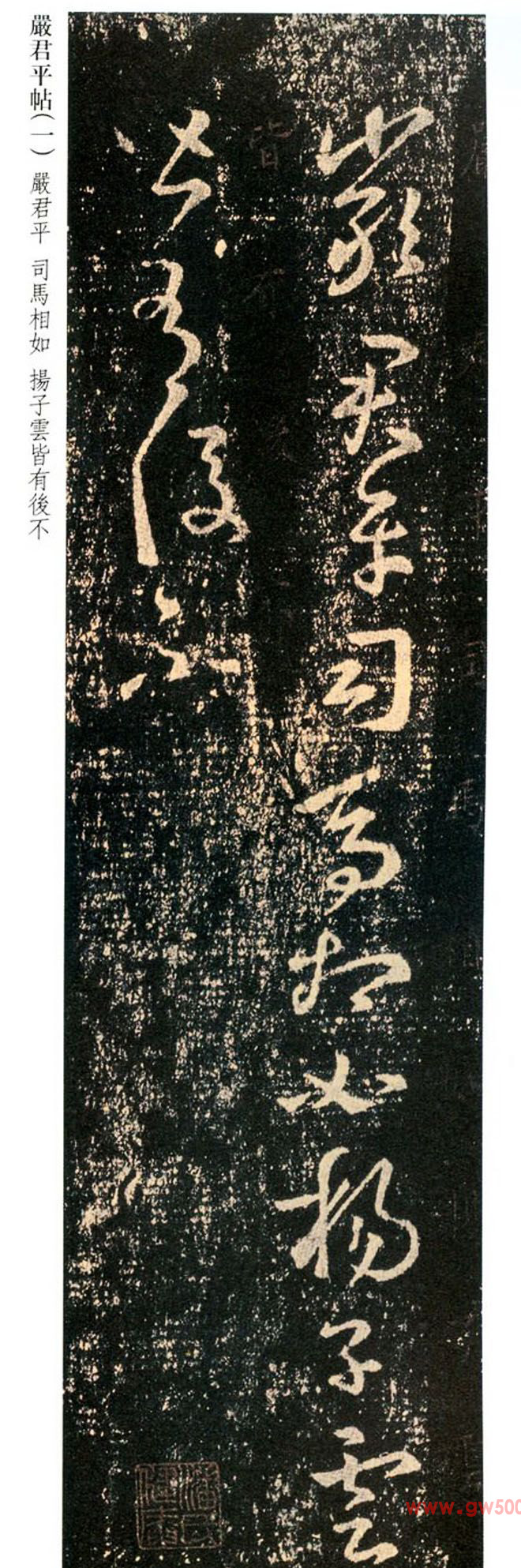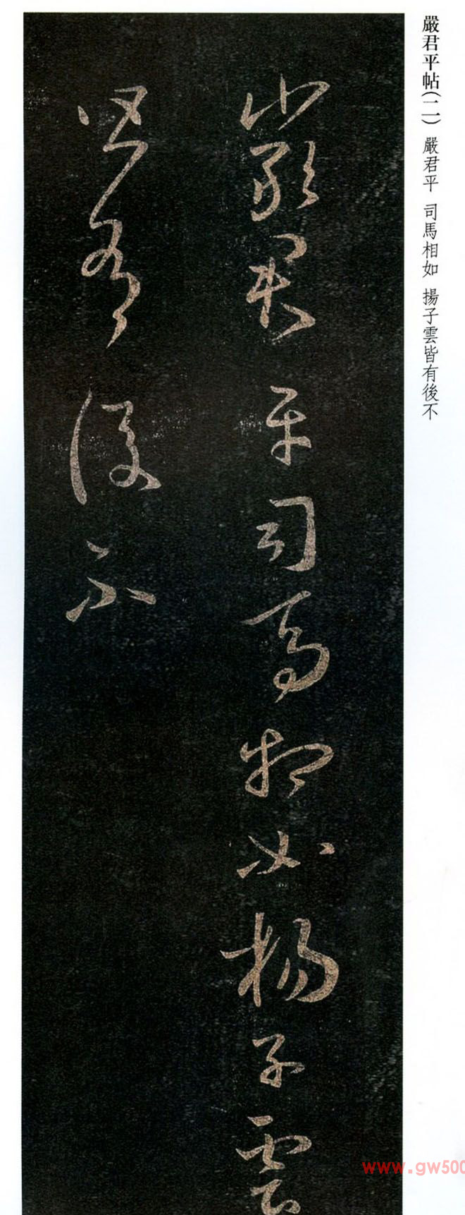 王羲之草书拓本《严君平帖》两种,2行,14字。《右军书记》著录。此函系王羲之书与周抚,询问蜀地三位名人后裔的情况。严君平指著名的巫卜严遵。