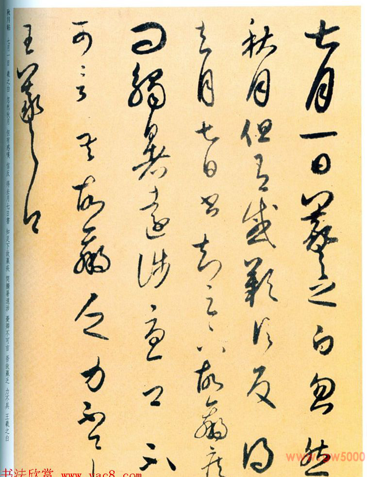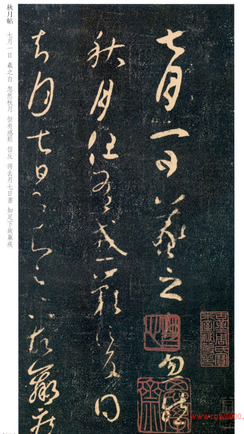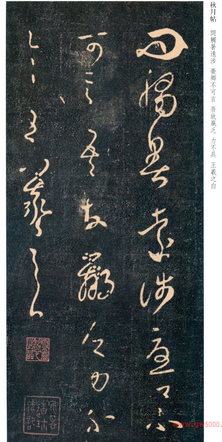 王羲之草书欣赏《七月帖》摹本,又称《秋月帖》。与《都下帖》装为一卷(七月都下帖)。麻纸本。纵27.7 厘米,横25.8厘米。6行,50字。台北故宫博物院藏。曾为金章宗、项元汴等藏。
