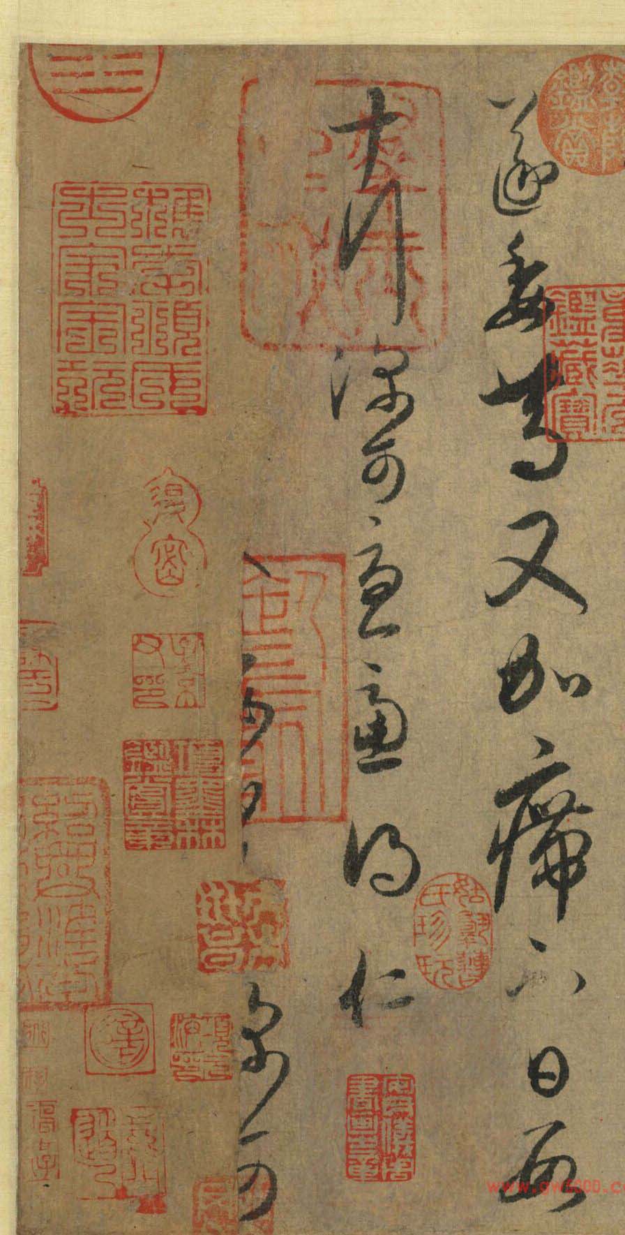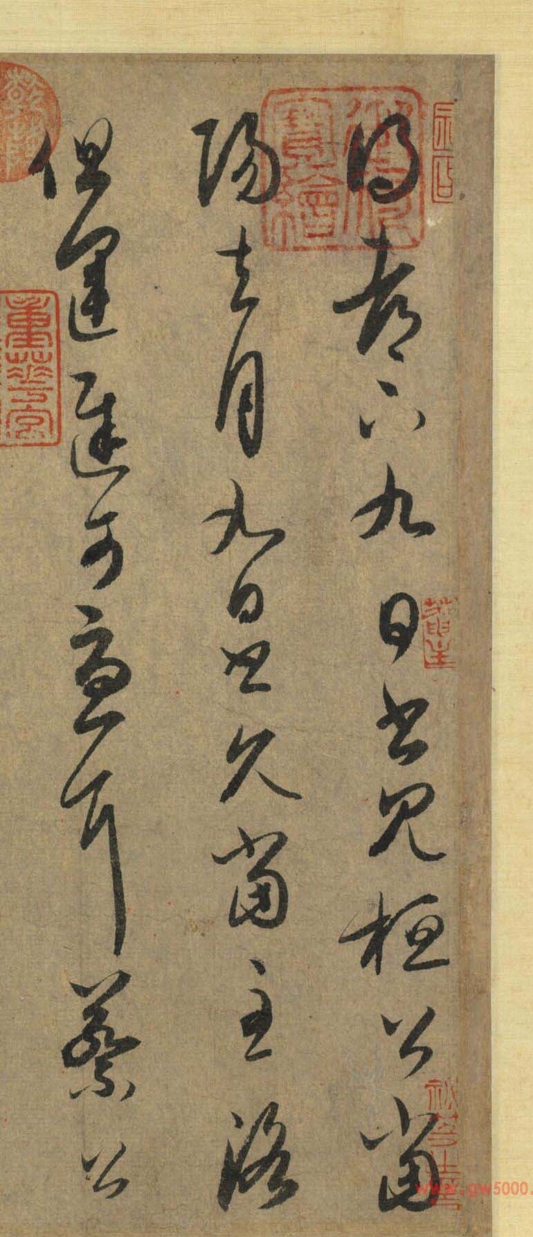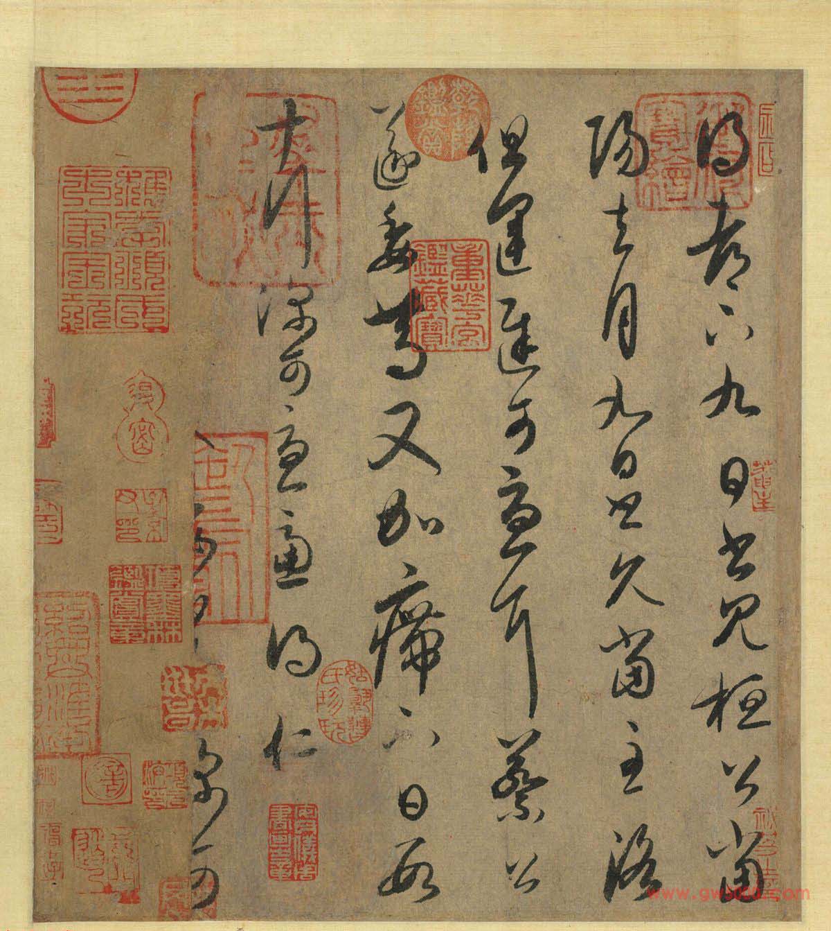 王羲之草书作品欣赏《都下帖》又称《桓公当阳帖》麻纸摹本,与《秋月帖》合装为一卷(七月都下帖)。纵27.7厘米。5行,45字。永和十二年(356)书。与《右军书记》相校,此帖“仁”字下裁去27字。钤有绘“御府宝绘”、“群玉中秘”、“项元汴印”、“安氏仪周书画之章”、“姑熟曹氏珍玩”、“乾隆鉴赏”等。台北故宫博物院藏。
