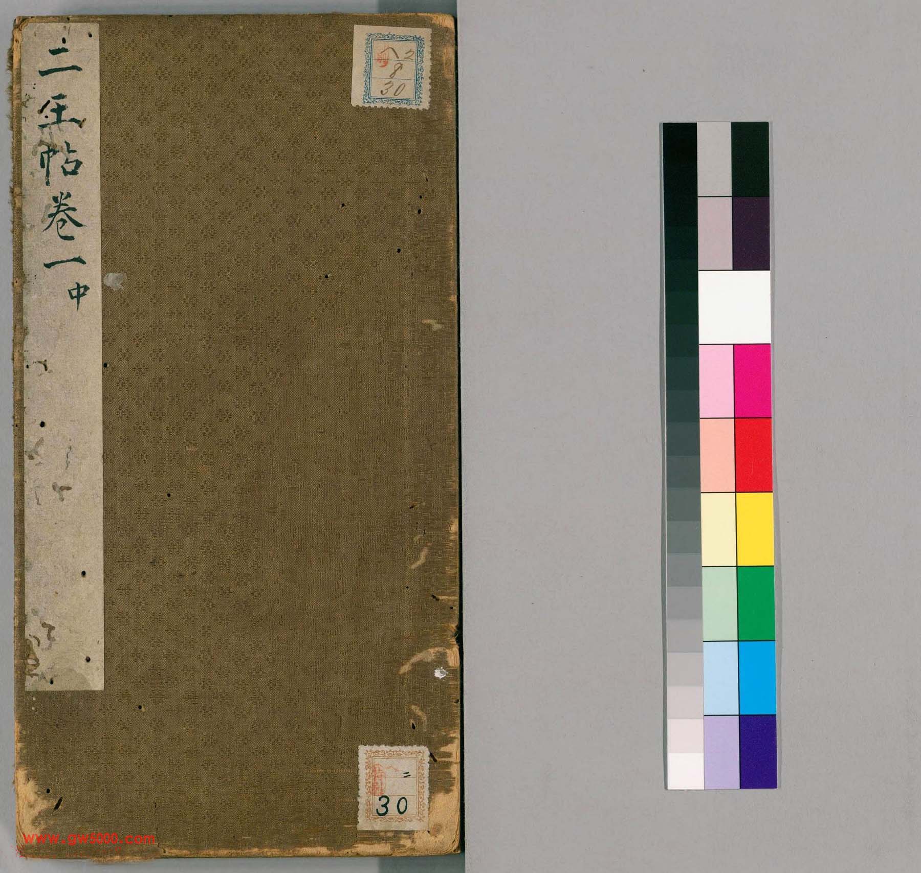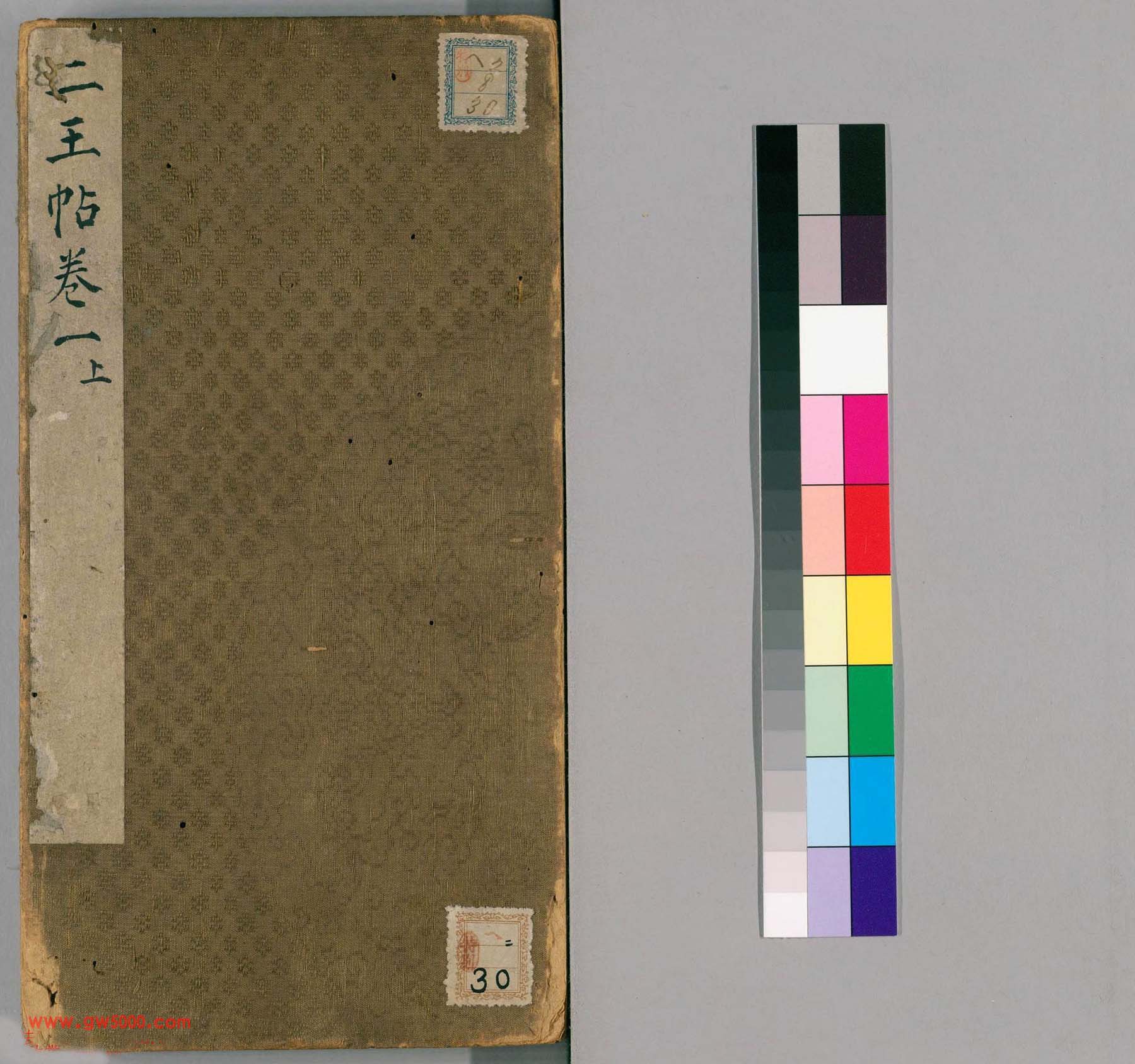 《二王帖》爲明代嘉靖年間吳江松陵人董漢策所刻晉王羲之、王獻之父子的行書草書帖。分兩卷(各分三部分,含龍舒石刻右軍、大令像各一幅),內收錄約138帖,並有附兩卷目錄評釋加以考證(彭履道小楷書)。此本大致爲明萬曆13年(1585)董漢策刊本。