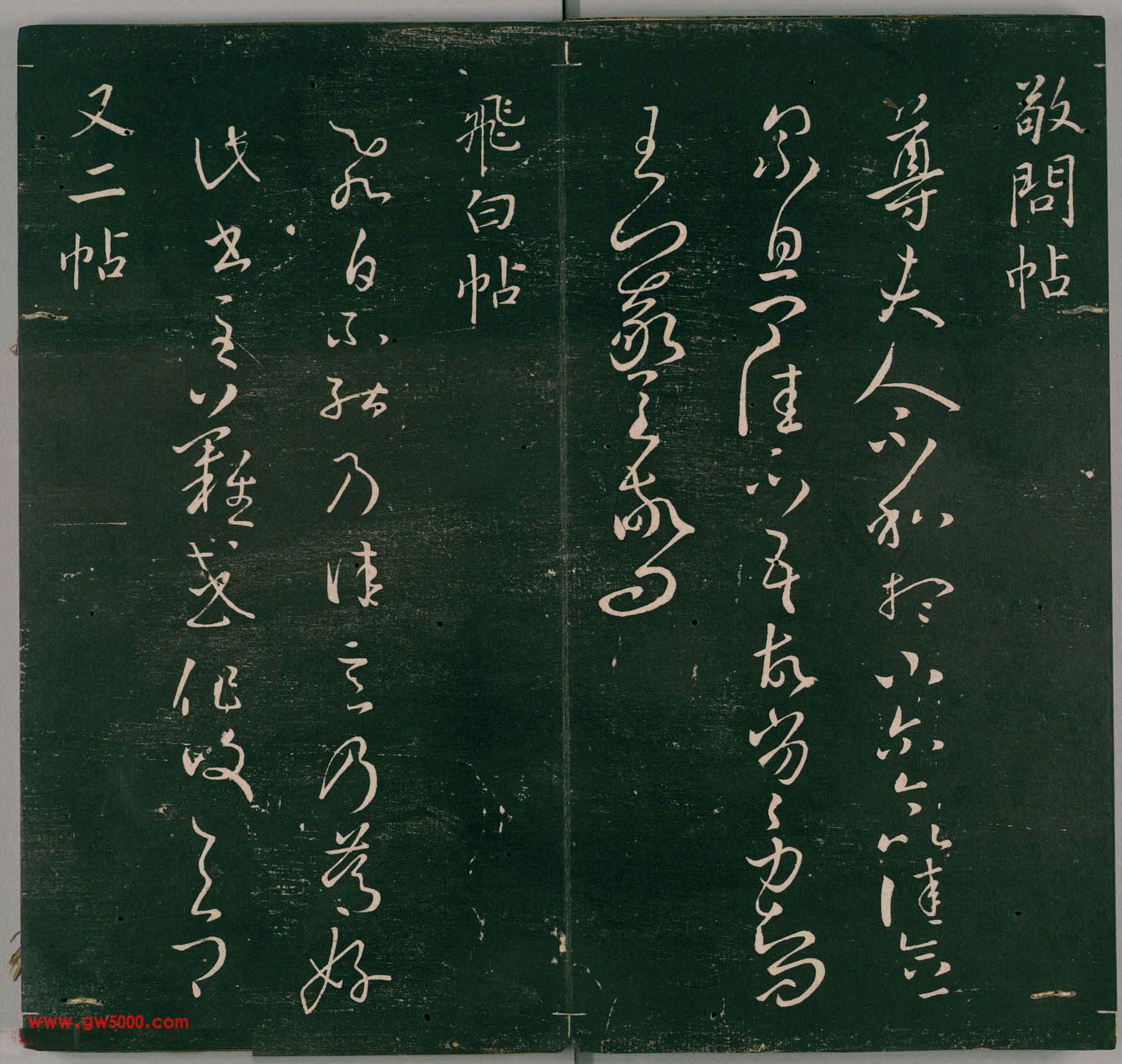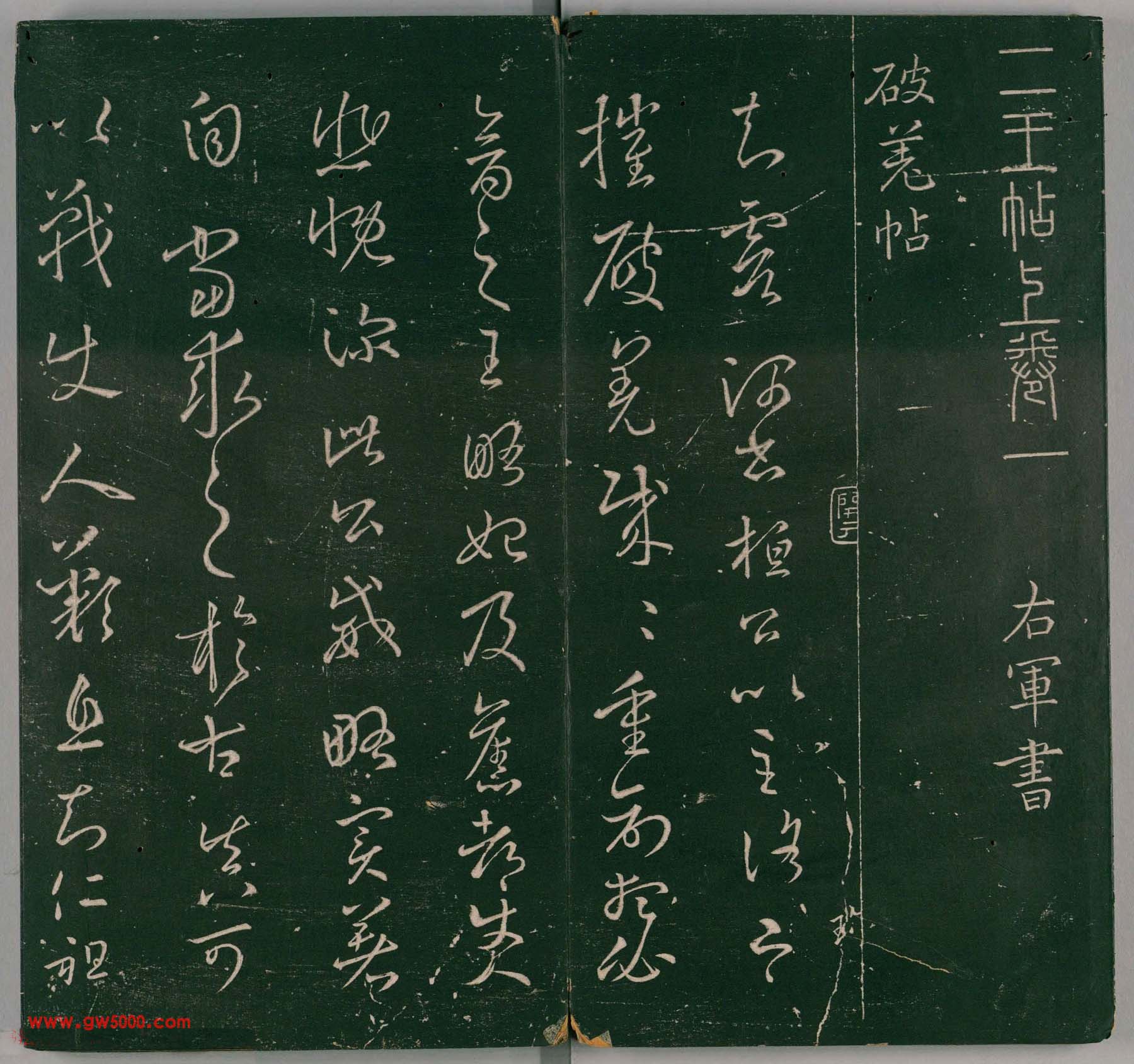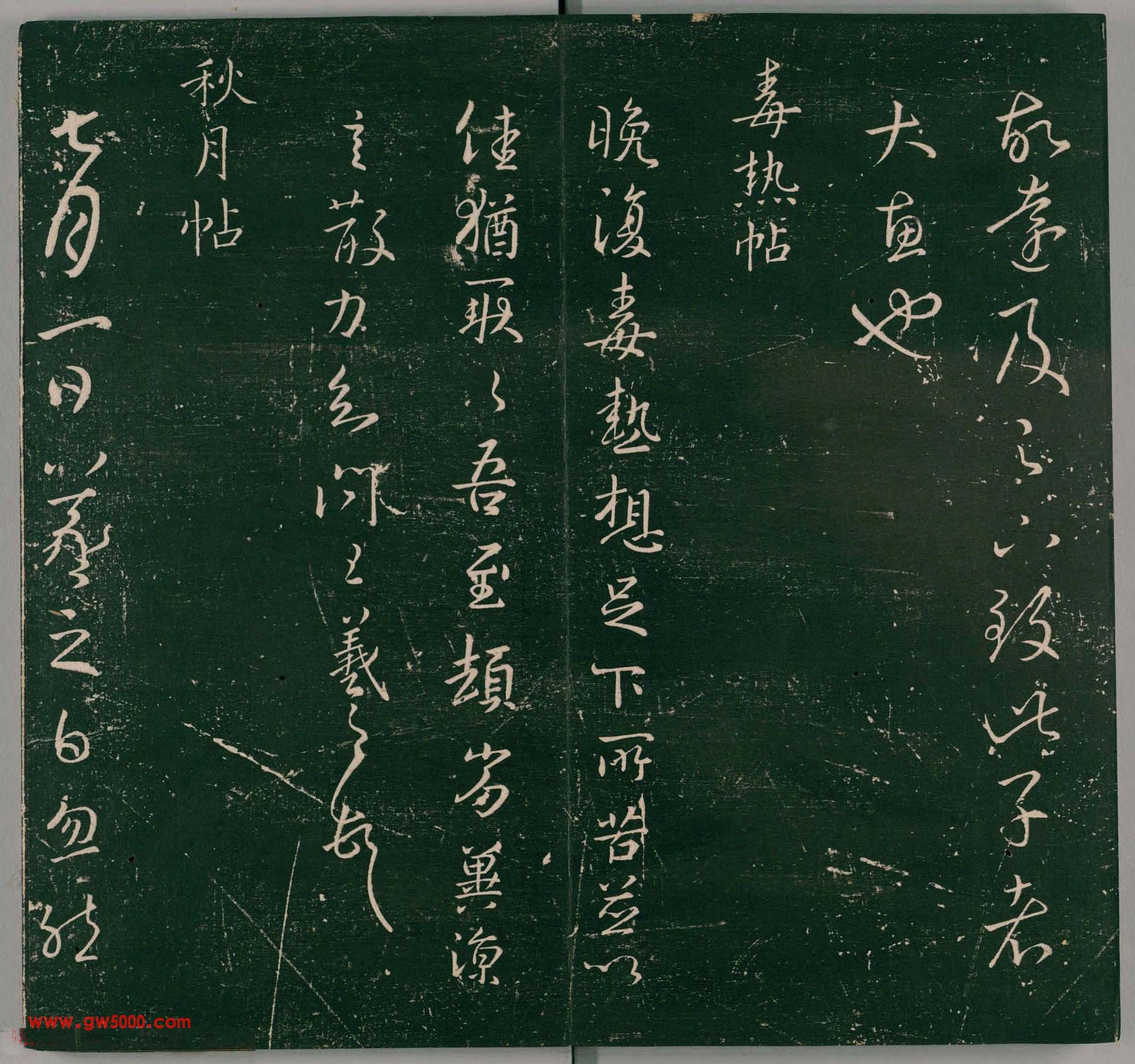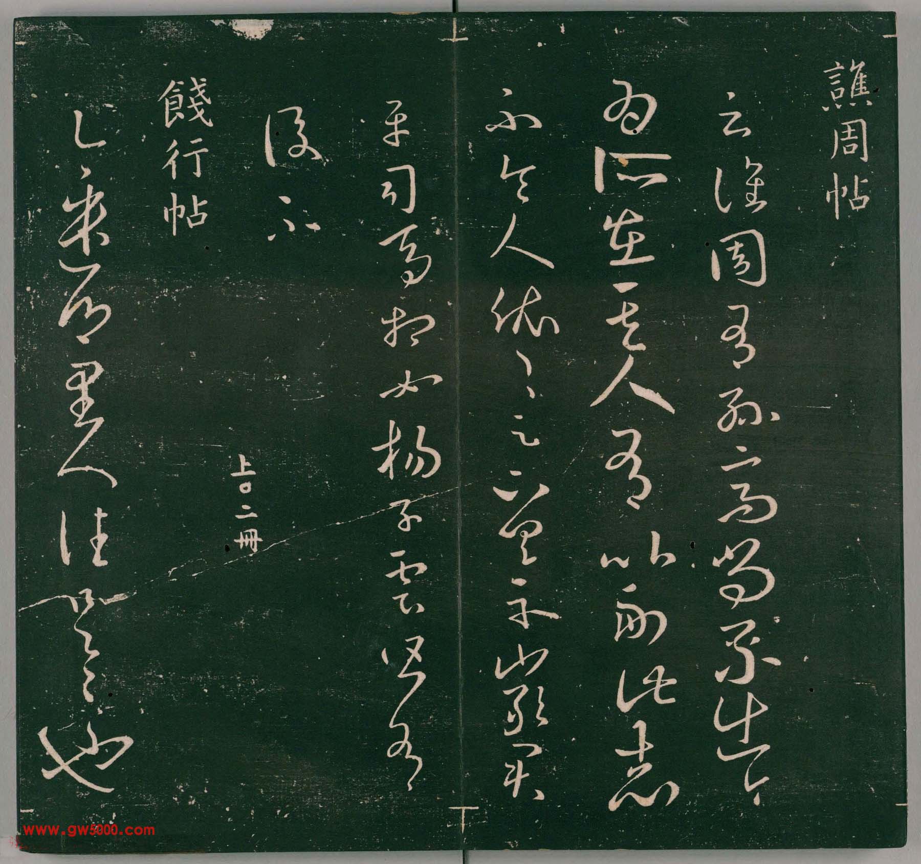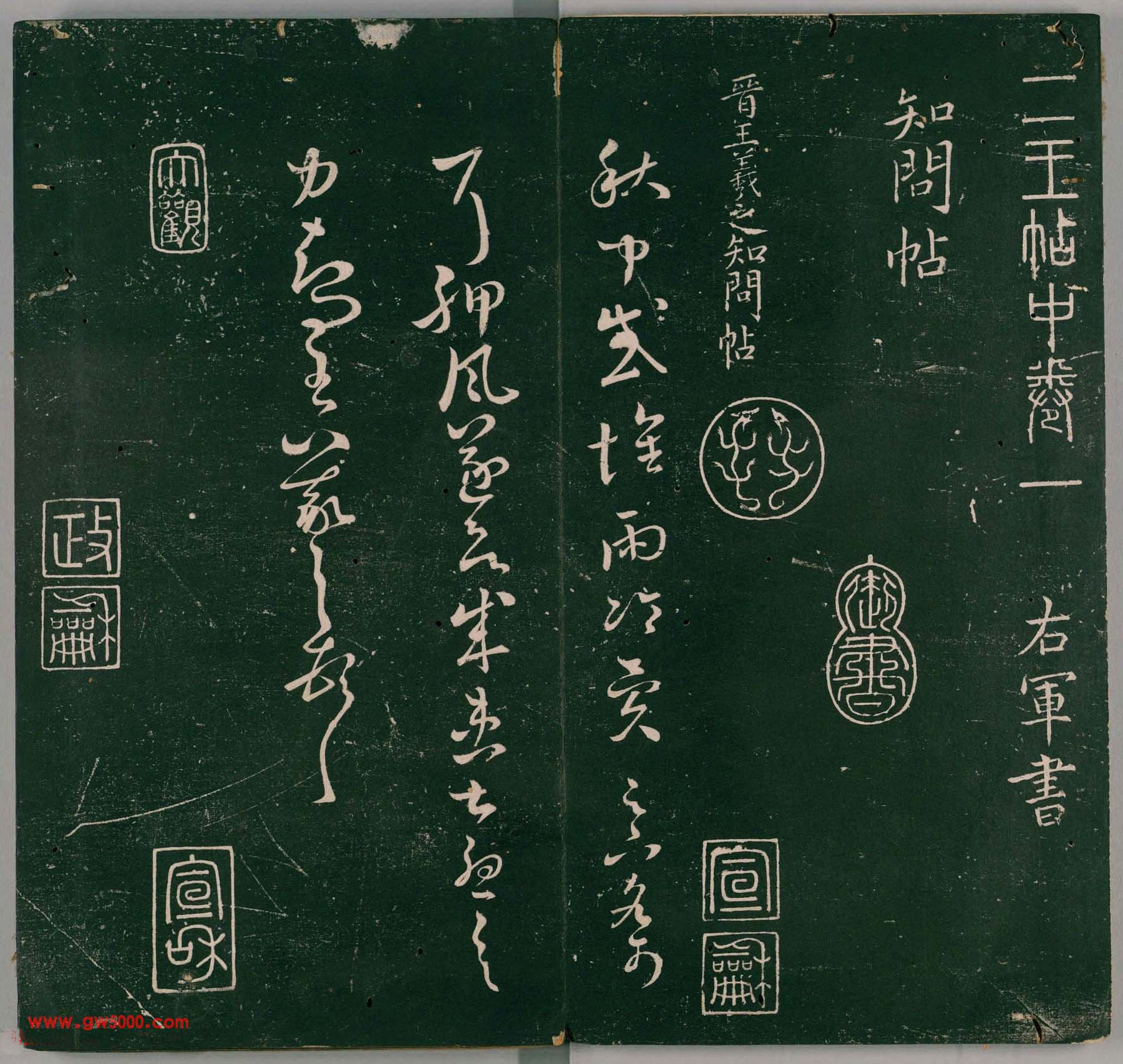 二王像:右軍(王羲之),破羌帖,成都城池帖,此郡帖,清晏帖,講堂帖,都邑帖,七十帖,兒女帖,諸從帖,宰相安和帖,昨見君歡帖,谯周帖,餞行帖,蔡家賓至帖,極寒帖,玉潤帖,積雪凝寒帖,來禽帖,毒熱帖,秋月帖,霜寒帖