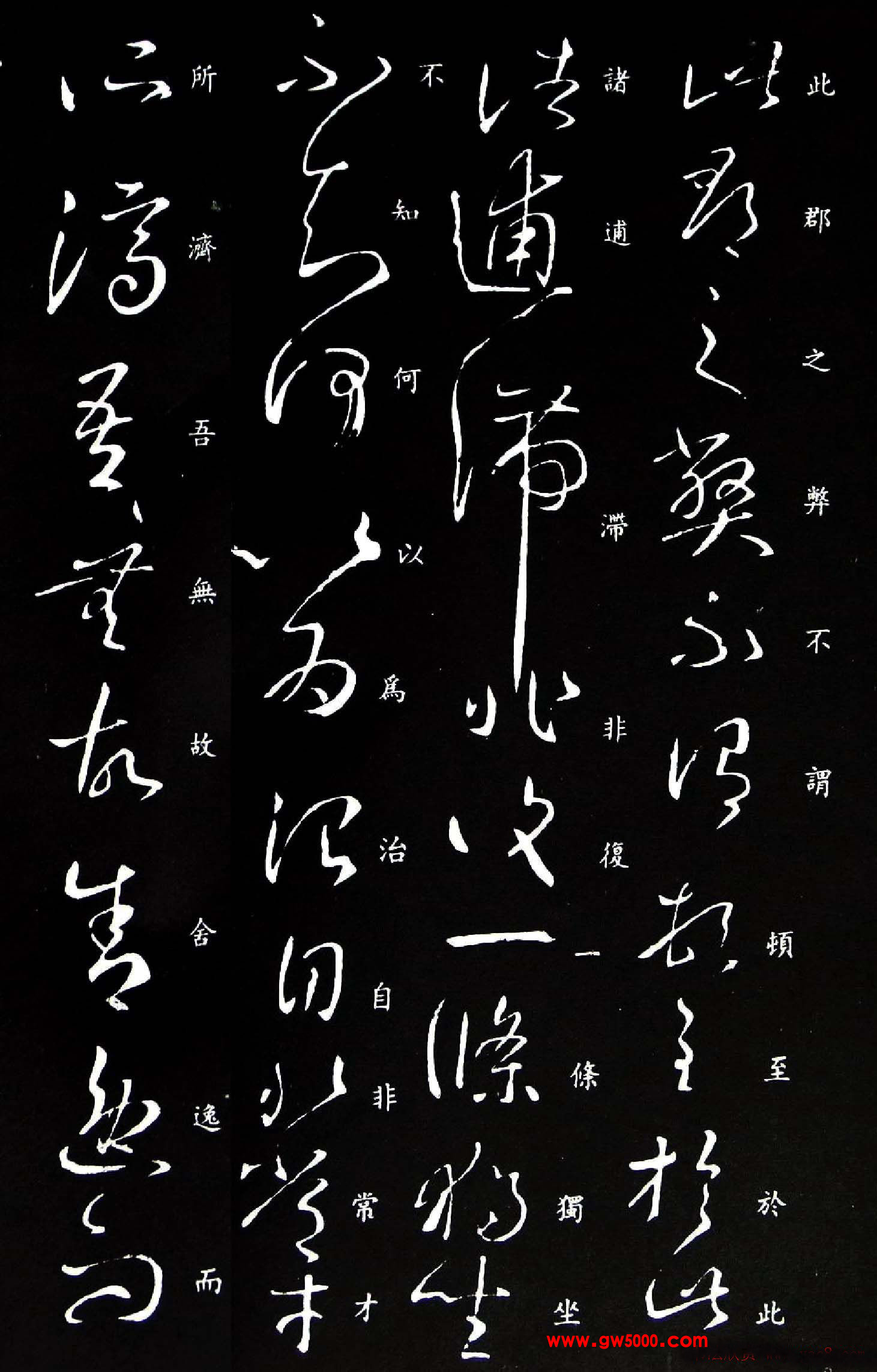 东晋王羲之草书书法欣赏《此郡帖》五种拓本,8行,66字。帖文的内容,是向人诉说王羲之所在会稽郡之弊,谈及拖欠了上交的赋税,称无力解决这样的问题。“舍逸而就劳,叹恨无所复及耳”,透露出王羲之厌於仕途的心境。据此,书写这通尺牍时,王羲之尚在会稽内史任上。第二行末“独坐”者,《淳化阁帖》、卷八有《独坐帖》。所谓独座,指专席而坐,犹言骄贵无偶。此是对某一地方的最高长官的代称。“逋滞”者,犹拖欠,指拖欠朝廷徵纳的赋税。