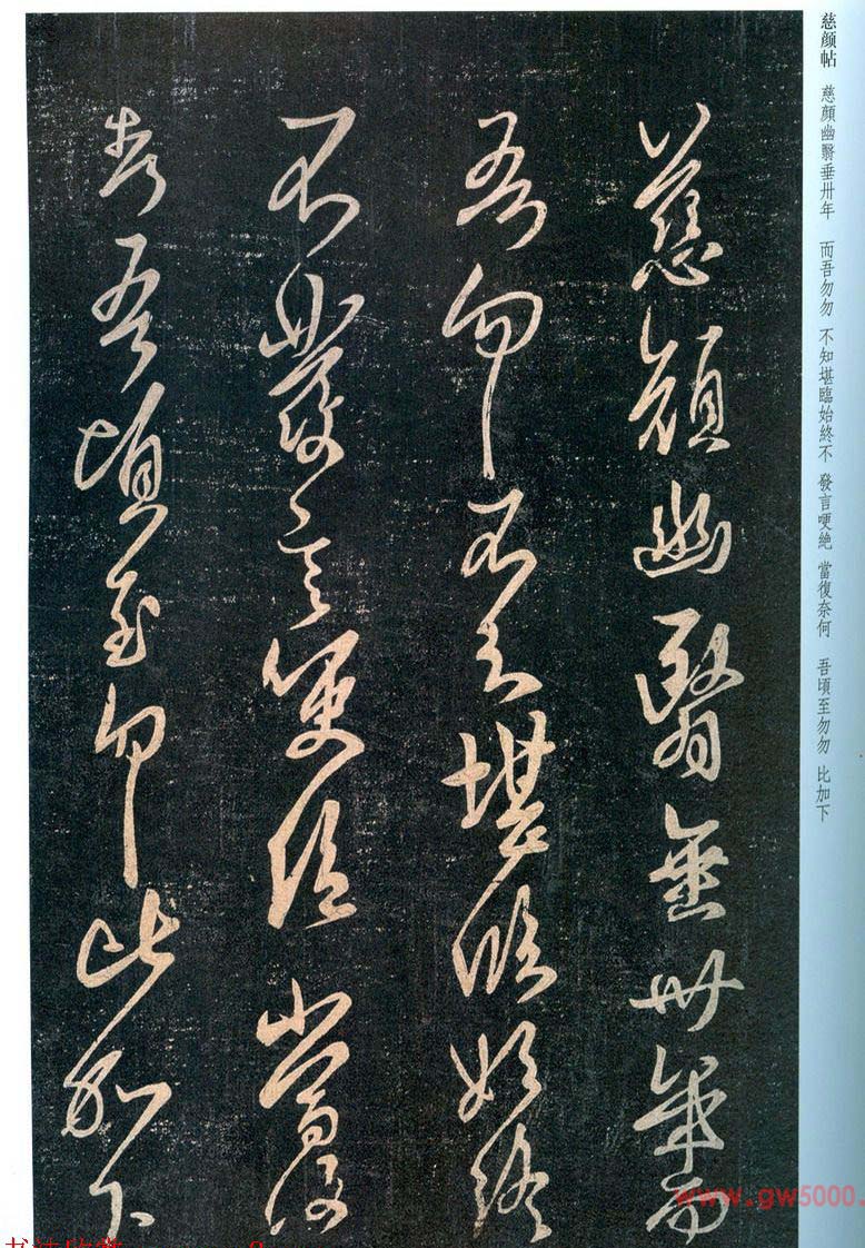 王羲之行草书法《慈颜幽翳帖》,4行,34字。此帖被米芾、黄伯思、王澍三家辨为伪帖。王澍以为此帖与《靈柩帖》“筆法正同”,并指:“首行猶謹嚴,後則怒張之至,脚手盡露矣。其偽不疑!”《大观》、《淳化》收刻。