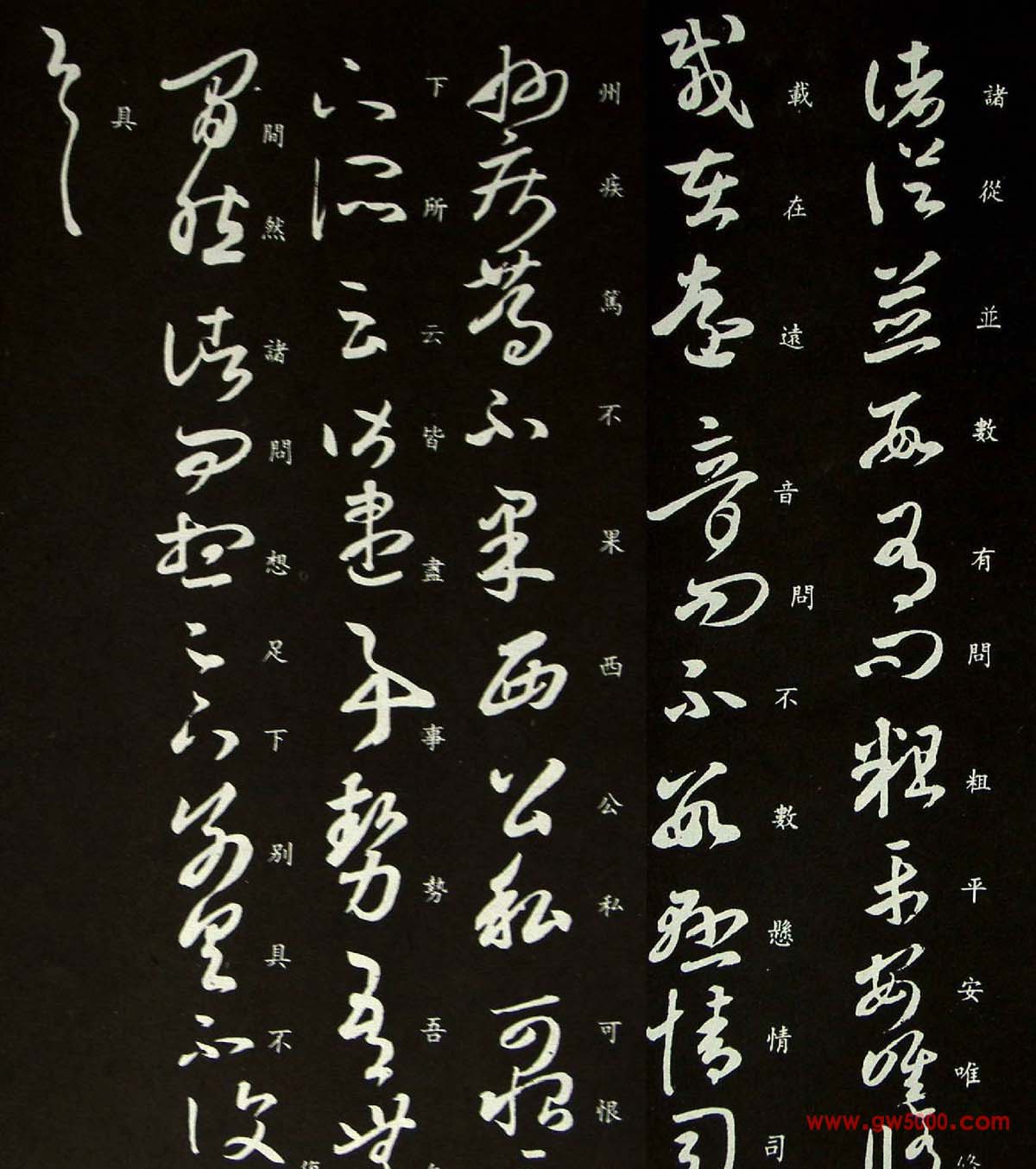 王羲之草书欣赏《诸从帖》三种,54字。《十七帖》第二十二通尺牍。“诸从”,古代同一宗族次於至亲者称“从”,如从父、从兄、从子等,此帖是指王羲之的各位从兄弟,即羲之从父王廙、王彬诸子,非指父辈或子辈。“修载”即王耆之,羲之伯父王廙第三子,历中书郎、鄱阳太守、给事中。帖中既云其“在远”,当指耆之在鄱阳太守任上,当时他与王羲之讯问稀疏,羲之所谓“悬情”,即惦念的意思。“司州”是王胡之(修龄)的别称,他弱冠有声誉,历郡守、侍中、丹阳尹。永和十二年(三五六)代谢尚为司州都督,未行而卒。帖中言及王胡之病重,不能西往司州赴任,於公於私都是一件遗憾的事情,《司州帖》中亦有这样的记载。这与史籍所载相符。可以确定此帖写於永和十二年(三五六)。