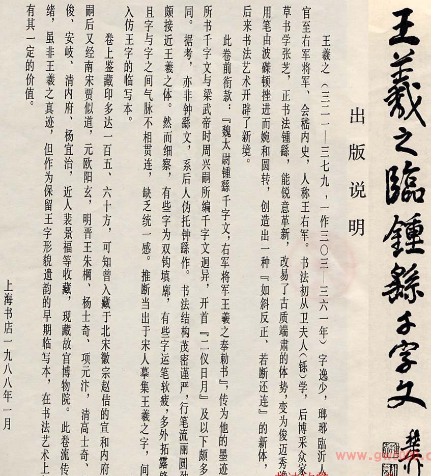 晋王羲之行书墨迹摹临钟繇千字文(传),谢稚柳题签,上海书店一九八八年一月。
