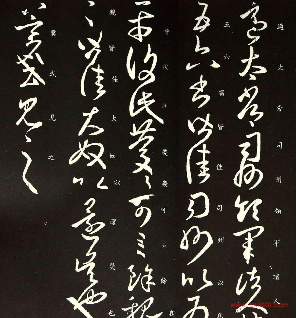 王羲之草书欣赏《适太常帖》版本七种;又名《太常司州帖》5行,41字。《右年书记》著录。入刻《淳化阁帖》等。 释文:适太常、司州、领军诸人廿五、六书,皆佳。司州以为平复,此庆庆可言。余亲亲皆佳。大奴以还吴也,冀或见之。(《右军书记》‘庆庆’为‘庆之’)