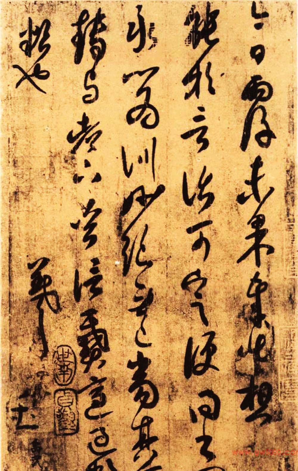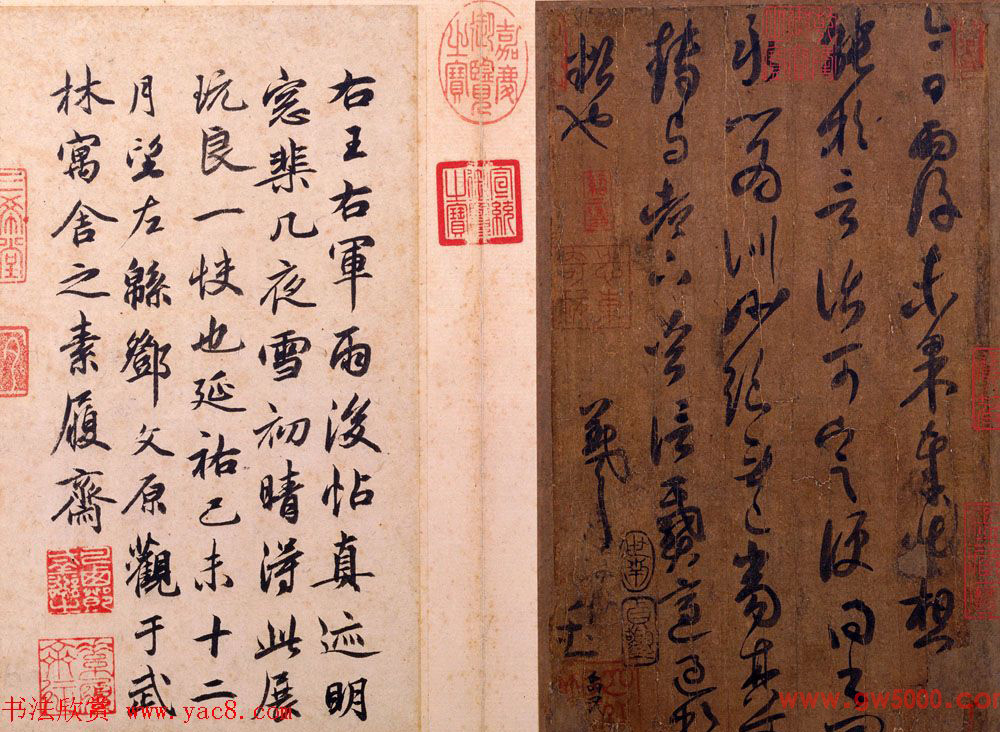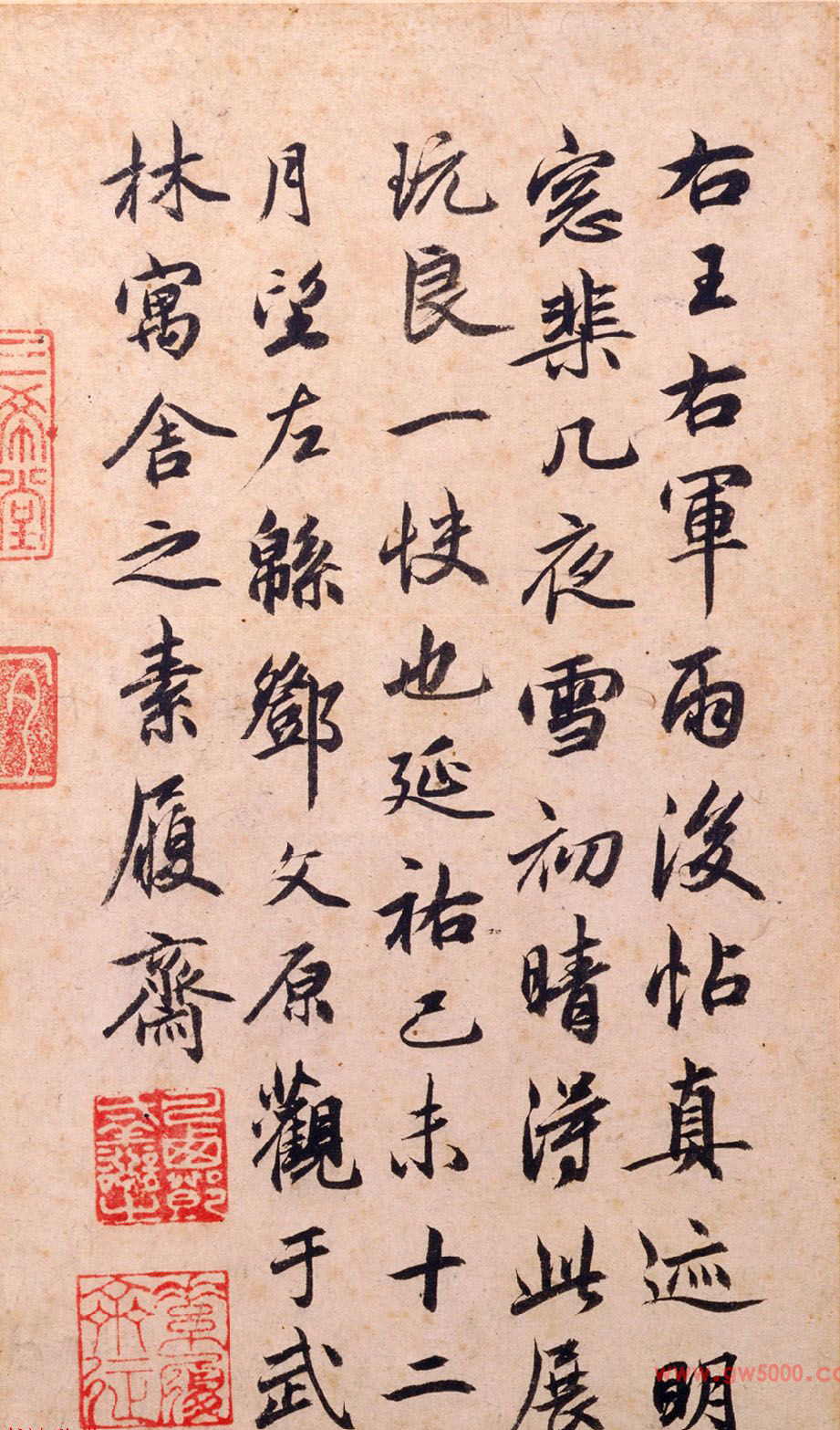 王羲之《雨后帖》,25.7×14.9厘米,北京故宫博物院藏。该帖为五行草书尺牍,末款“羲之”,铃有“世南”、“贞观”二墨印,又有“志东奇玩”、“四代相印”、“绍兴”小玺及清内府请藏印。所以鉴为伪书,一是此帖不见于古刻丛帖中,又没有元以前的题识、记载。清初吴其贞《书画记》说此帖:“书法有沉重古雅之气,其纸色是墨水所染者,以为伪物。”安歧《墨缘汇观》以为是“唐模”。以书法论,运笔流滑,结构松懈,虽水平不高,但笔法显示出的转折、顿挫自然,是临写,而非钩摹。纸色深褐,颜色呆滞不自然,如吴其贞所言是染旧。二是帖的书纸,经有关专家鉴定,是竹纸,即北宋中期以后才能制造的纸张。三是帖上所铃藏印,细审“世南”、“贞观”两个唐代墨印,都是墨笔画出的;北宋苏辙的“志东奇玩”、“四代相印”,经比较为伪印;只有南宋“绍兴”小玺为真印。综合这几方面的考鉴,该帖的上限约在北宋末期,是以临写的方法伪做出的名人书迹。