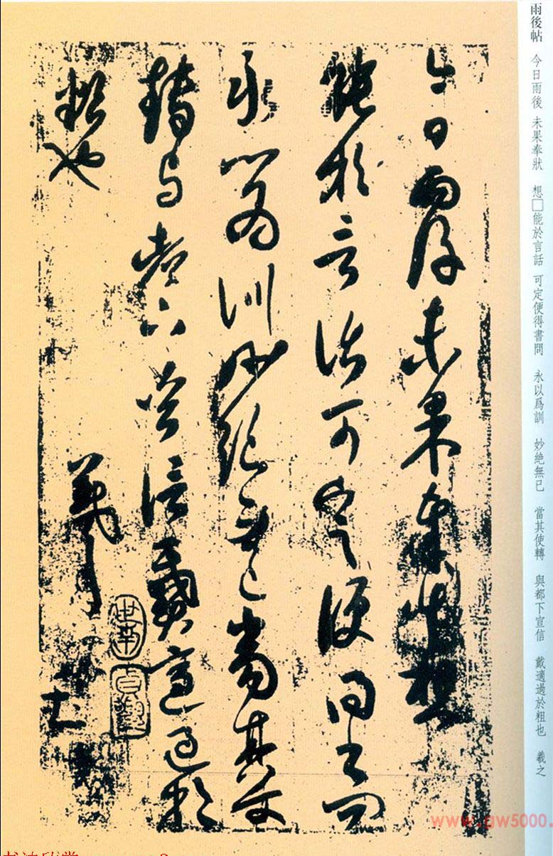 释文:今日雨后未果奉状,想□能于言话,可定便得书问,永以为训。妙绝无已,当其使转。与都下□信,戴适过于□也。羲之。