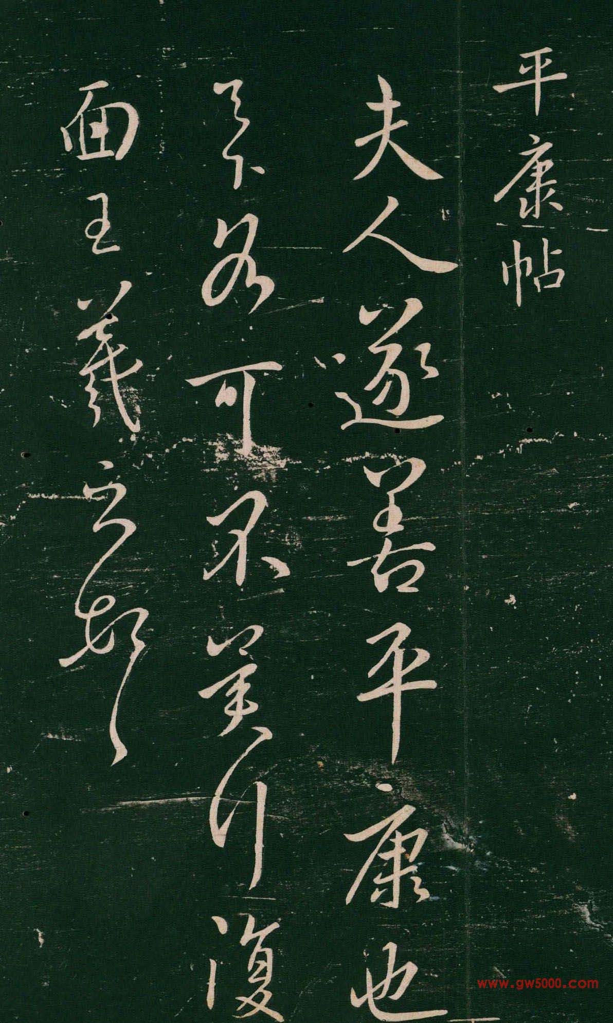 王羲之行书《平康帖》(传)6行,3行,21字。被米芾、黄伯思、王澍三家辨为伪帖。此帖虽疑为伪帖,但“風力遒厚、雅有正骨”(王澍语),可能是右軍自会稽還後,代書人所书。收刻於于《大观帖》、《绛帖》、《淳化阁帖》。