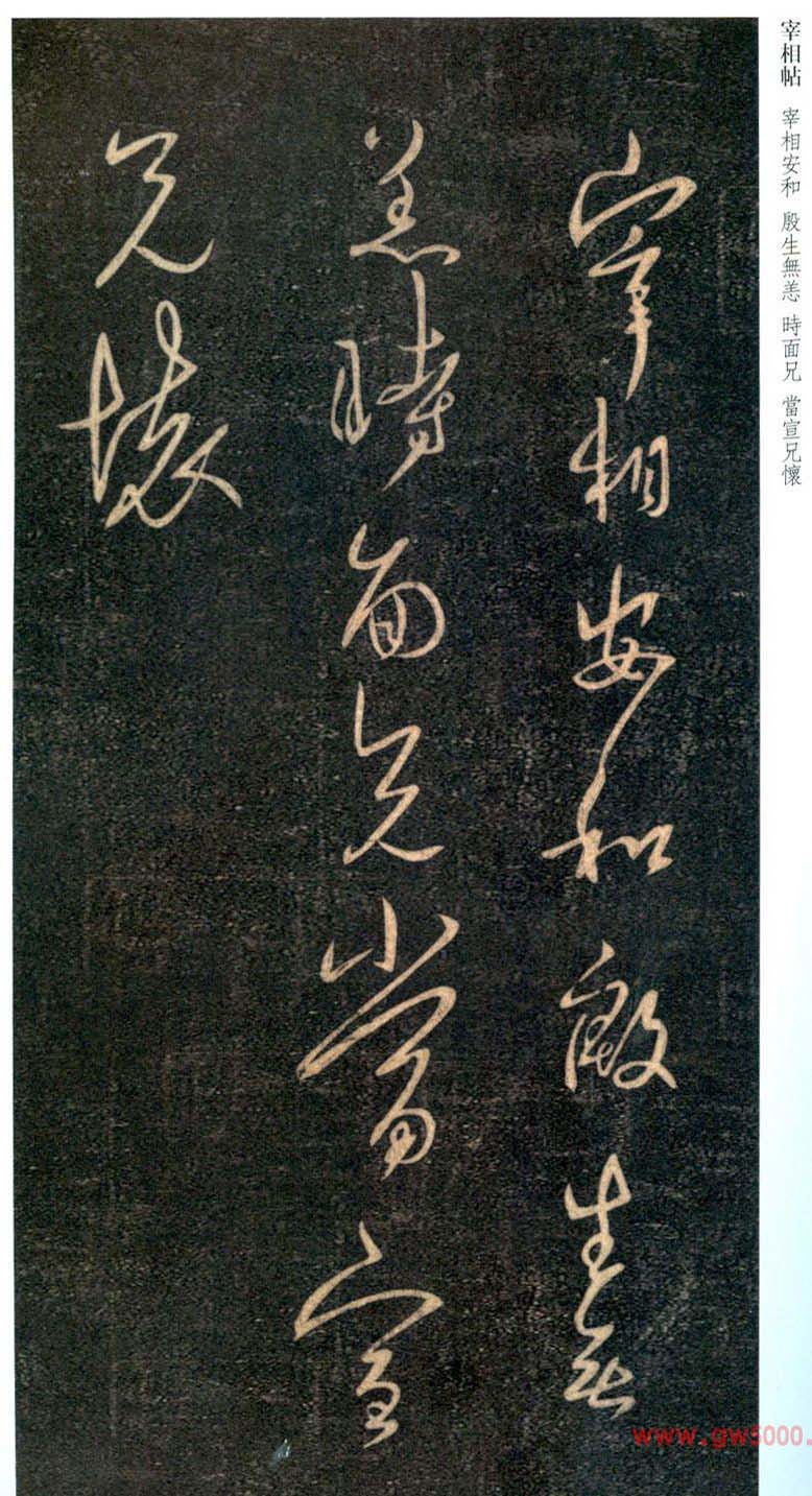 王羲之行草书《宰相帖》又名《宰相安和帖》,3行,15字。被米芾、黄伯思、王澍三家断为伪帖。黄伯思《法帖刋誤》卷下云:“或云此帖乃郗愔書。‘宰相’者,簡文帝作相王時也;‘殷生’者,殷浩也。然此或是書愔語耳,而結字實近世人偽作。愔書自與逸少早年抗衡,此帖了無晉韻,其非審矣。” 此帖收刻於《大观帖》、《绛帖》、《淳化阁帖》。