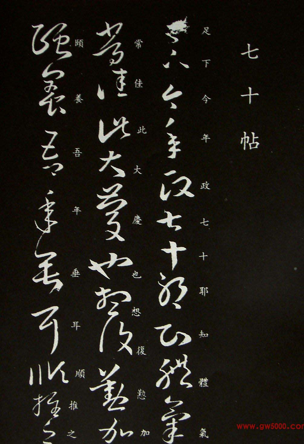 王羲之草书作品欣赏《七十帖》 9 行,82字。《宣和书谱》有此帖目。入刻《十七帖》等。 释文:足下今年政七十耶。知体气常佳,此大庆也。想复勤加颐养。吾年垂耳顺,推之人理,得尔以为厚幸,但恐前路转欲逼耳。以尔要欲一游目汶领,非复常言。足下但当保护,以俟此期,勿谓虚言。得果此缘,一段奇事也。