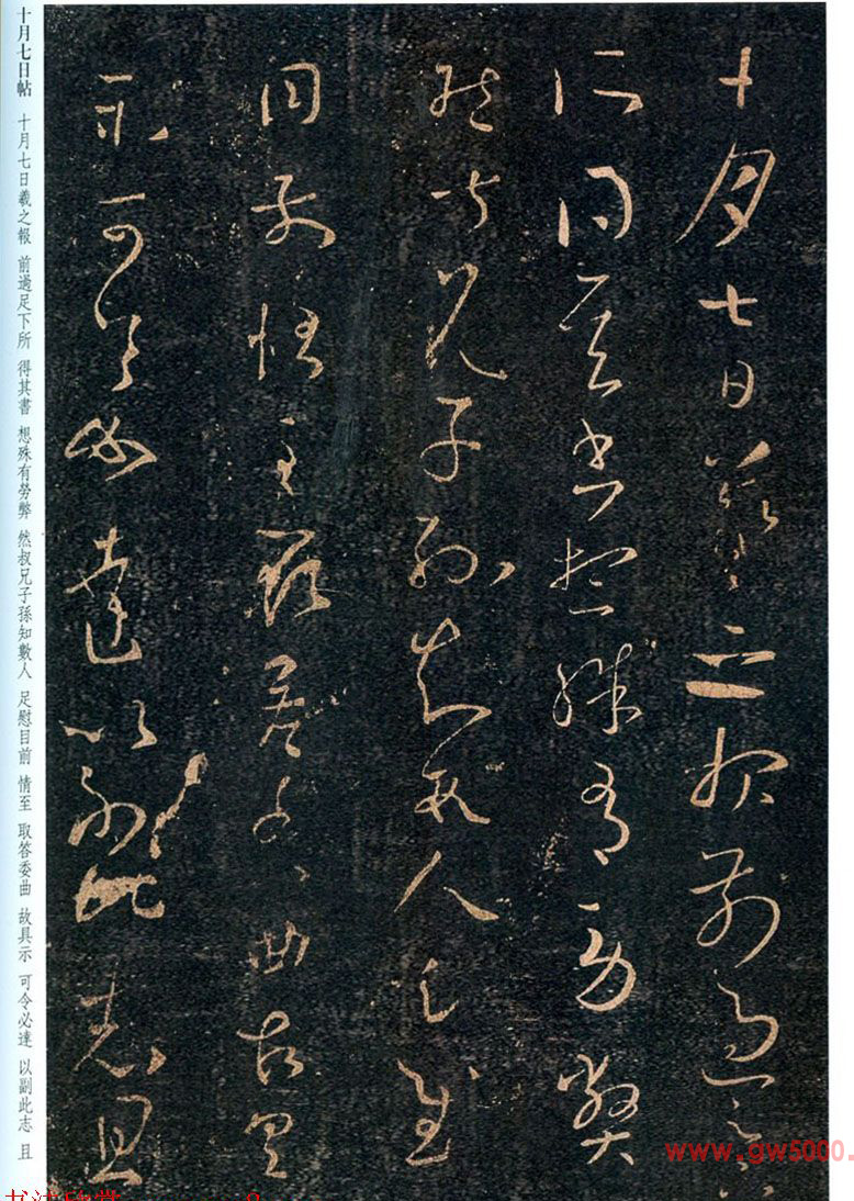 释文:十月七日羲之报:前过足下所,得其书,想殊有劳弊。然叔兄子孙有数人,足慰目前。情至取答委曲,故具示。可令必达,以副此志。且山川甚有形势,远想慨然。又出药精,要有验。信比可致,当大惠也。从弟分别,吾深忧虑。卿女轲,想何可处?差充熹言不多耳。羲之。
