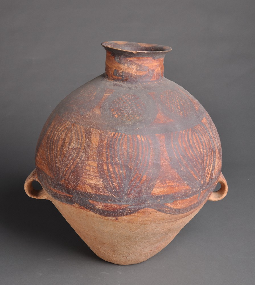 新石器时代马家窑文化马厂类型贝叶纹彩陶罐,口径12.9cm,高41.3cm,重5800.0g,泥质黄陶,罩红色陶衣。侈口,短直径(颈),丰肩,弧腹下斜收,平底。肩腹连接处有对称双耳。器外壁主体纹饰为贝叶纹。