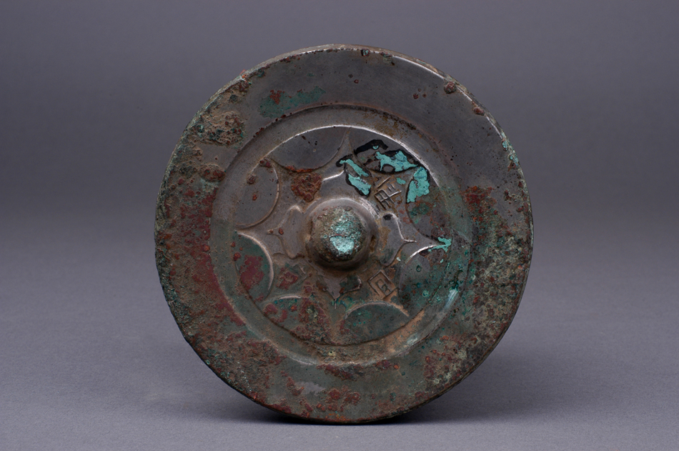 圆形,圆钮,柿蒂形四叶纹钮座,叶纹间饰铭文“君宜高官”,字形长方,笔画方折,粗细一致,字体为小篆,其外为内向八连弧纹,连弧较大且之间均有空隙,平宽素缘。